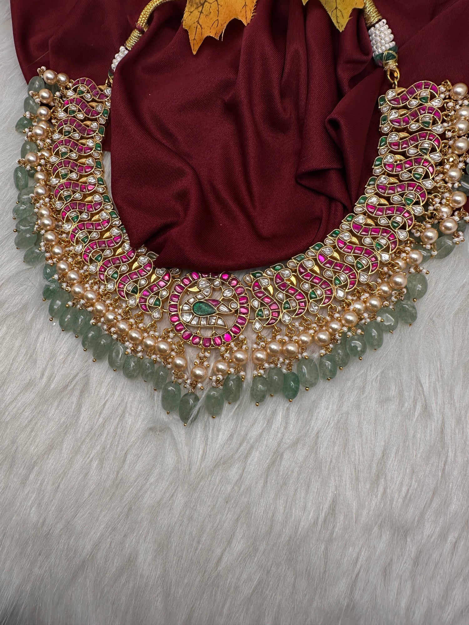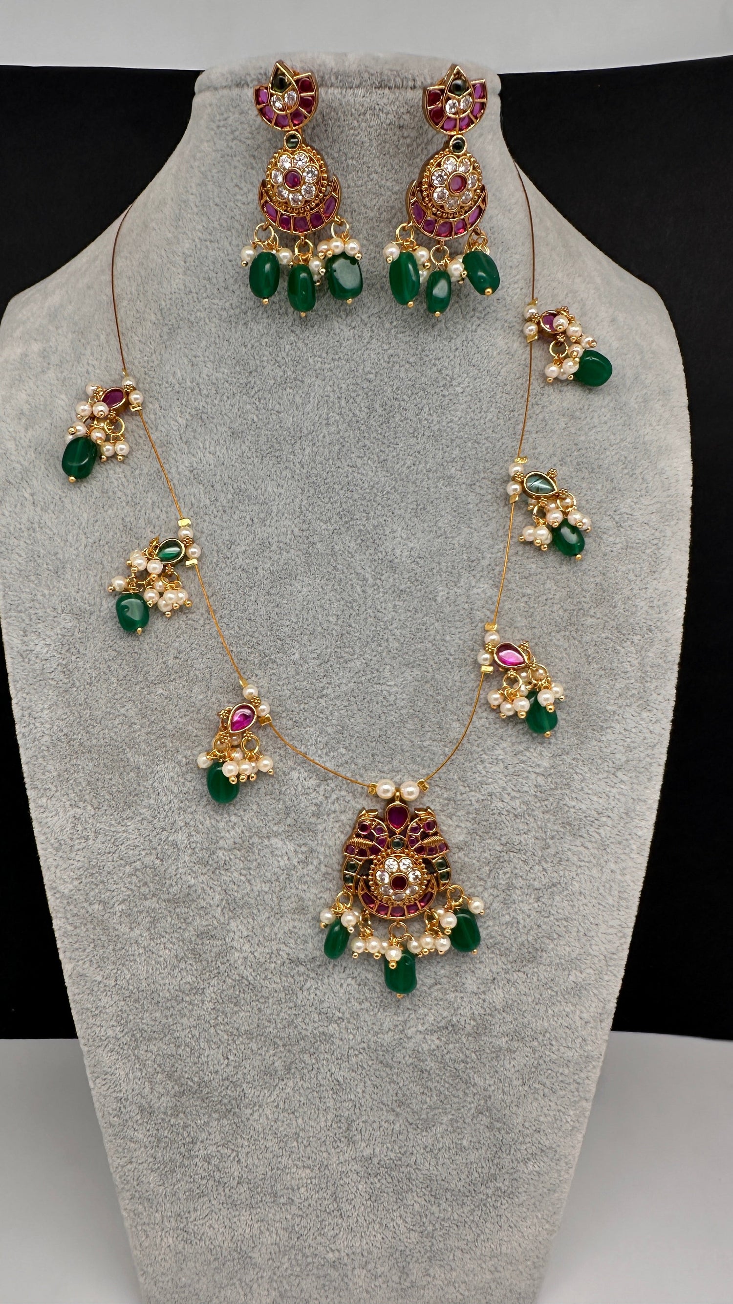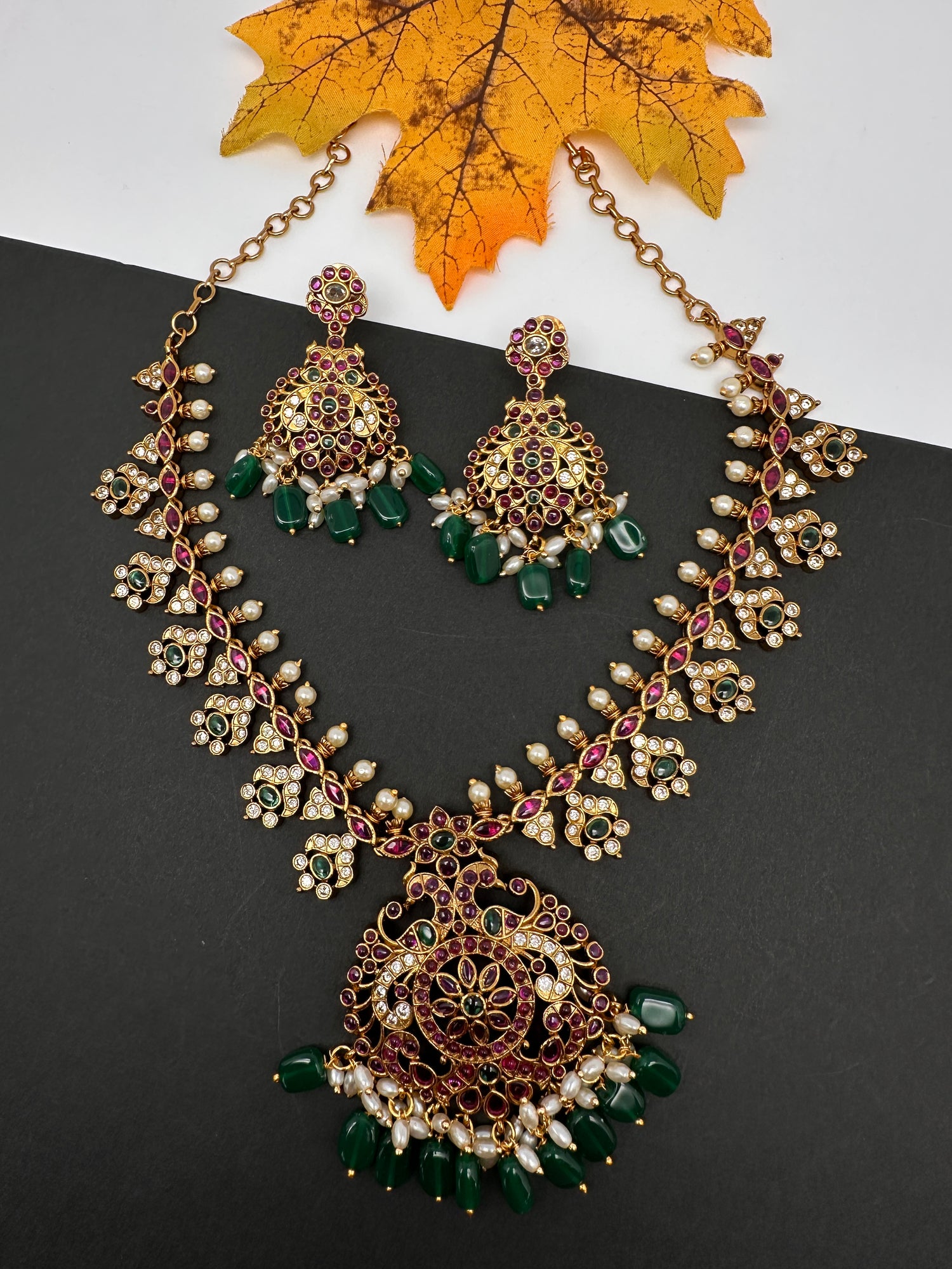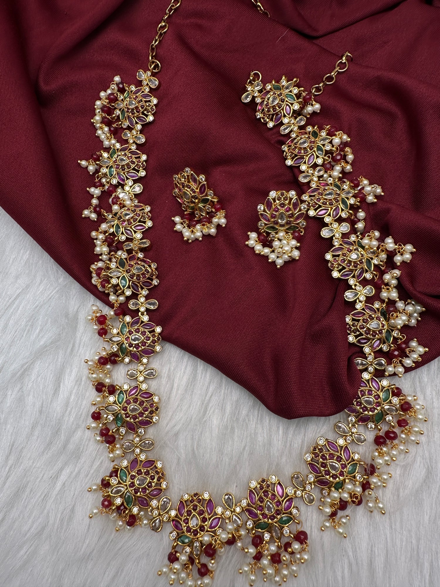 Kundan Red Green Stone Bridal Necklace comes with Earrings and Mang Tika