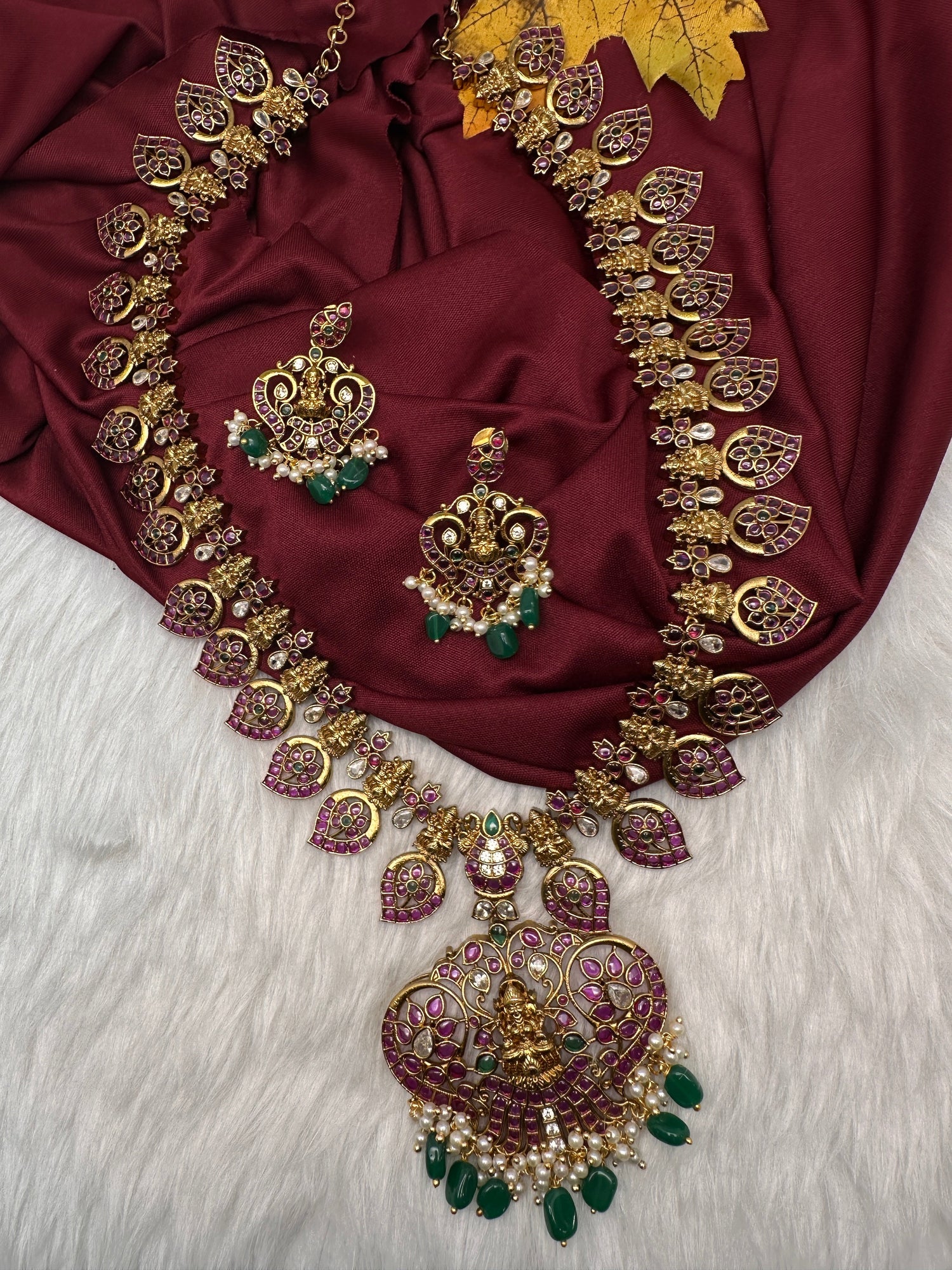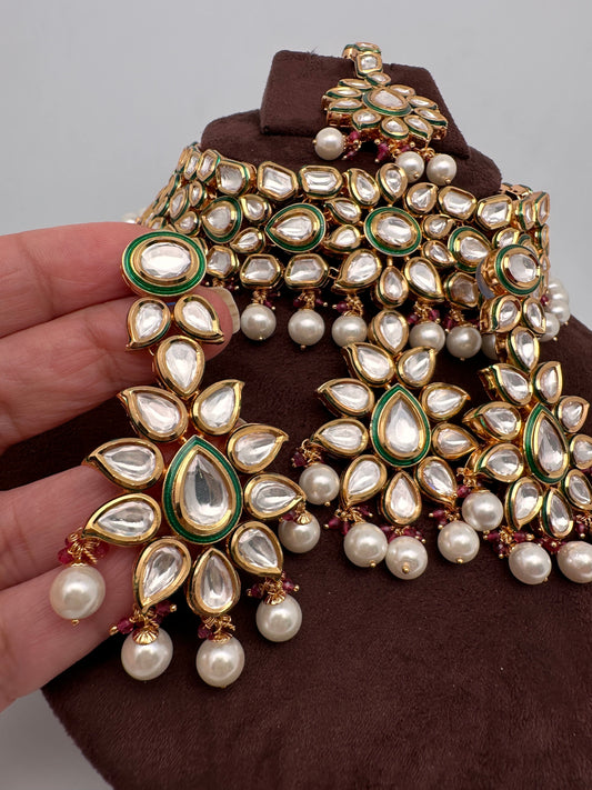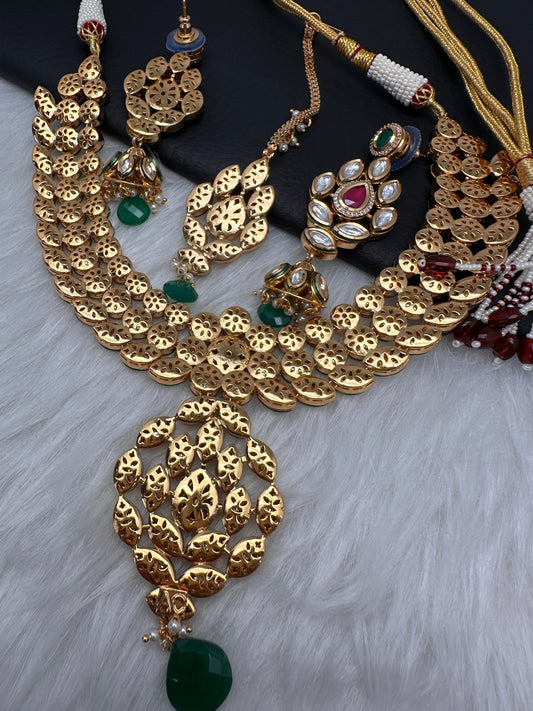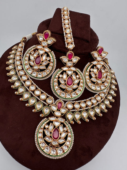 Kundan Red Green Stone Bridal Necklace comes with Earrings and Mang Tika