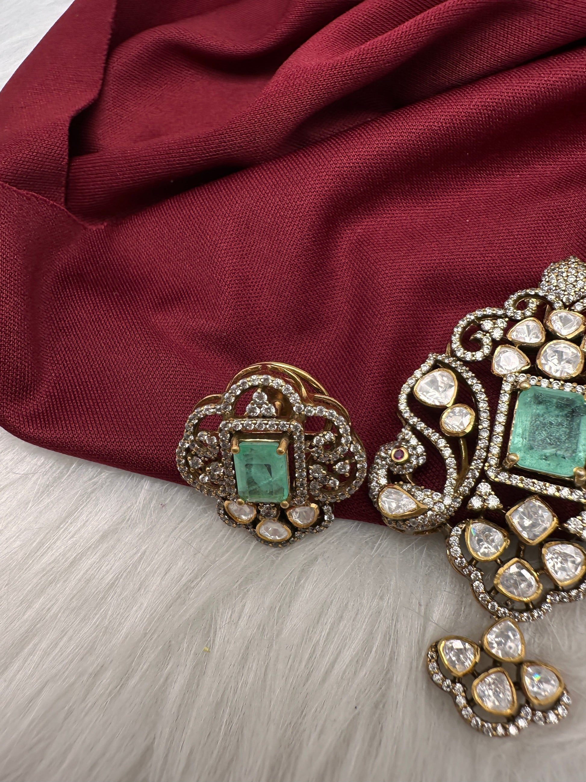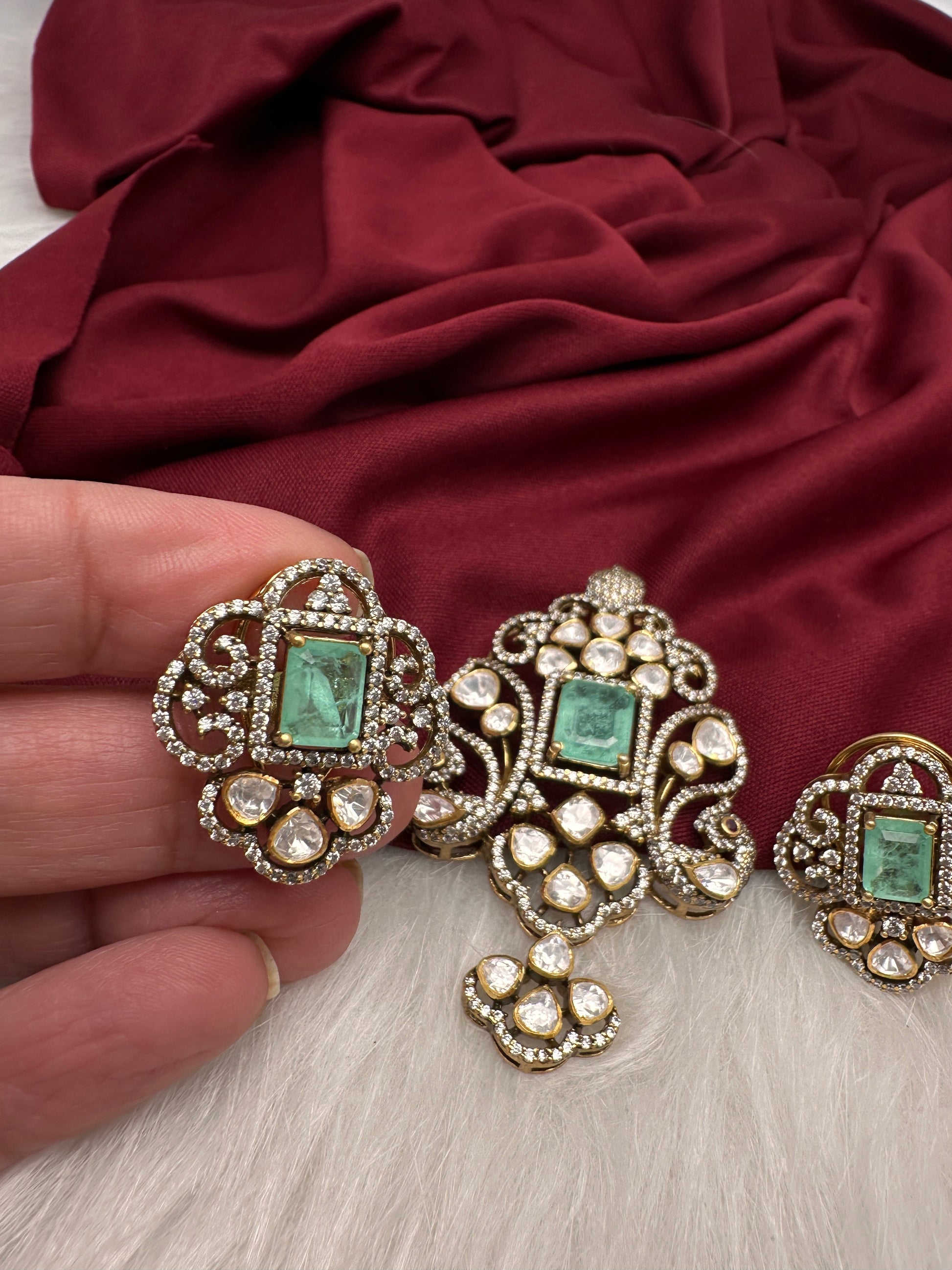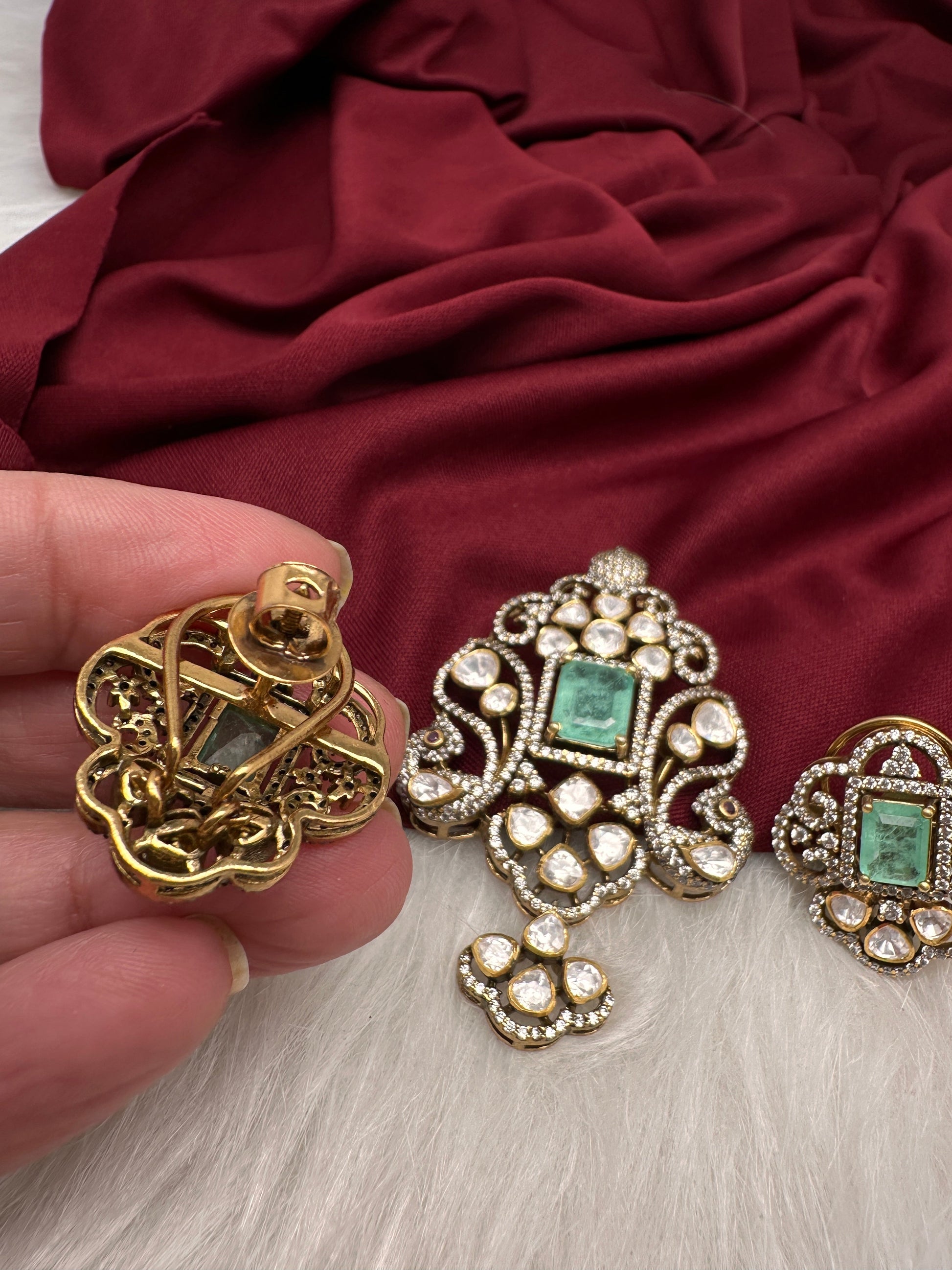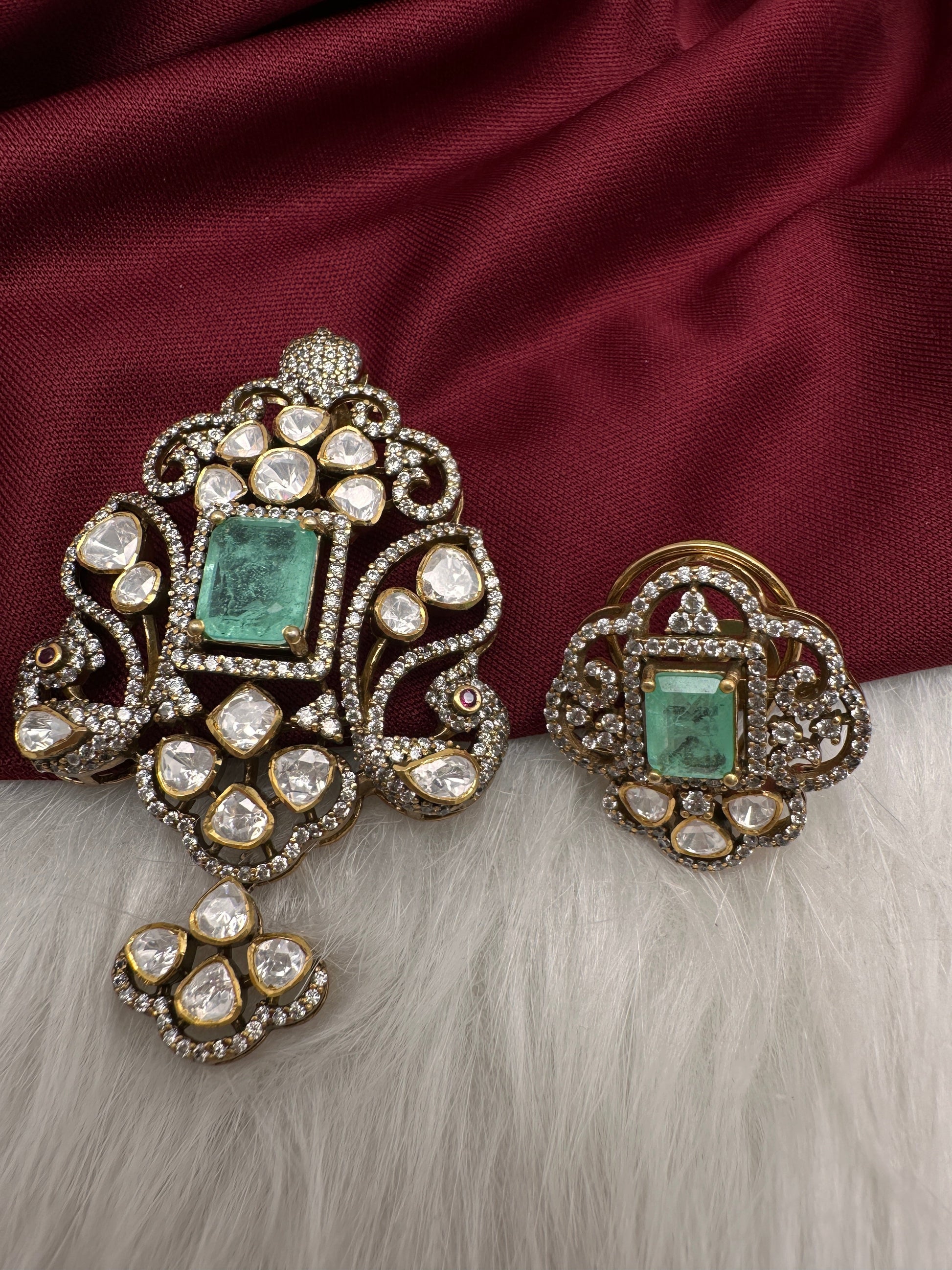 92.5 Silver Green Moissanite Pendent Set with Matching EarringsColor : GoldenSize : Pendnet : 2.5 Inches; Earrings : 1 Inches Silver Weight : 29 gramsStones : CZ Moissanite Ruby Stone Pearls Emerald Beads