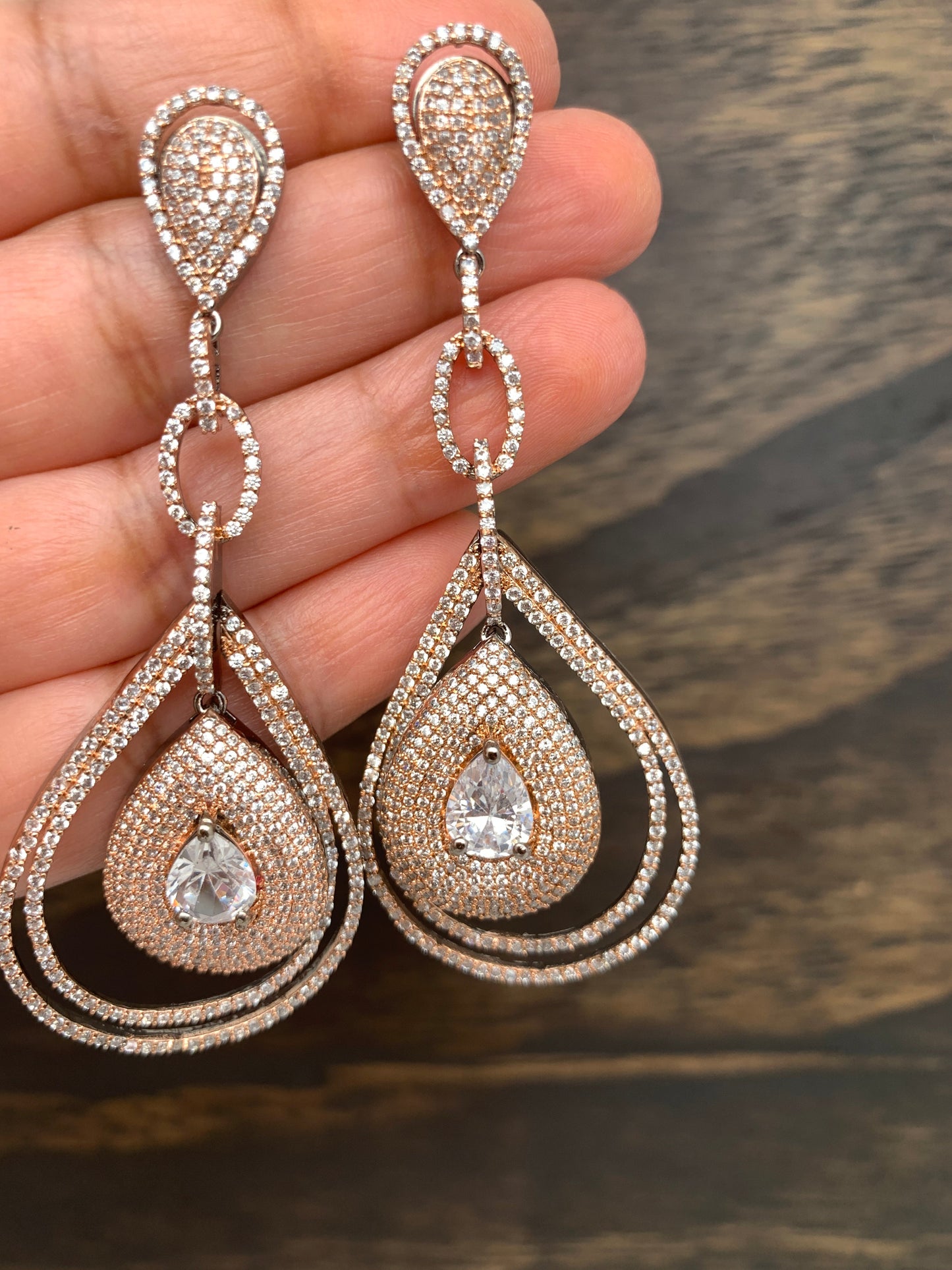 AD Earrings in Victorian and Rose Gold PolishColor : Diamond FinishSize : Approx 3.25 Inches; Weight Approx 10 Gms EachStones : American Diamond