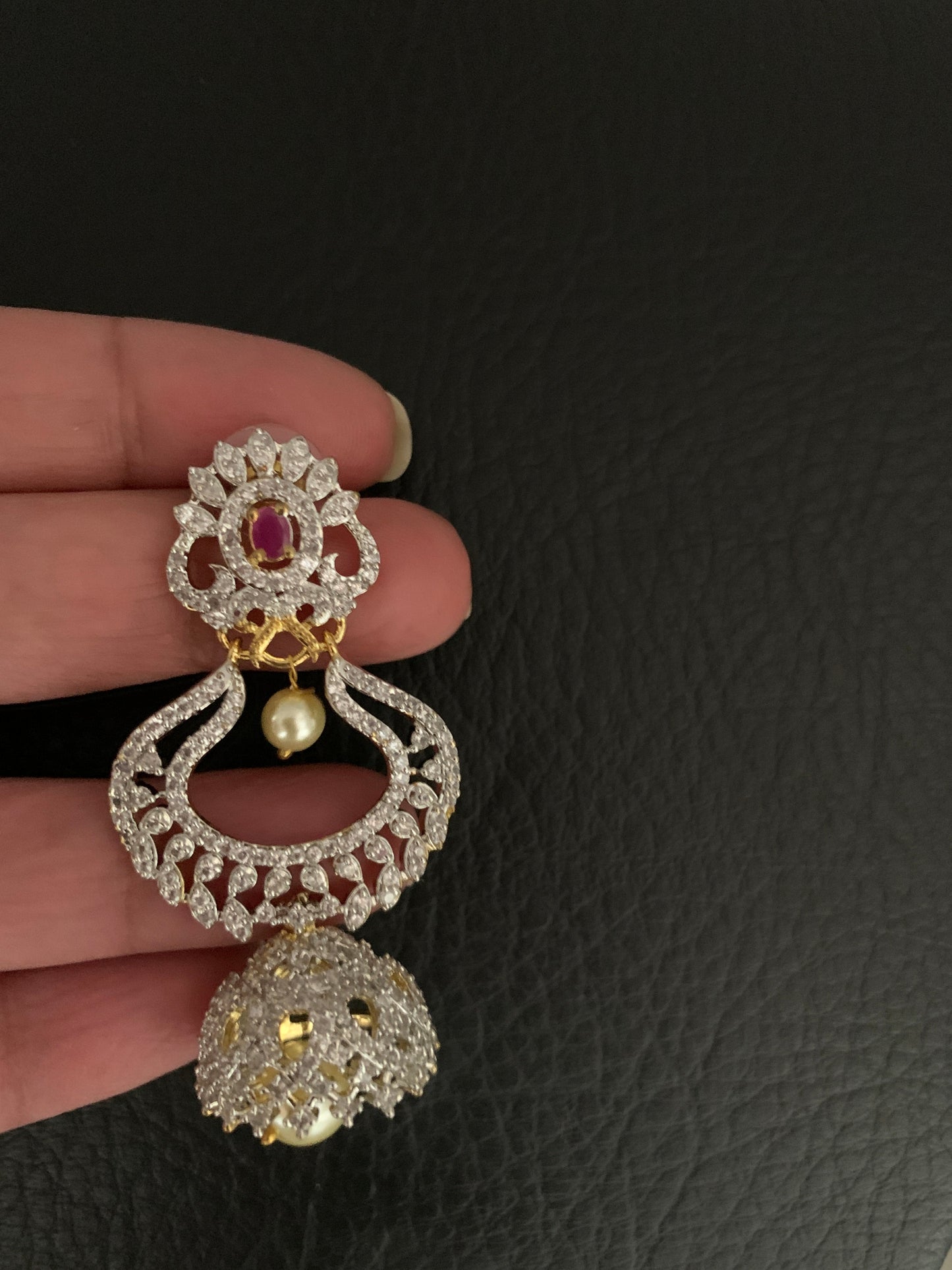 AD Ruby Red Stone EarringsColor : Golden with ADSize : Approx 2.5 Inches; Weight : Approx 10 Grams EachStones : AD Ruby Red Stone Pearls