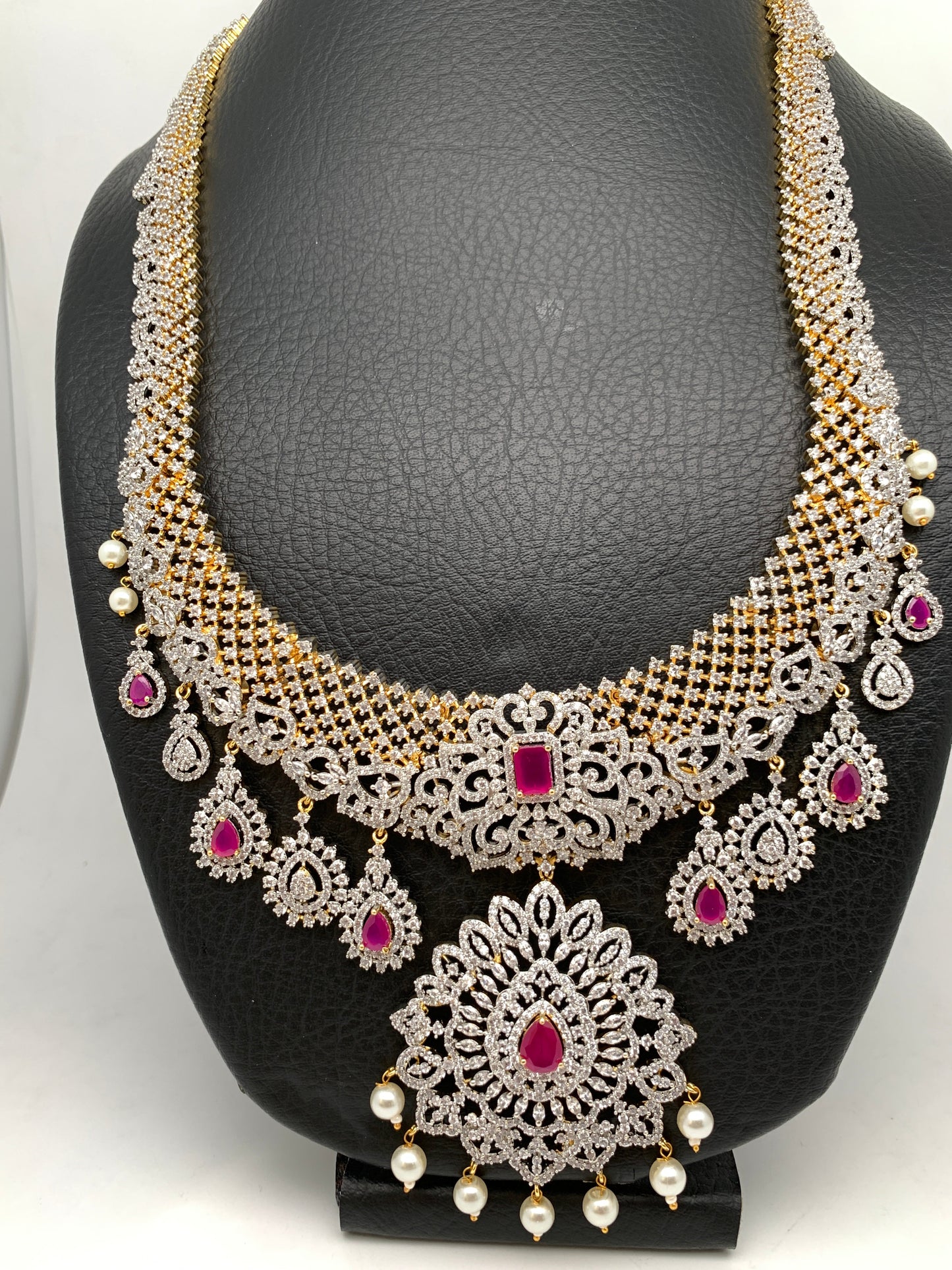 AD Ruby Red Stone Long Necklace with matching screwback earringsColor : Golden ADSize : Necklace Length : Approx 24 Inches; Earrings Length : 3.25 Inches;Stones : American Diamond Red Stone Pearls