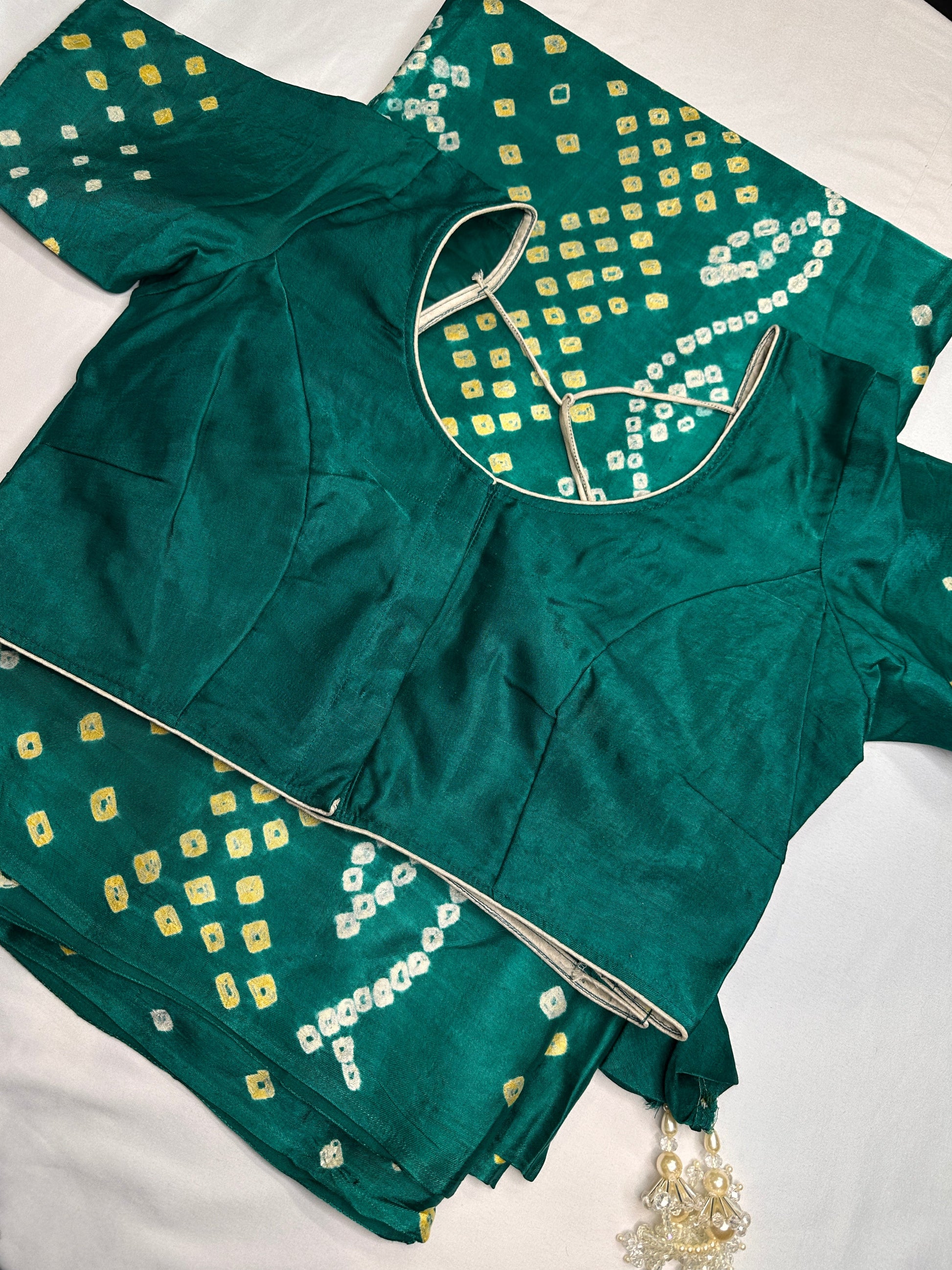 Bandhani Bhandej Green Modal Silk Saree Saree Details : Green Color Saree Green Color Pallu Fall and Pico done Blouse Details : Green Blouse Size 38 and has margin to go up to Size 44; Sleeves Length : 7 Inches: Blouse Length : 15 Inches; Front Neck : 7.5Inches; Back Neck : 10 Inches