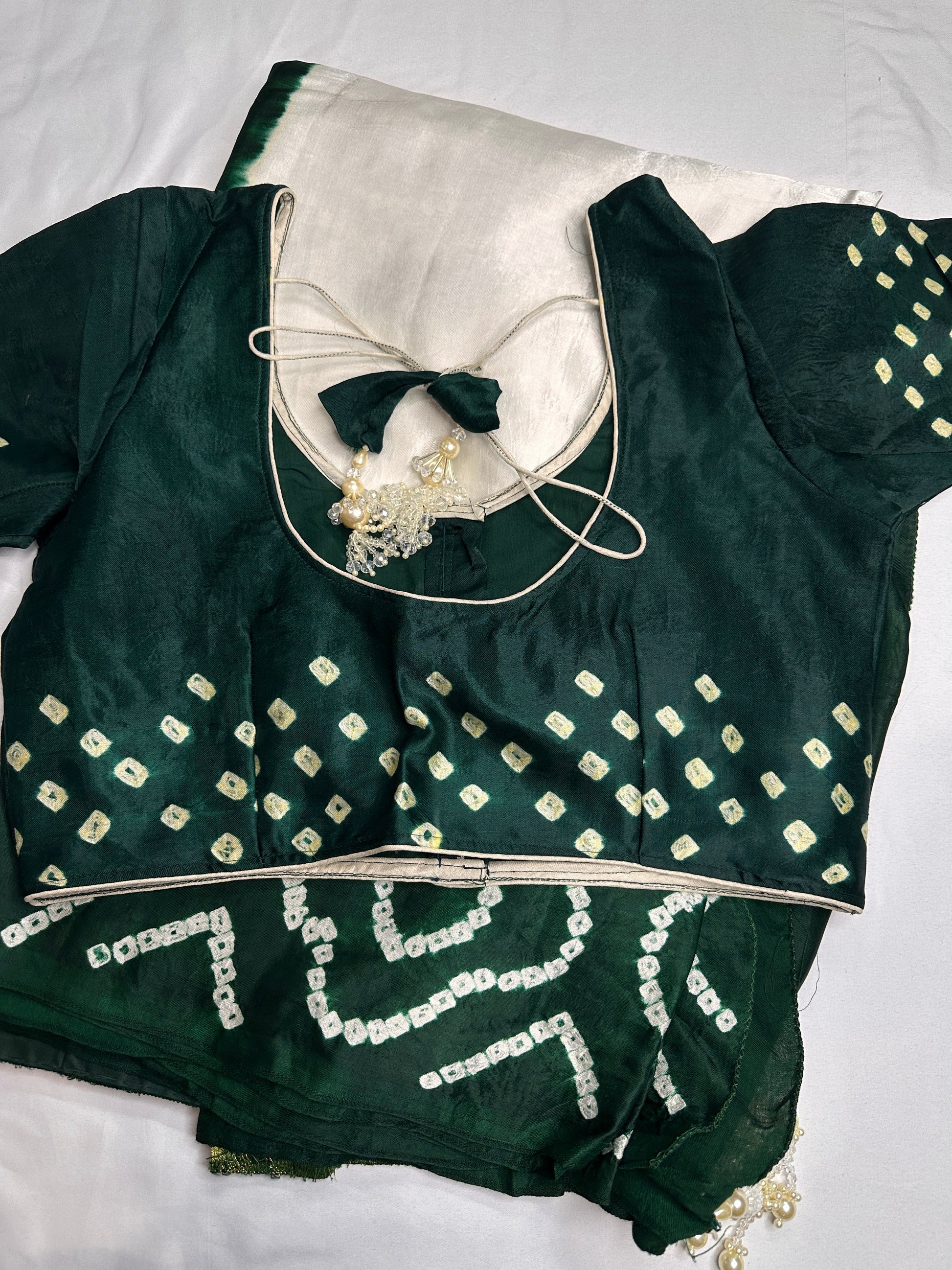 Bandhani Bhandej Half and Half White Green modal Silk Saree