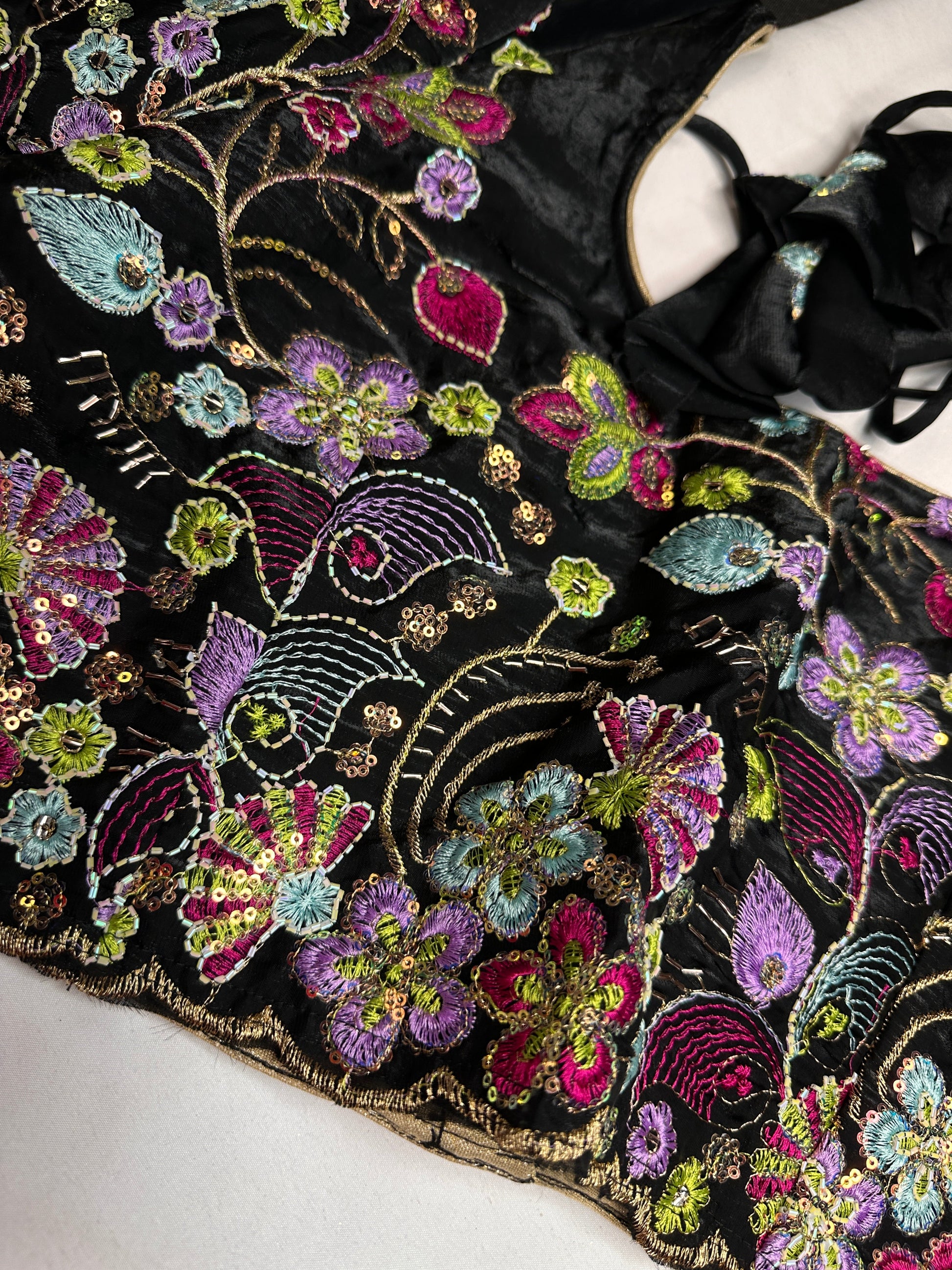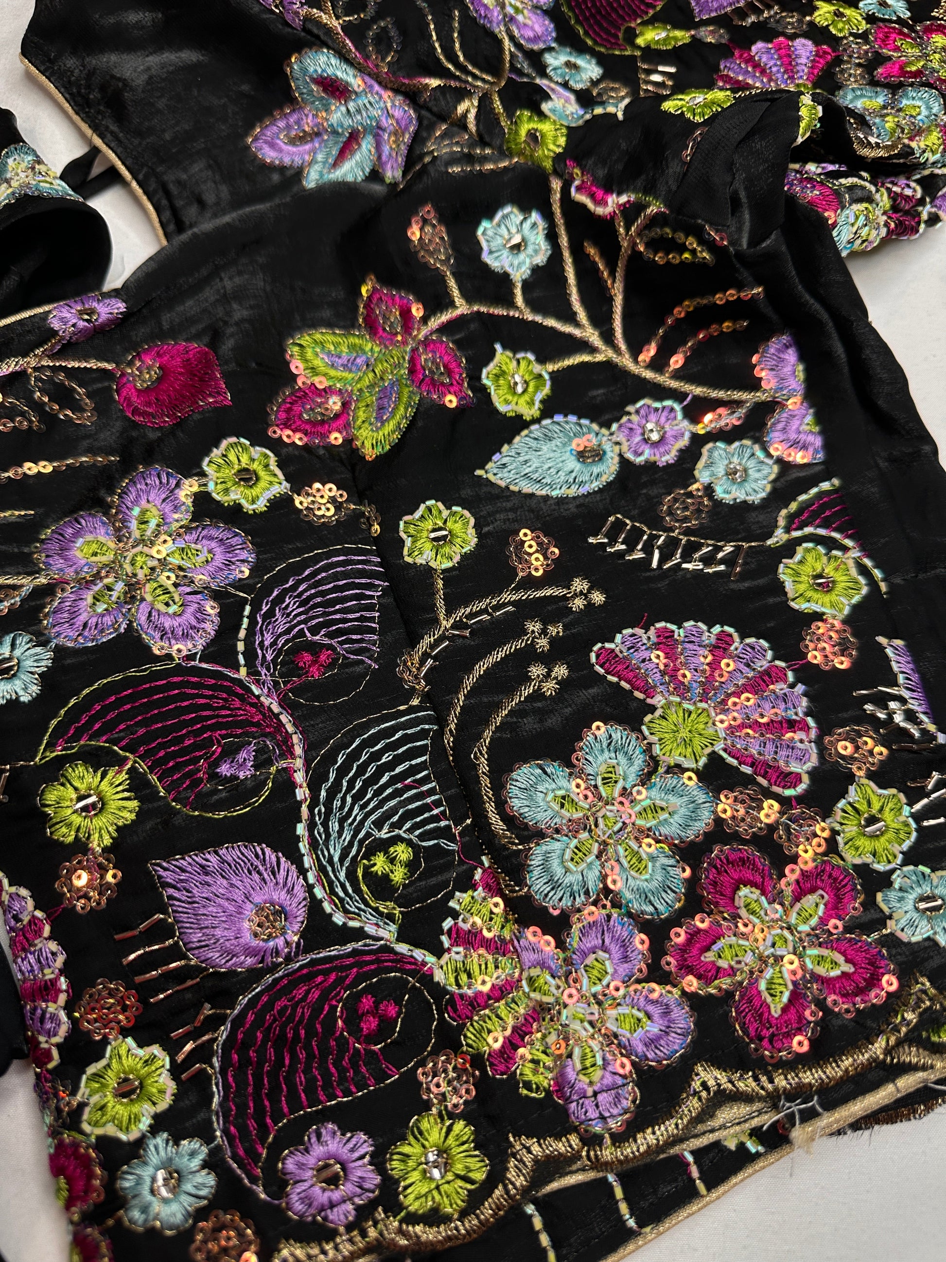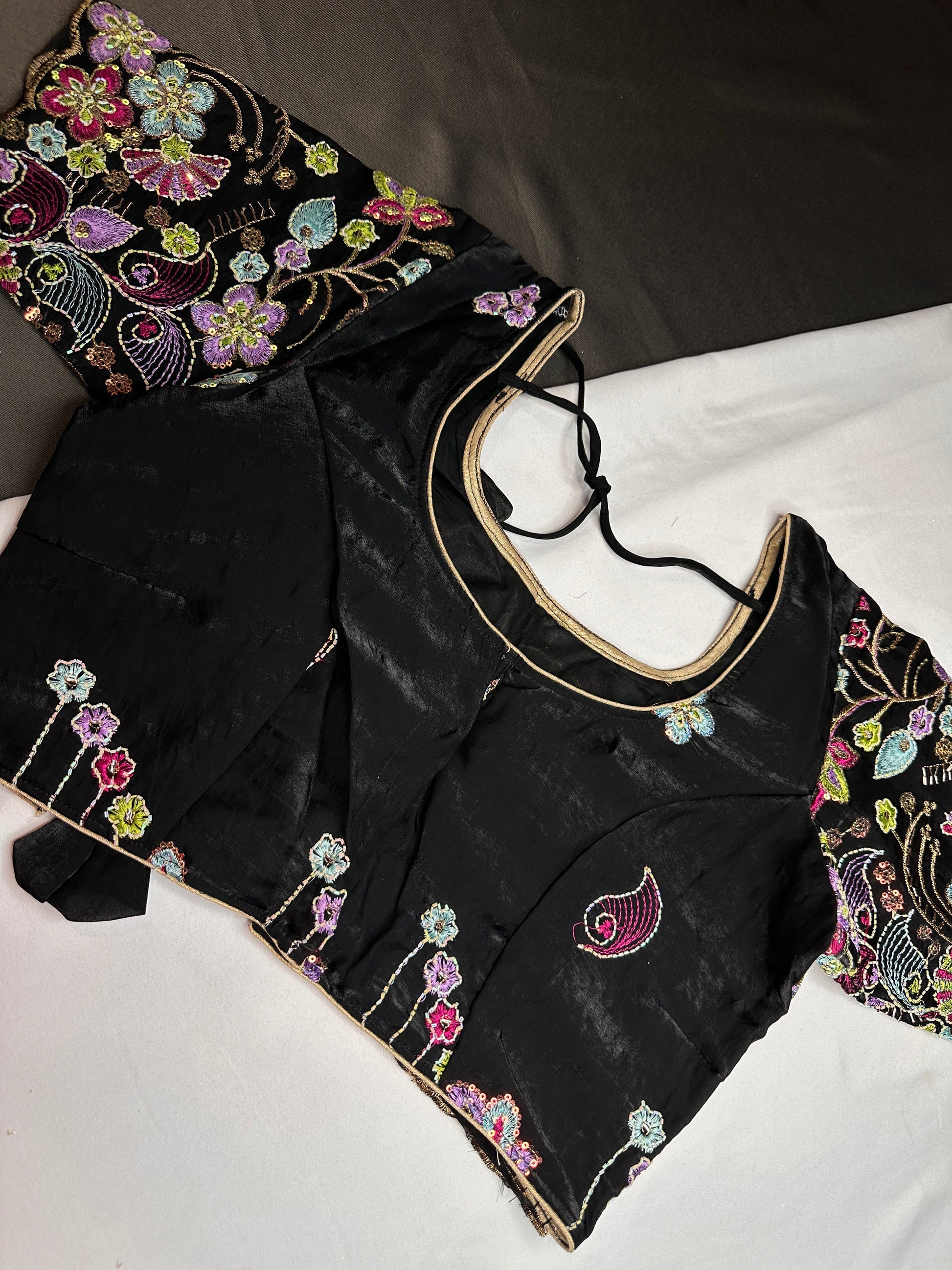 Black Shimmer Georgette BlouseBlouse Details : Blouse Color : Black; Blouse stitched Size 36 and has margin to open up to size 40, Sleeves Length : 8 Inches, blouse Length 14.5 Inches, FrontNeck : 8.5 Inches and Back Neck : 7 Inches;