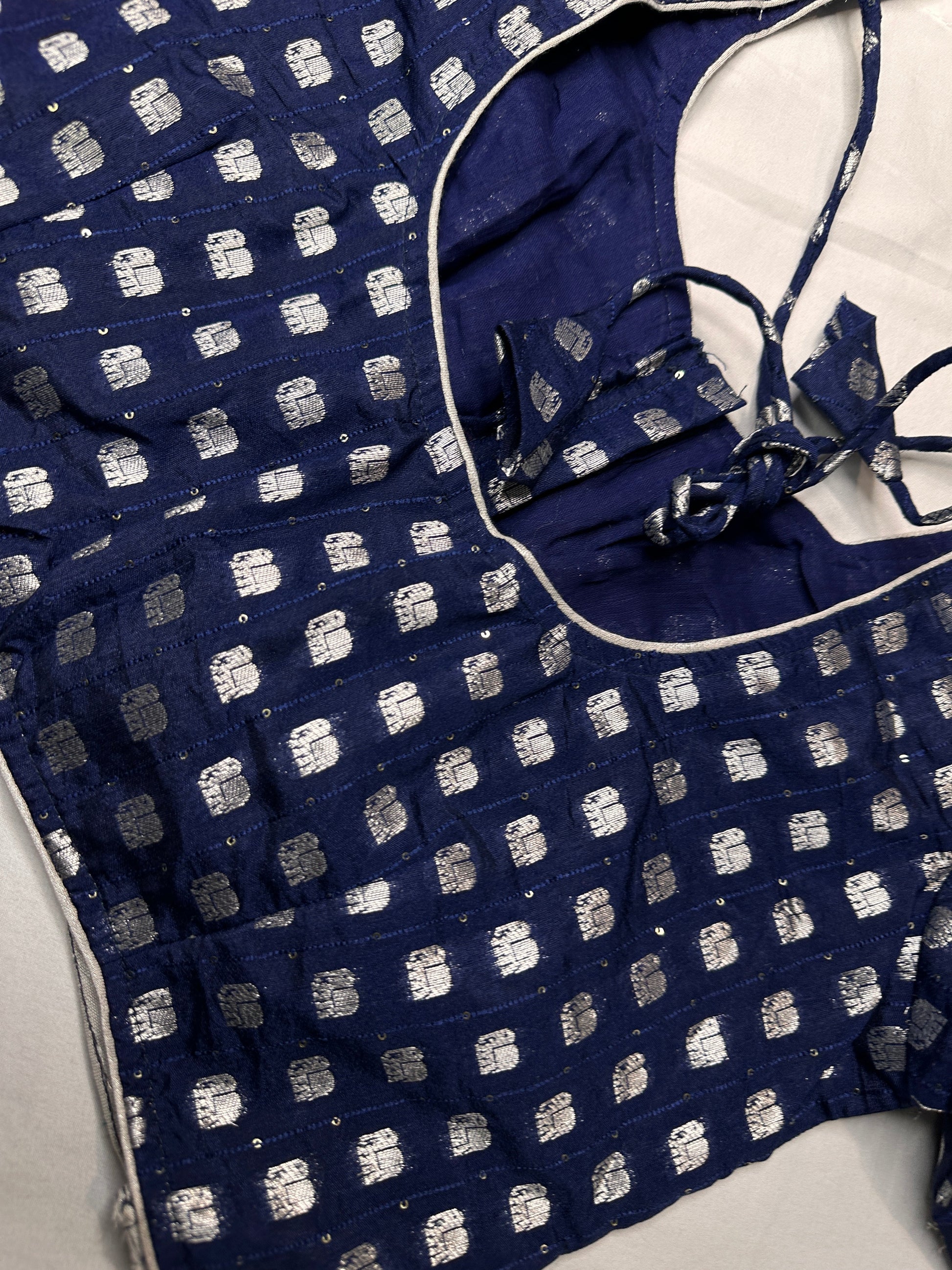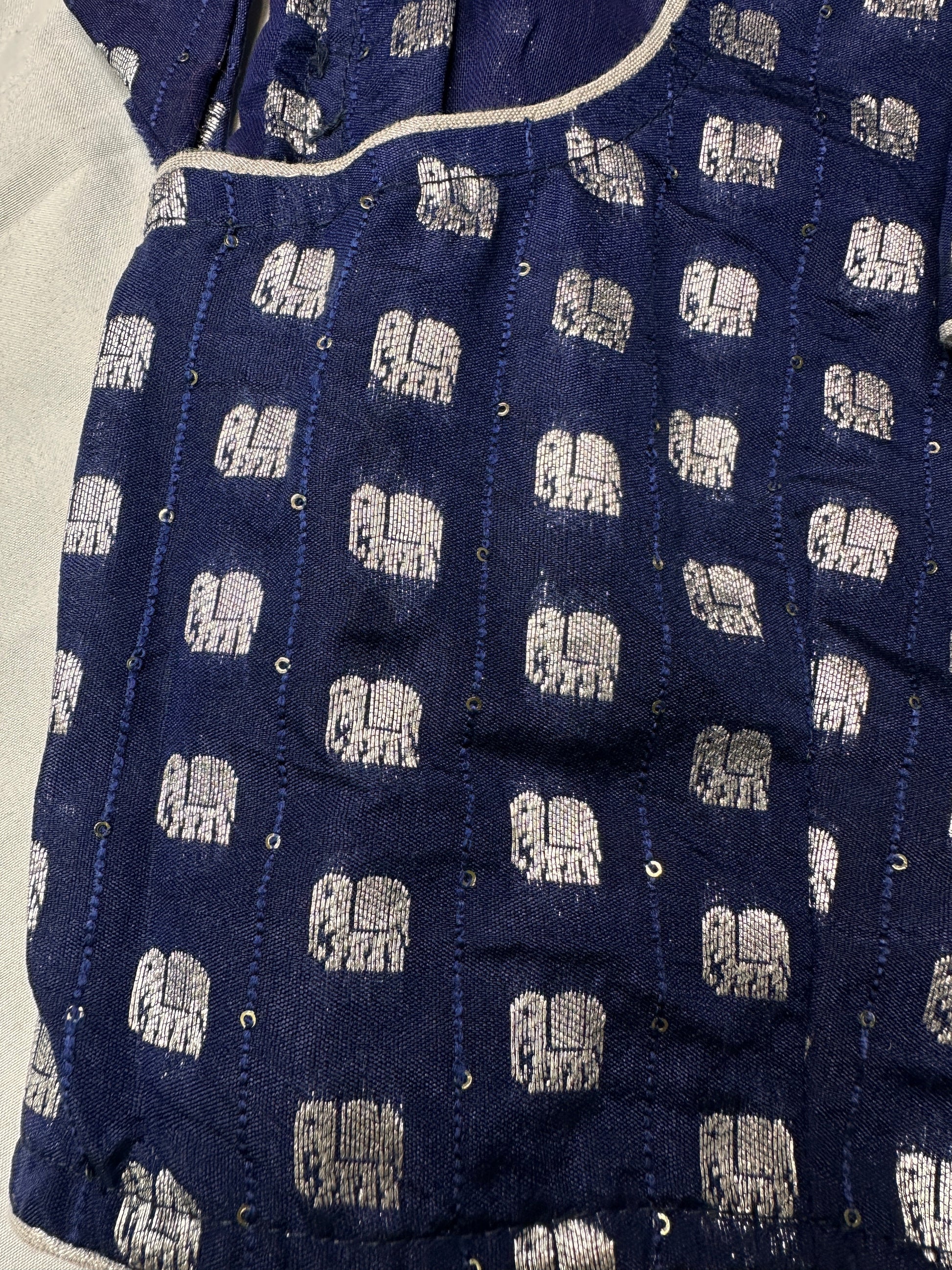 Blue Banarsi BlouseBlouse Details : Blouse Color : Blue; Blouse stitched Size 38 and can be altered from 36 to 44, Sleeves Length : 10 Inches, blouse Length 15 Inches, FrontNeck : 7 Inches and Back Neck : 10 Inches;