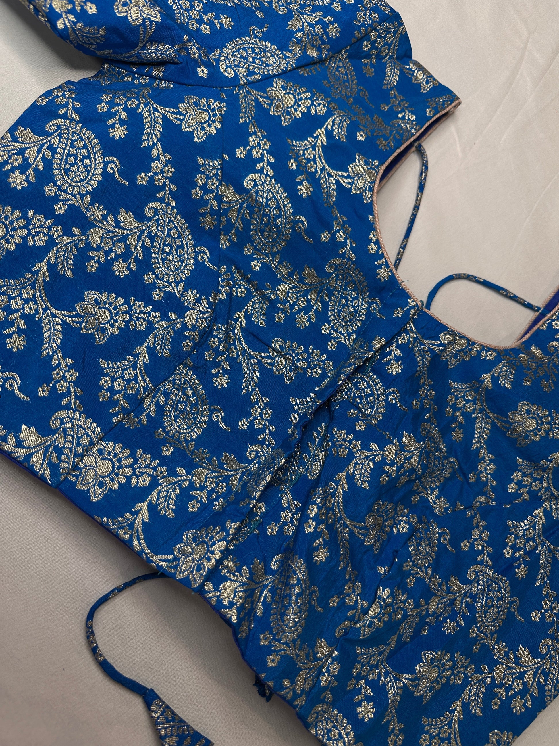 Blouse Details : Blouse Color : Blue; Blouse stitched Size 38 and can be altered from 36 to 46, Sleeves Length : 9.5 Inches, blouse Length 15 Inches, FrontNeck : 7 Inches and Back Neck : 8 Inches;