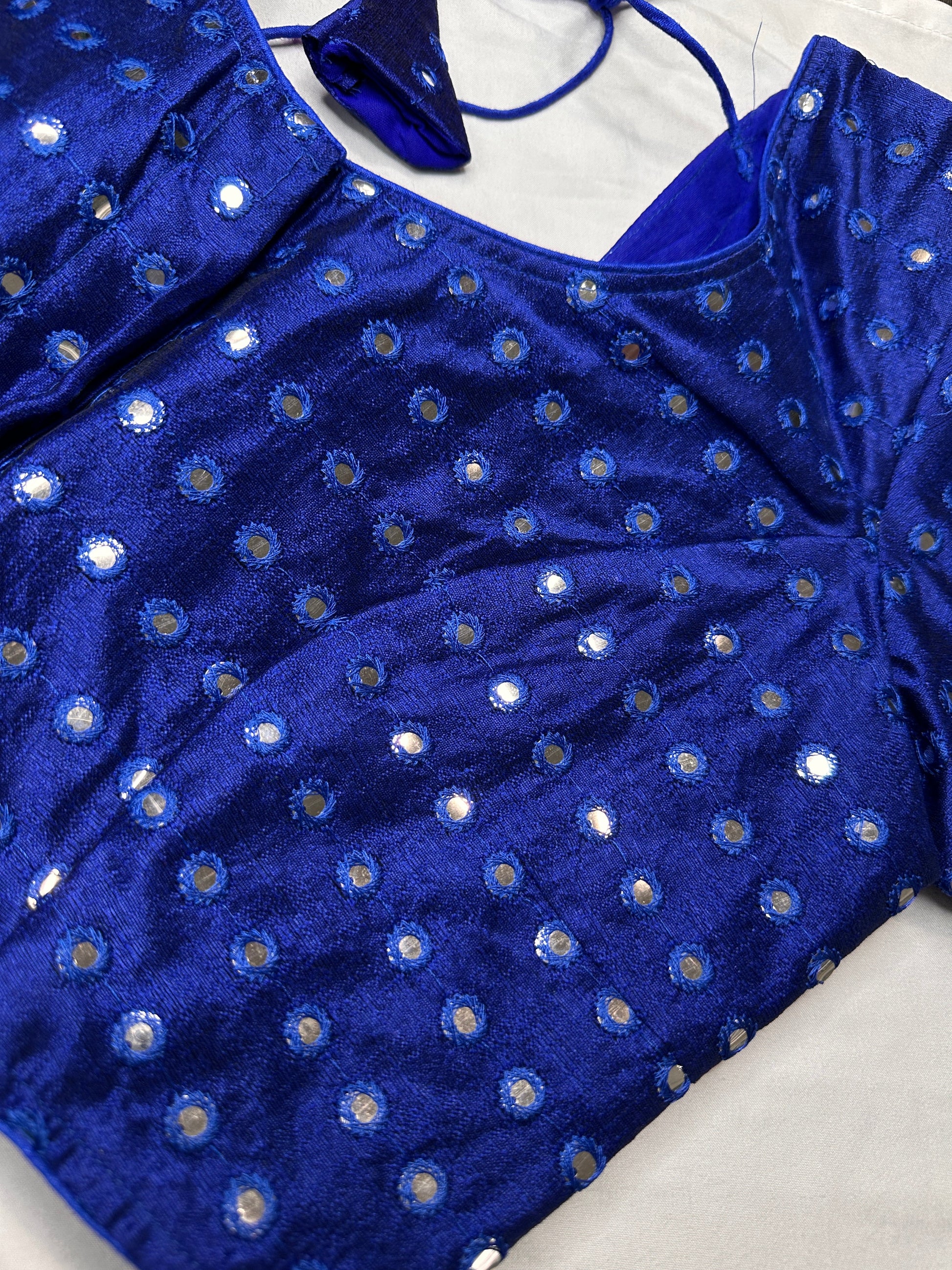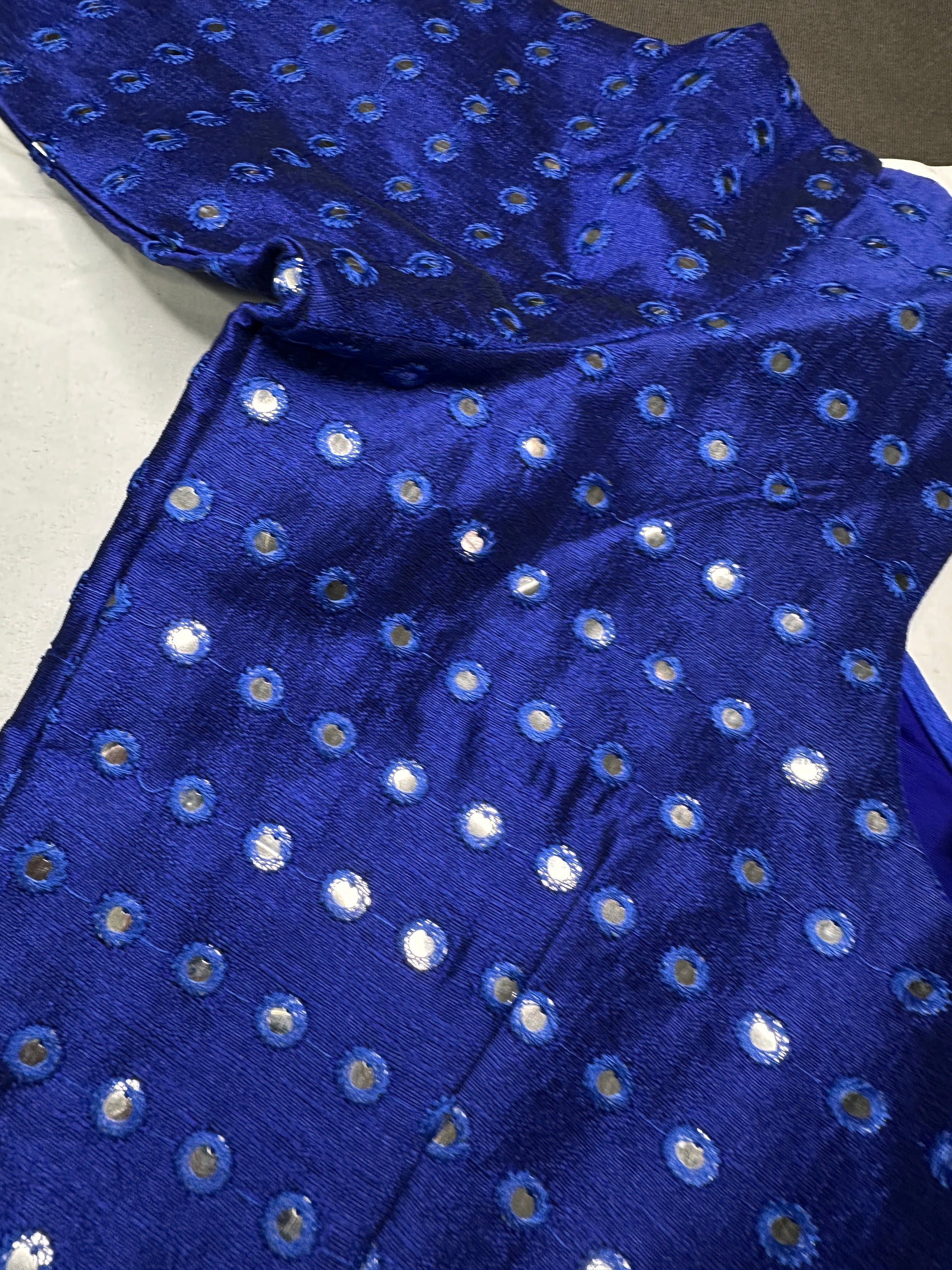 Blouse Details : Blouse Color : Blue; Blouse stitched Size 40 and can be altered from 36 to 44, Sleeves Length : 10 Inches, blouse Length 15 Inches, FrontNeck : 6.5 Inches and Back Neck : 8 Inches;
