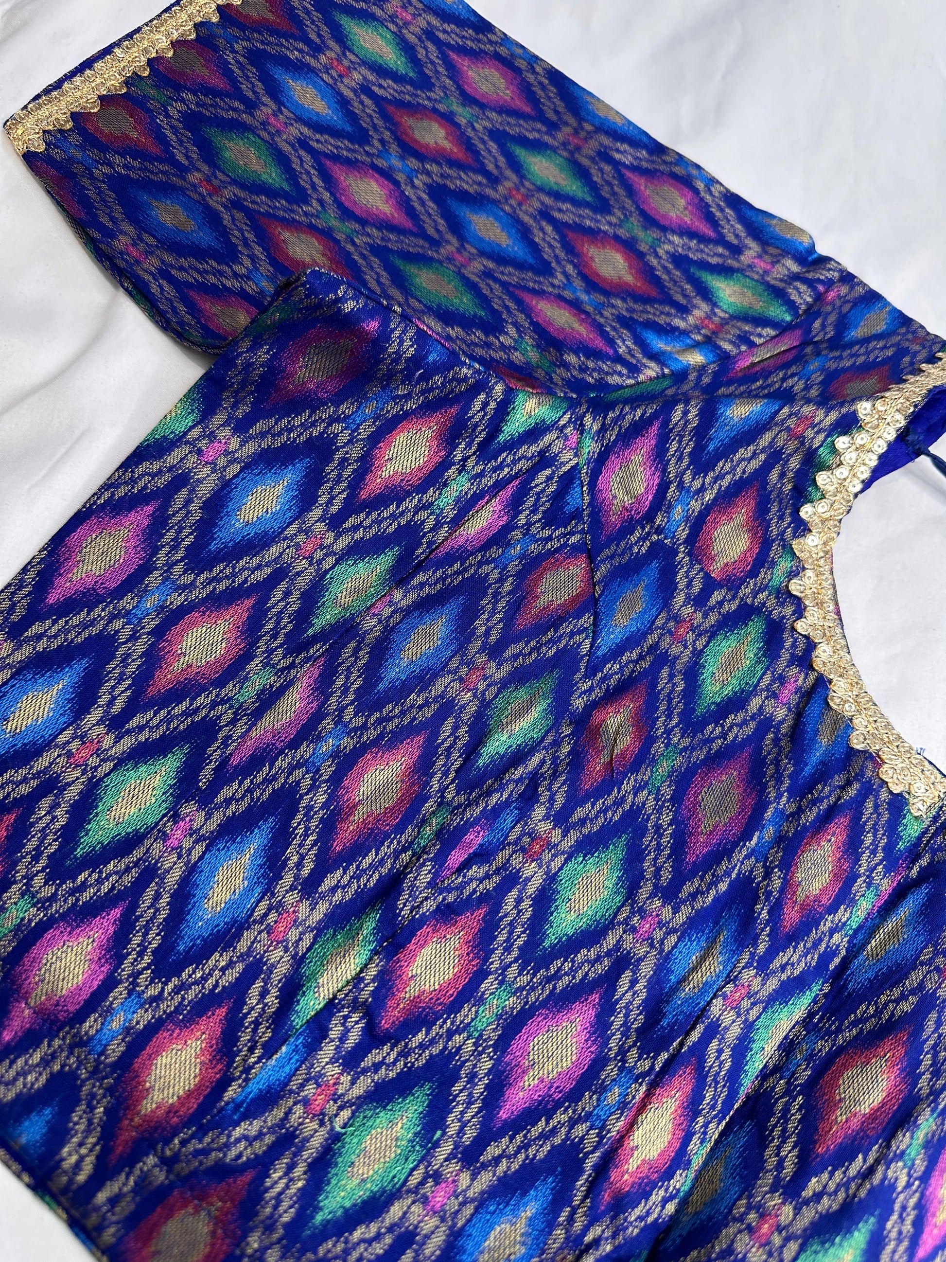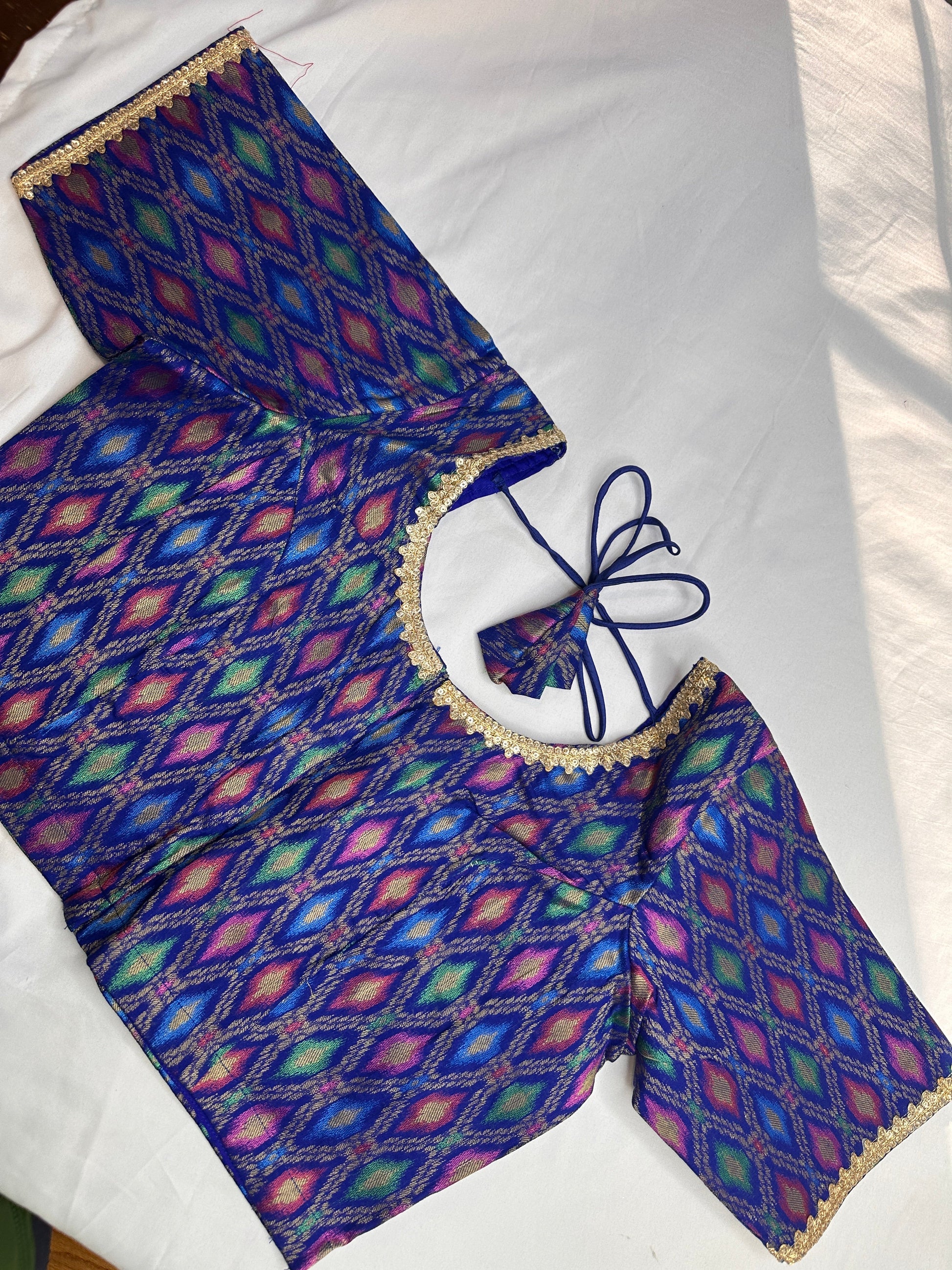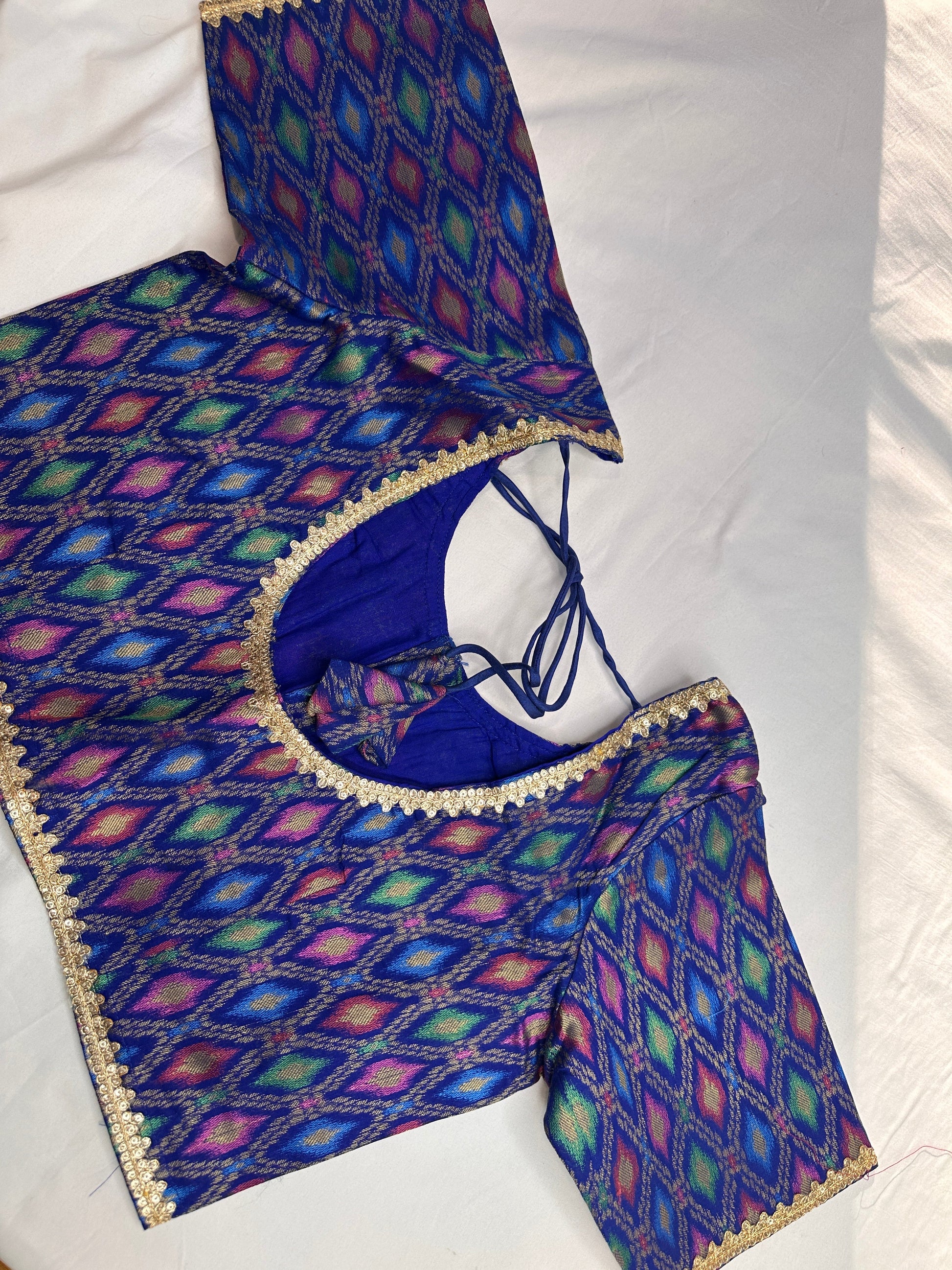 Blouse Details : Blouse Color : Blue; Blouse stitched Size 38 and can be altered from 36 to 44, Sleeves Length : 10 Inches, blouse Length: 14.5 Inches, FrontNeck : 7 Inches and Back Neck : 10 Inches;