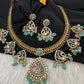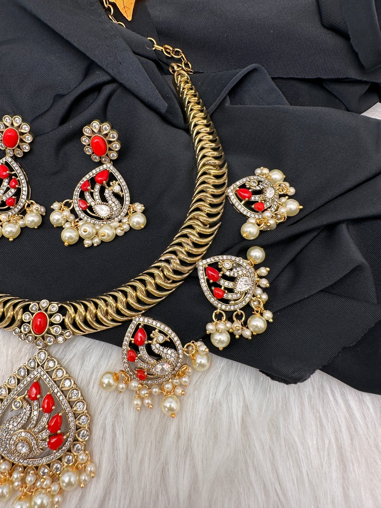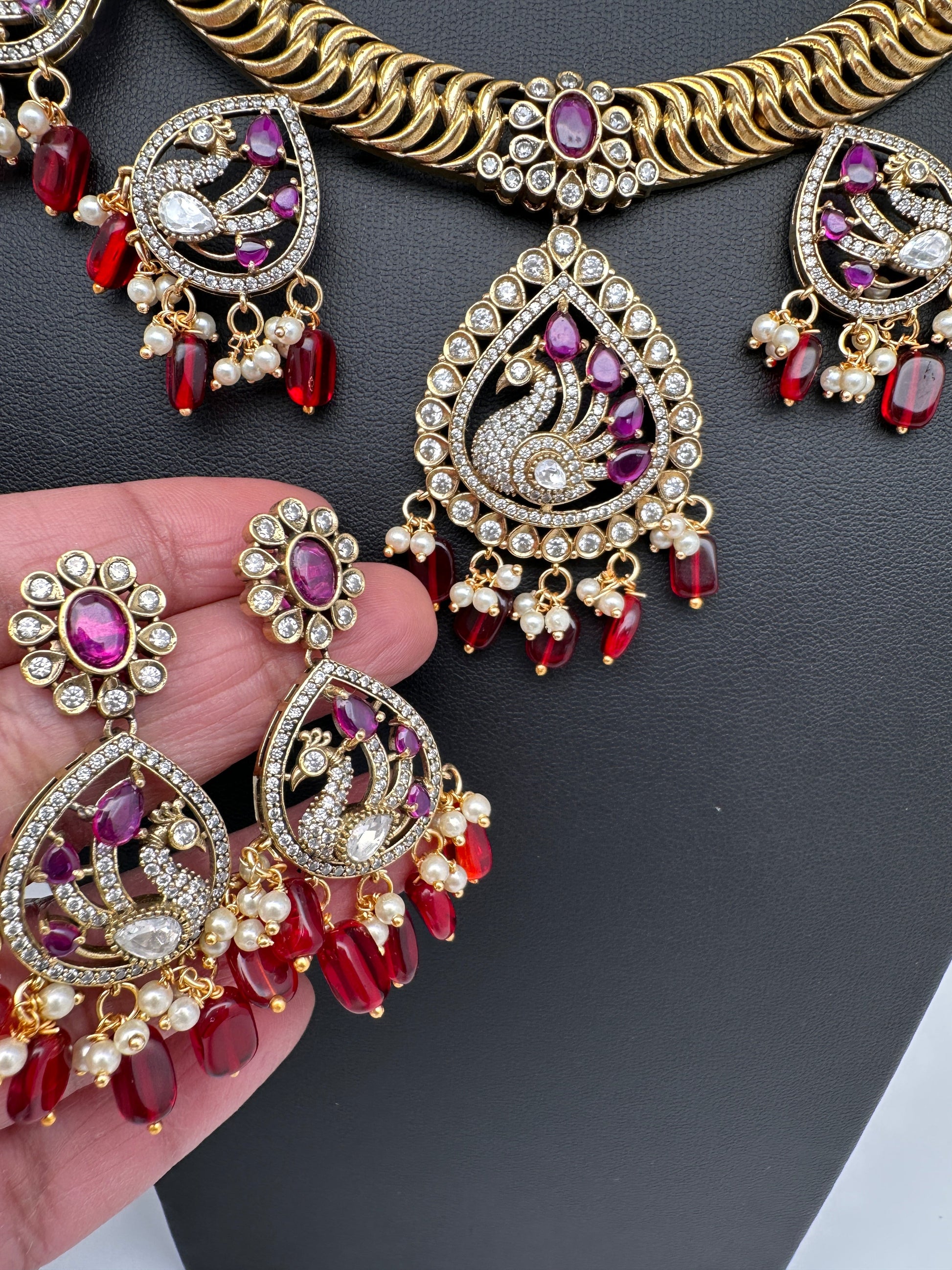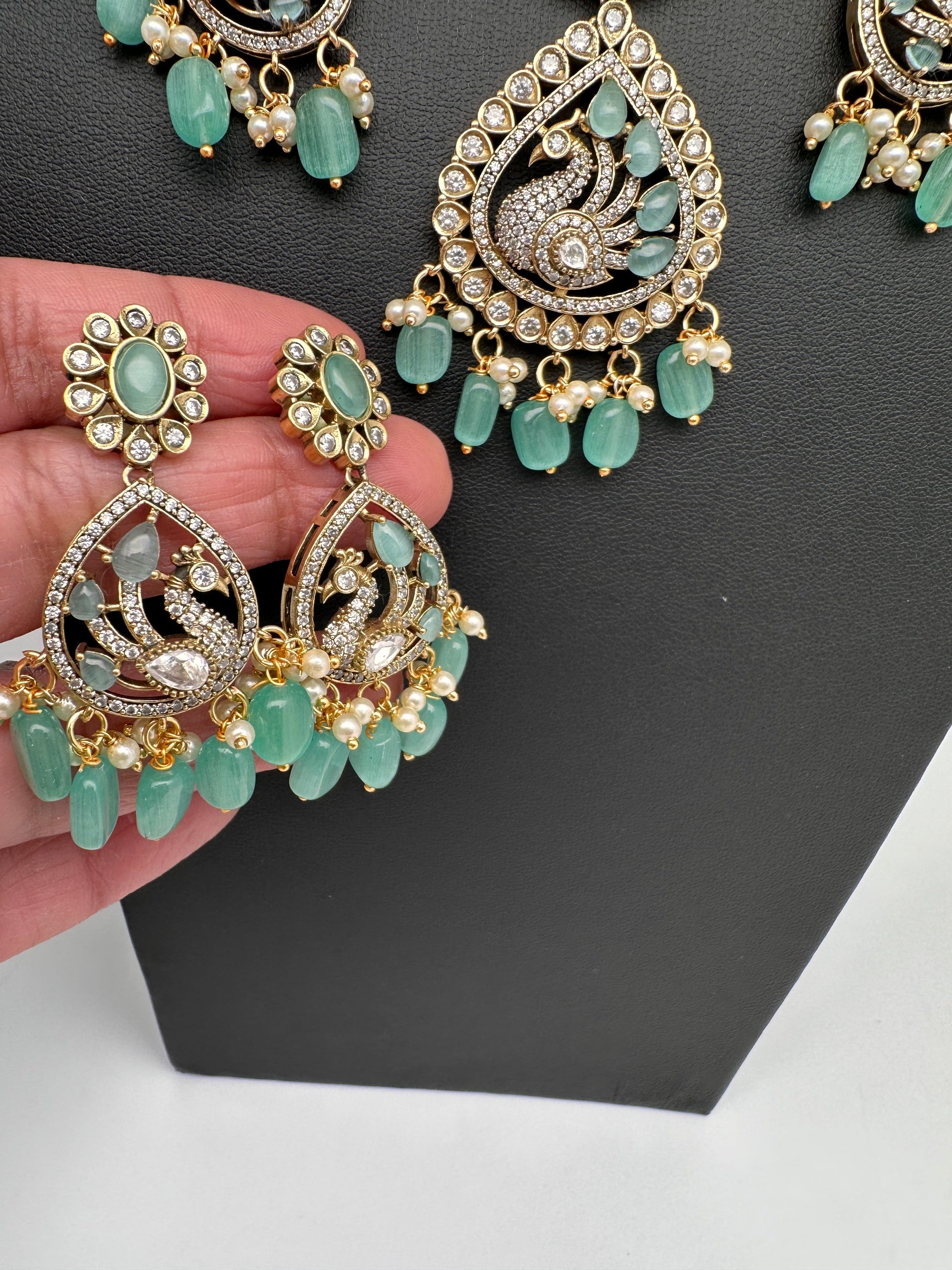 CZ Moissanite Peacock Mehendi Finish Jalebi Color Stone Necklace with Matching EarringsColor : Victorian MehndiSize : Necklace Length : 16 Inches; Earrings Length : 2.25 InchesStones : AD --Color-- Stone --Color
