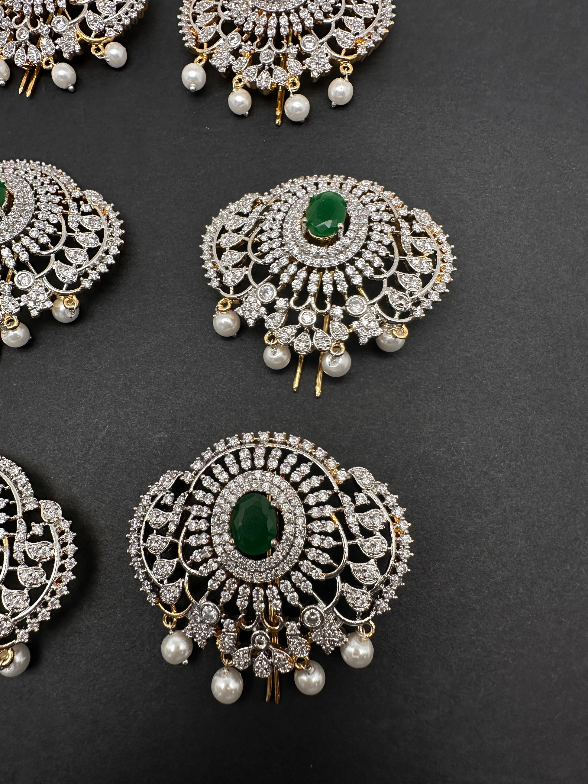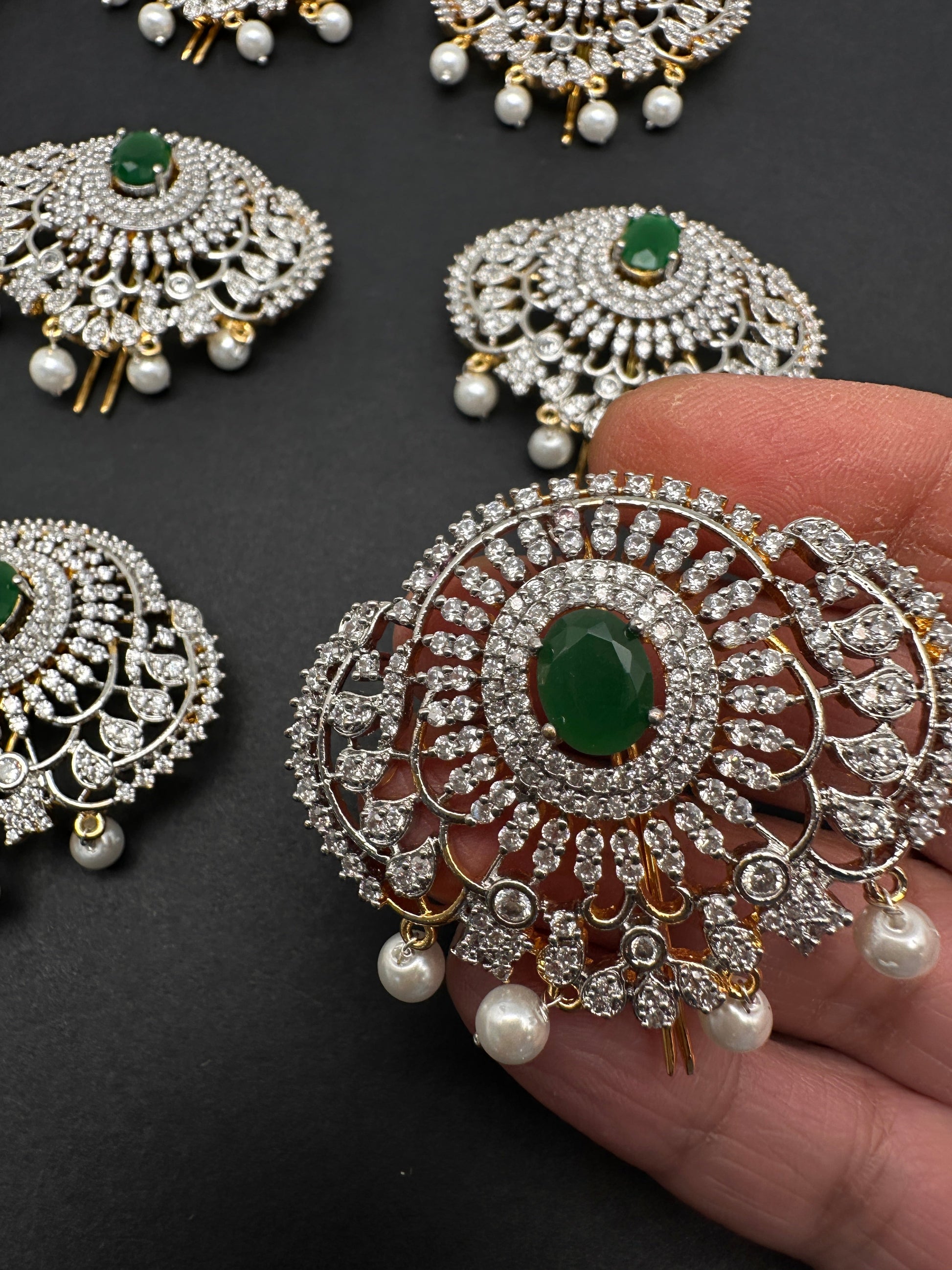 Diamond Finish CZ Emerald Green Stone Jada Billa Hair Pin Set Set of 9 Hair Pins Classical Dance Jewelry accessories Color : Golden Size : Total Length : Approx 13 Inches for 9 Billa Pins: Approx 1.75 Inches for 1 Billa Pin. Stones : AD Red Stone Pearls