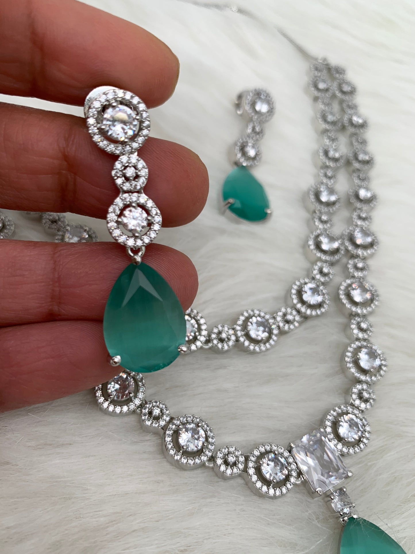 Doublet Stone Short Necklace with matching earringsColor : Silver ADSize : Necklace Length : 16 Inches; Earrings Length : 1.75 Inches;Stones : AD --Color-- Doublet Stone