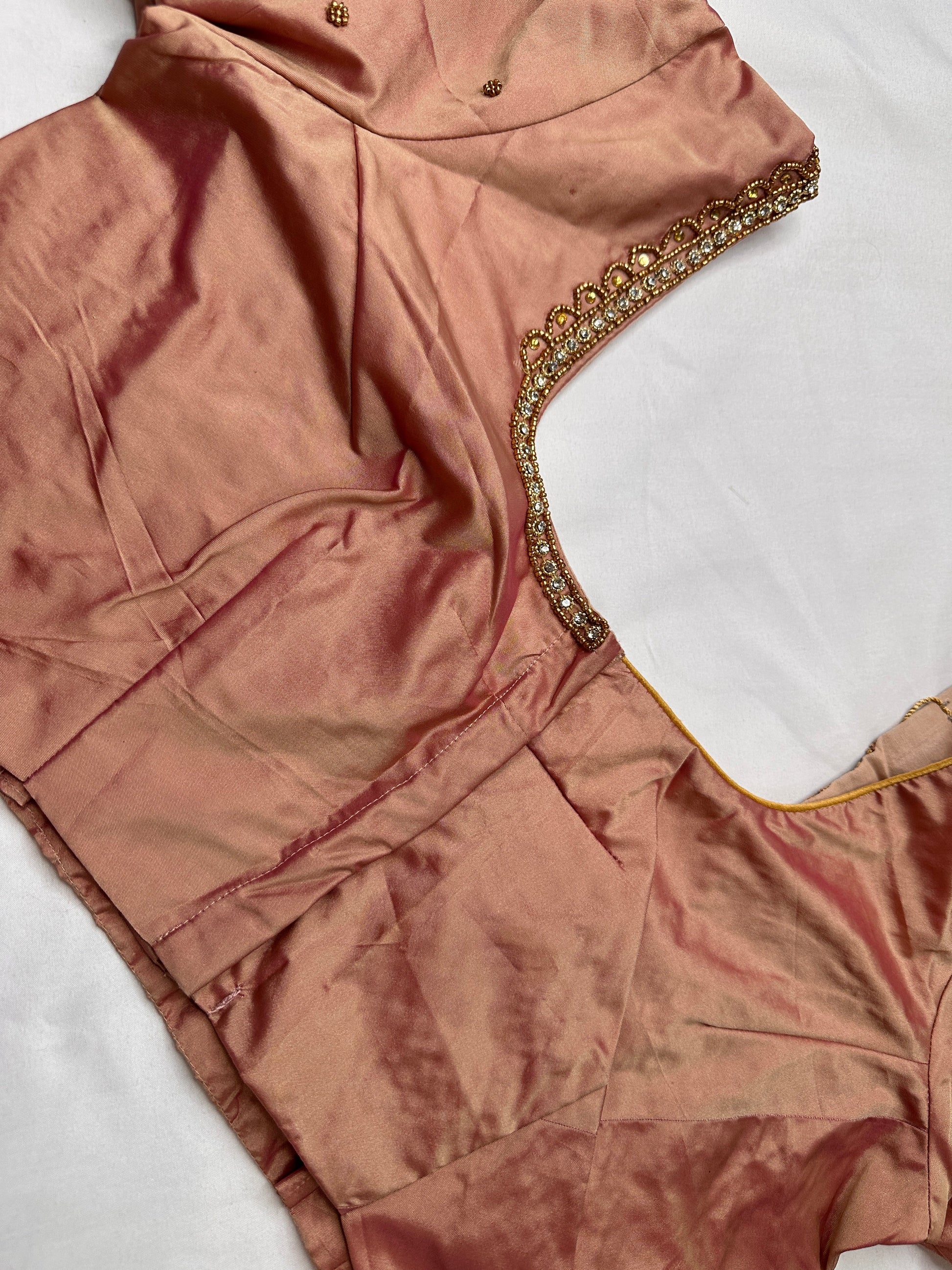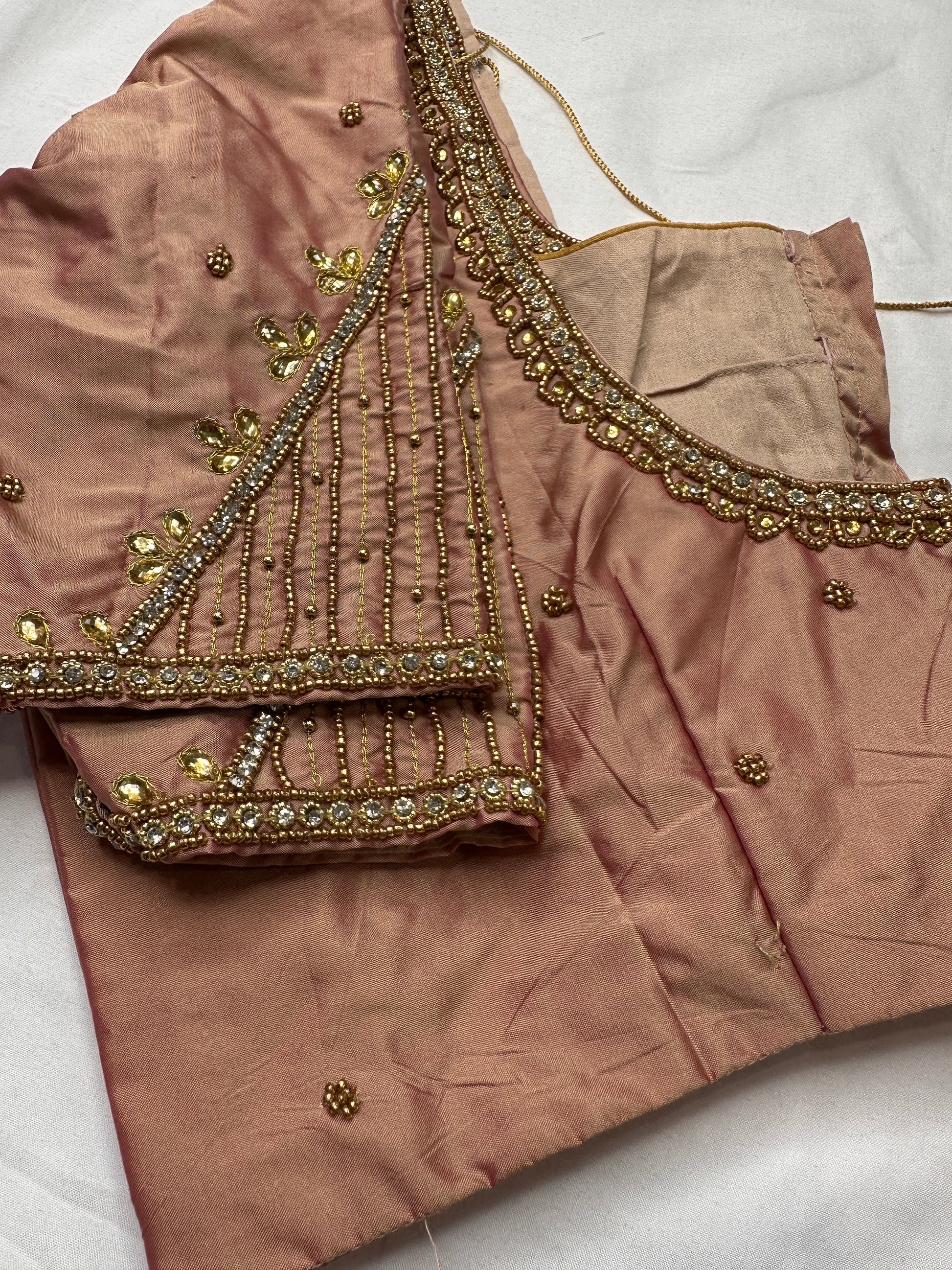 Dusty Rose Maggam Aari Embroidery BlouseBlouse Details : Blouse Color : Dusty Rose; Blouse stitched Size 38 and can be altered from 36 to 44, Sleeves Length : 10 Inches, blouse Length 15 Inches, FrontNeck : 7 Inches and Back Neck : 9.5 Inches;