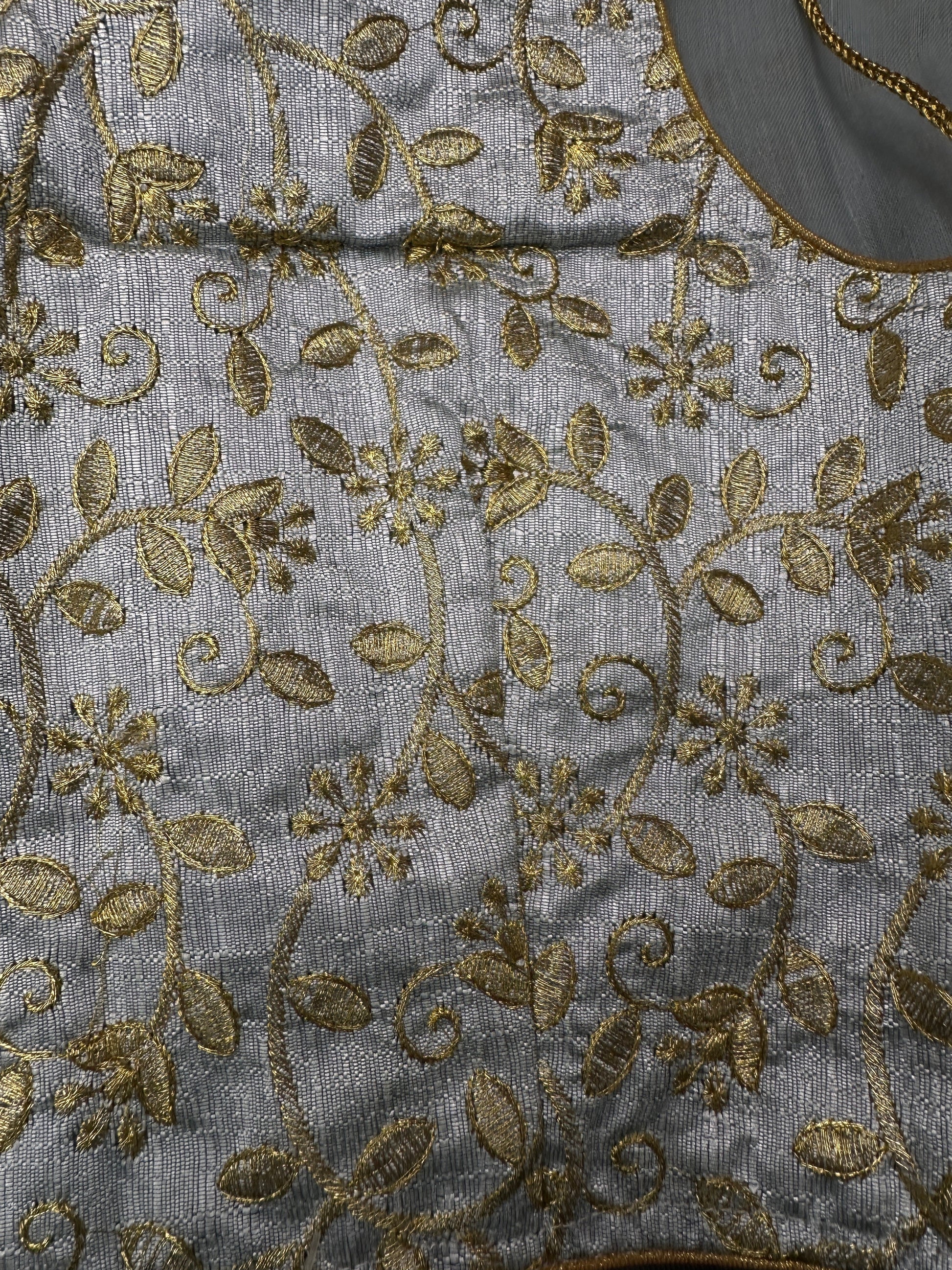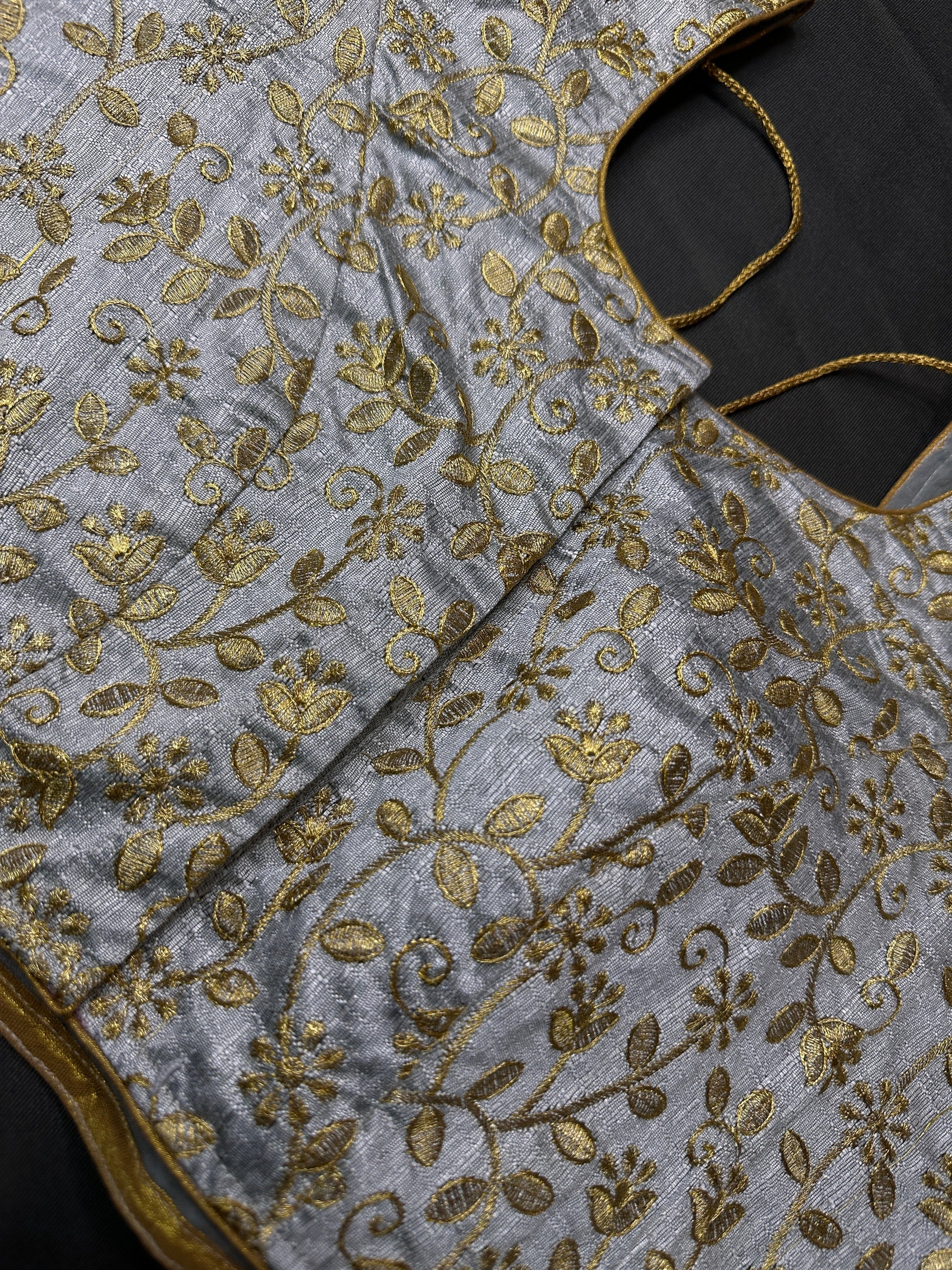 Embroidery Silver Gold BlouseBlouse Details : Blouse Color : Silver; Blouse stitched Size 40 and can be altered from 36 to 44, Sleeves Length : 10 Inches, blouse Length 15 Inches, FrontNeck : 6.5 Inches and Back Neck : 8 Inches;
