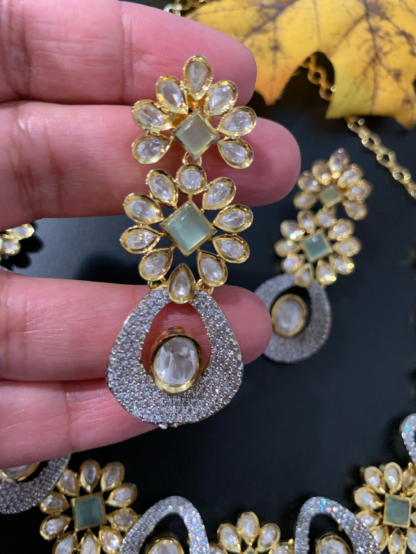 Floral Pattern Kundan Mint Green Stone Short Necklace with Matching EarringsColor : GoldenSize : Necklace Length : Approx 16 Inches; Earring Length : 2 InchesStones : Kundan, Mint Green Stone