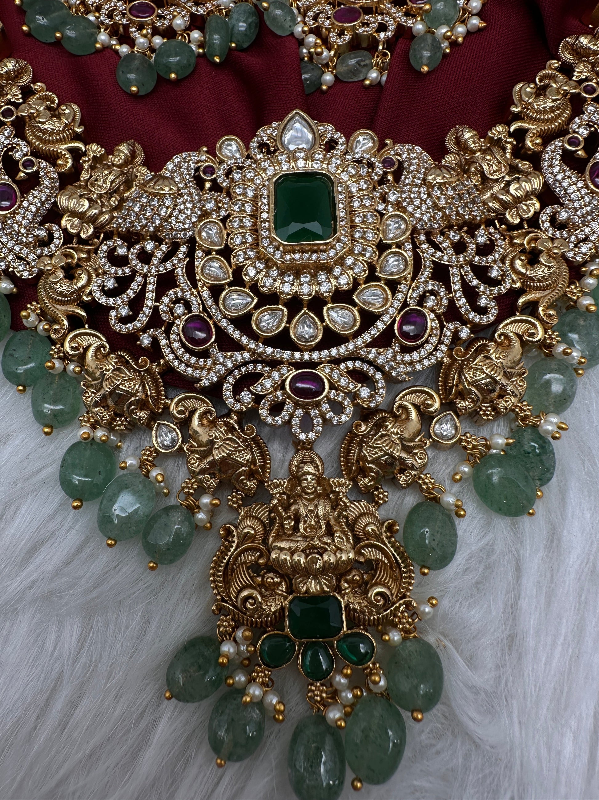 Goddess Lakshmi One Gram Gold Platted Nakshi Short Necklace with Emerald Beads with Matching Earring
