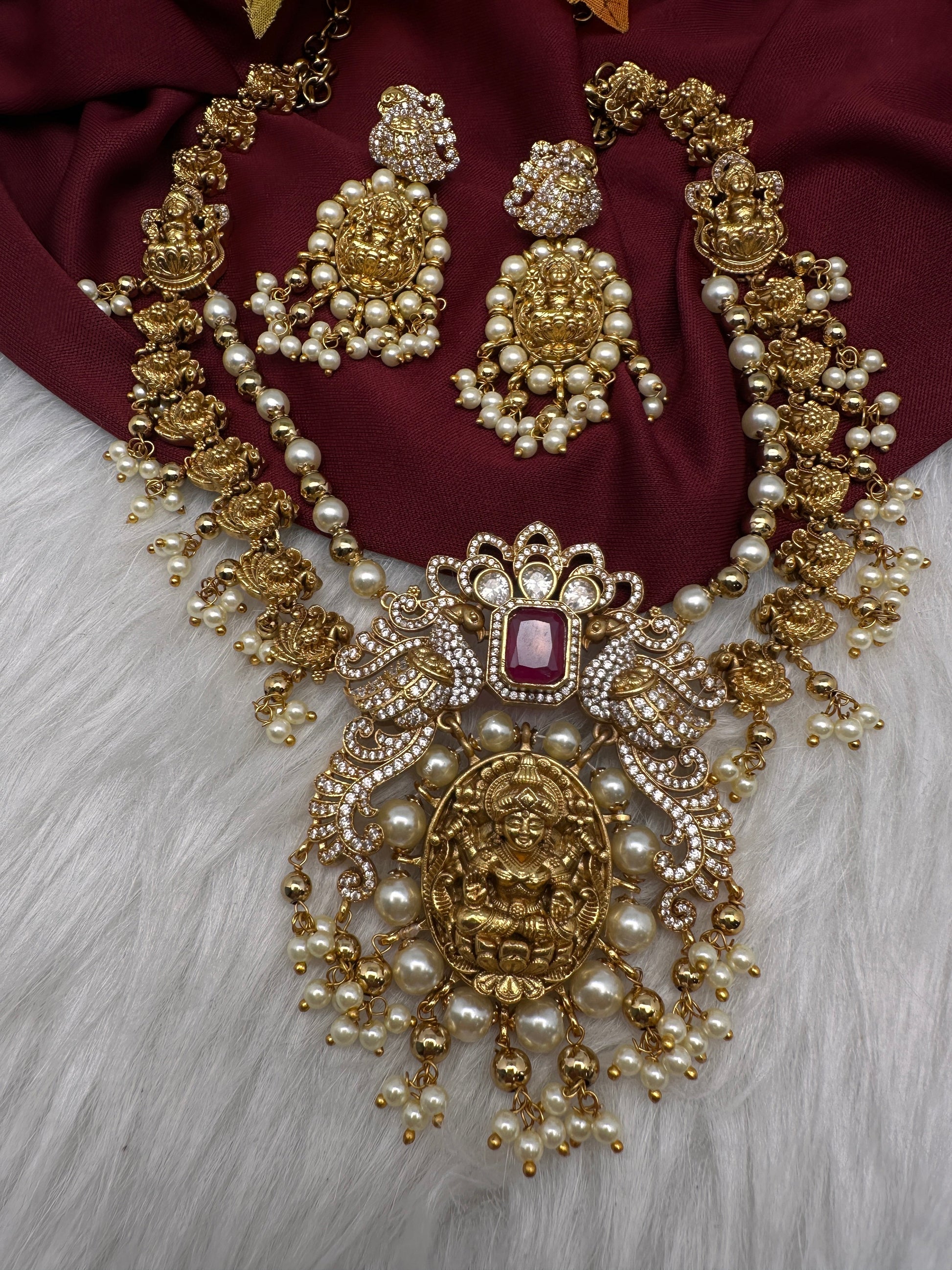 Goddess Lakshmi Peacock Matte Pearls Layer Short Necklace with Matching JhumkasColor : MatteSize : Necklace Length : 16 Inches; Earring Length : 2.25 Inches Approx; Stones : CZ Red Green Stone Gold Beads Pearls