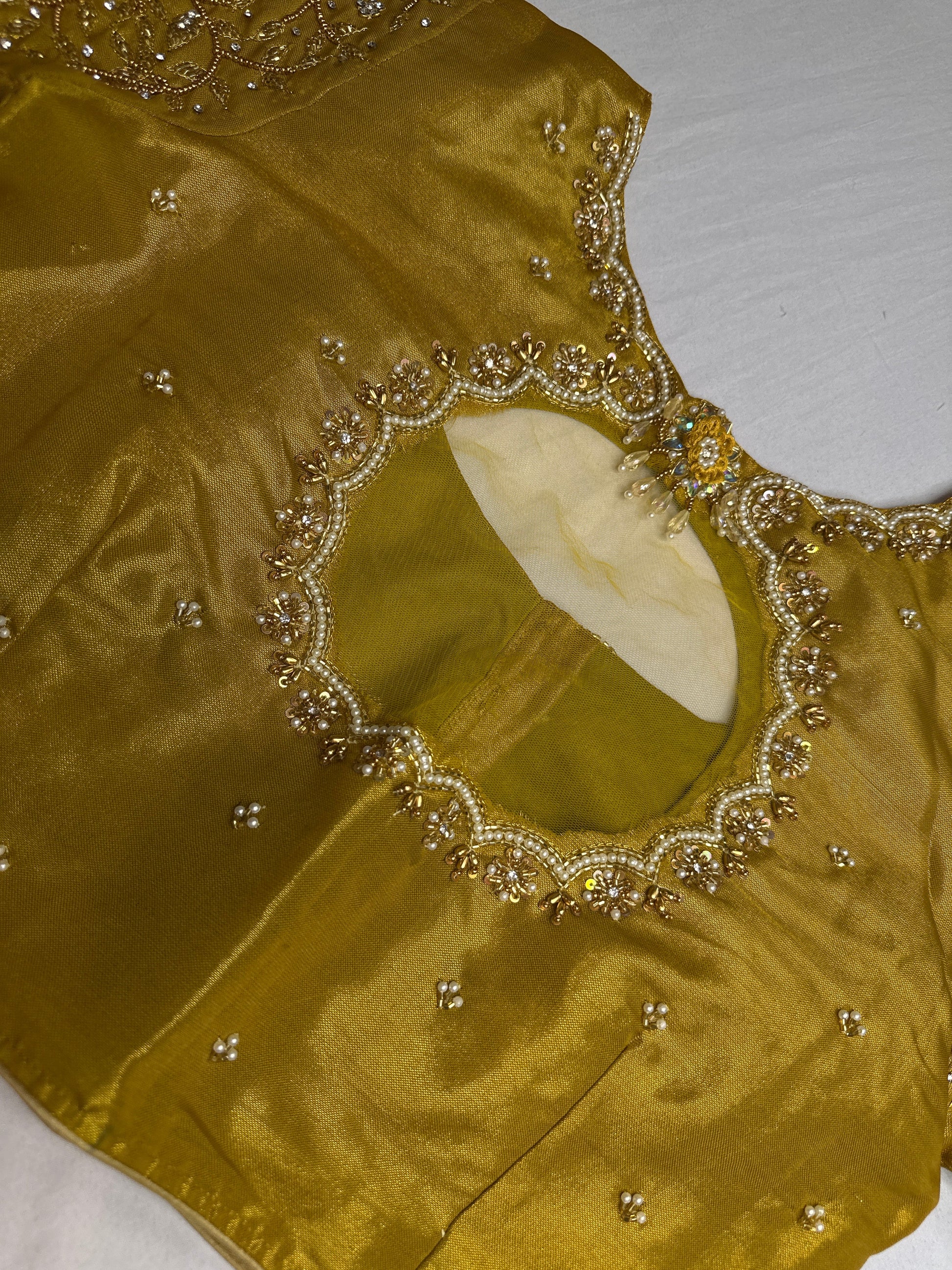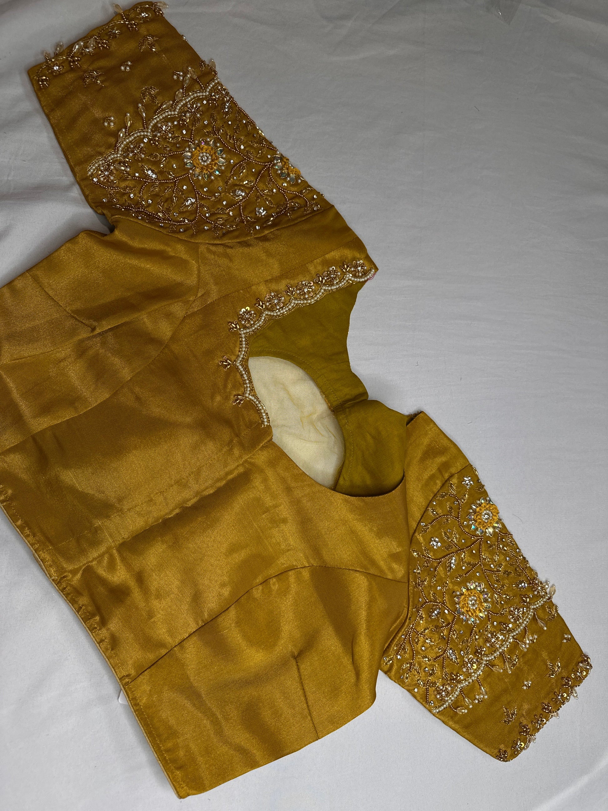 Blouse Details : Blouse Color : Gold; Blouse stitched Size 38 and can be altered from 36 to 44, Sleeves Length : 9.5 Inches, blouse Length 15 Inches, FrontNeck : 8 Inches and Back Neck : 4 Inches;