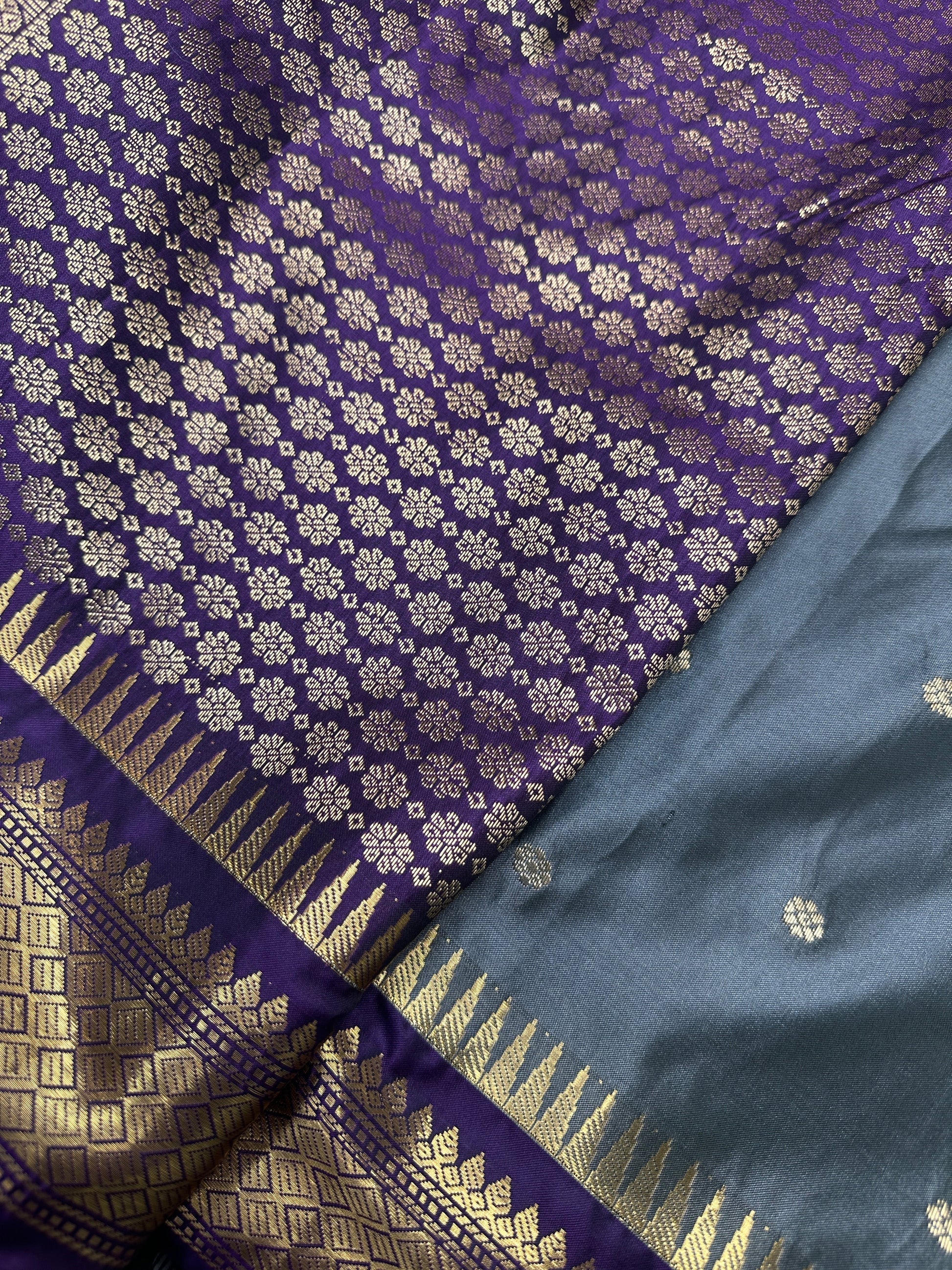 Gray Purple Semi Silk Pattu Gadwal Saree Saree Details : Gray Color Saree Purple Pallu Fall and Pico done Blouse Details : Purple Maggam Work Blouse Size 38 and has margin to go up to Size 44; Sleeves Length : 8.5 Inches: Blouse Length : 15 Inches; Front Neck : 7 Inches; Back Neck : 8 Inches Inches