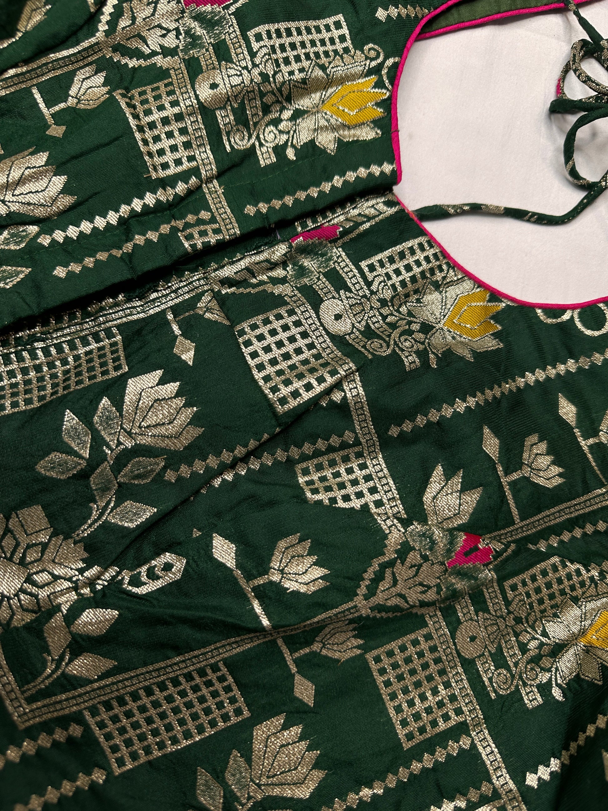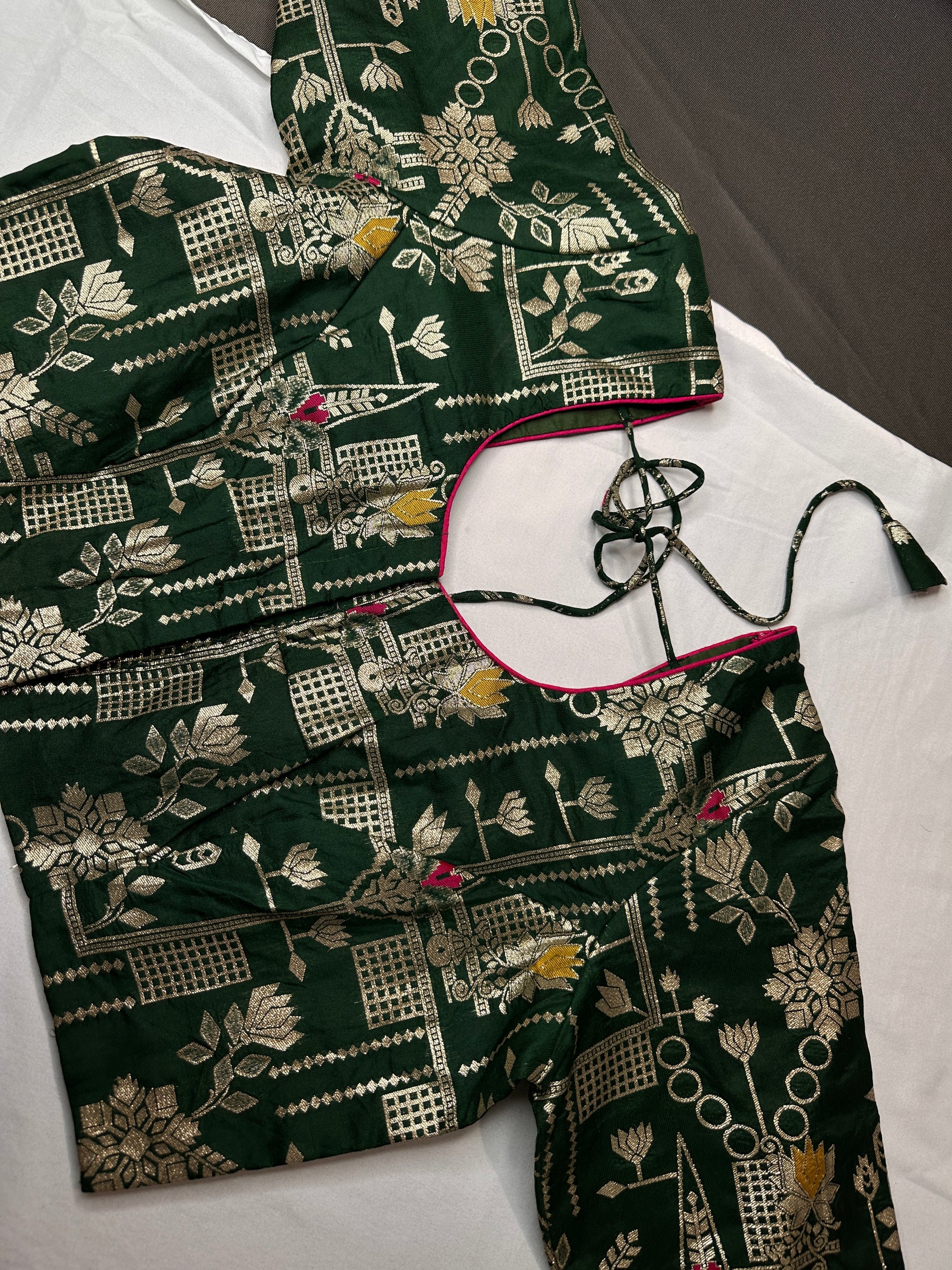 Blouse Details : Blouse Color : Green; Blouse stitched Size 38 and can be altered from 36 to 44, Sleeves Length : 9.5 Inches, blouse Length 15 Inches, FrontNeck : 7 Inches and Back Neck : 10 Inches;