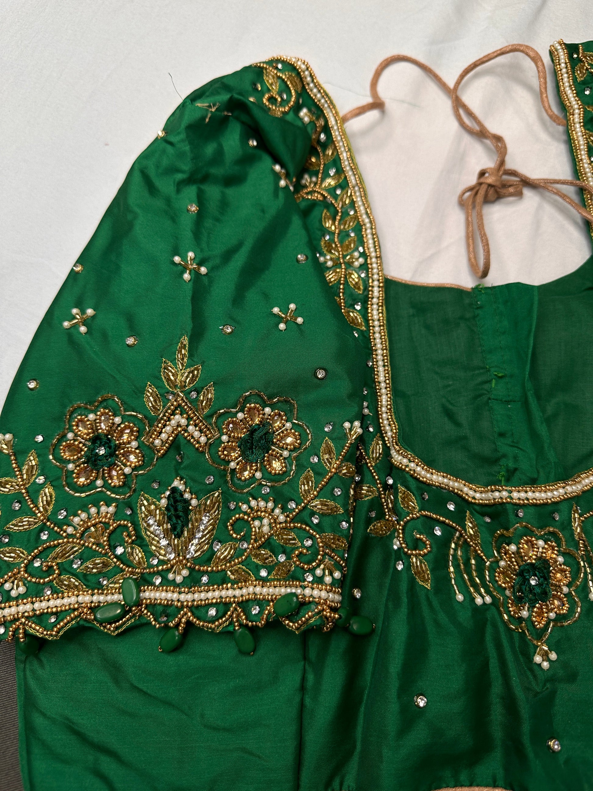 Green Kardana Pearls Maggam BlouseBlouse Details : Blouse Color : Green; Blouse stitched Size 38 and can be altered from 36 to 46, Sleeves Length : 9Inches, blouse Length 14.5 Inches, FrontNeck : 7 Inches and Back Neck : 10 Inches;
