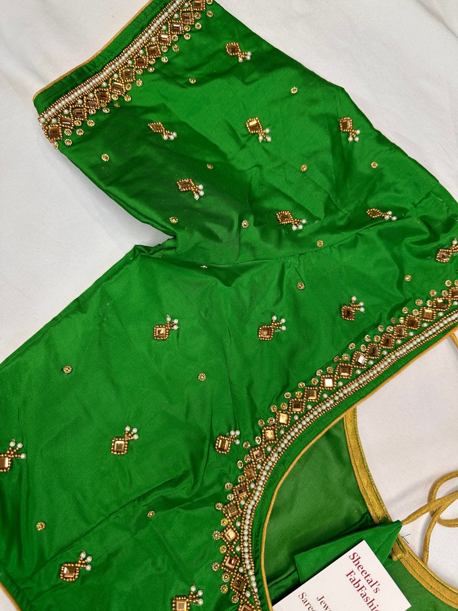 Green Maggam Aari Work BlouseBlouse Details : Blouse Color : Green; Blouse stitched Size 38 and can be altered from 36 to 44, Sleeves Length : 9 Inches, blouse Length 15 Inches, FrontNeck : 8 Inches and Back Neck : 10 Inches;