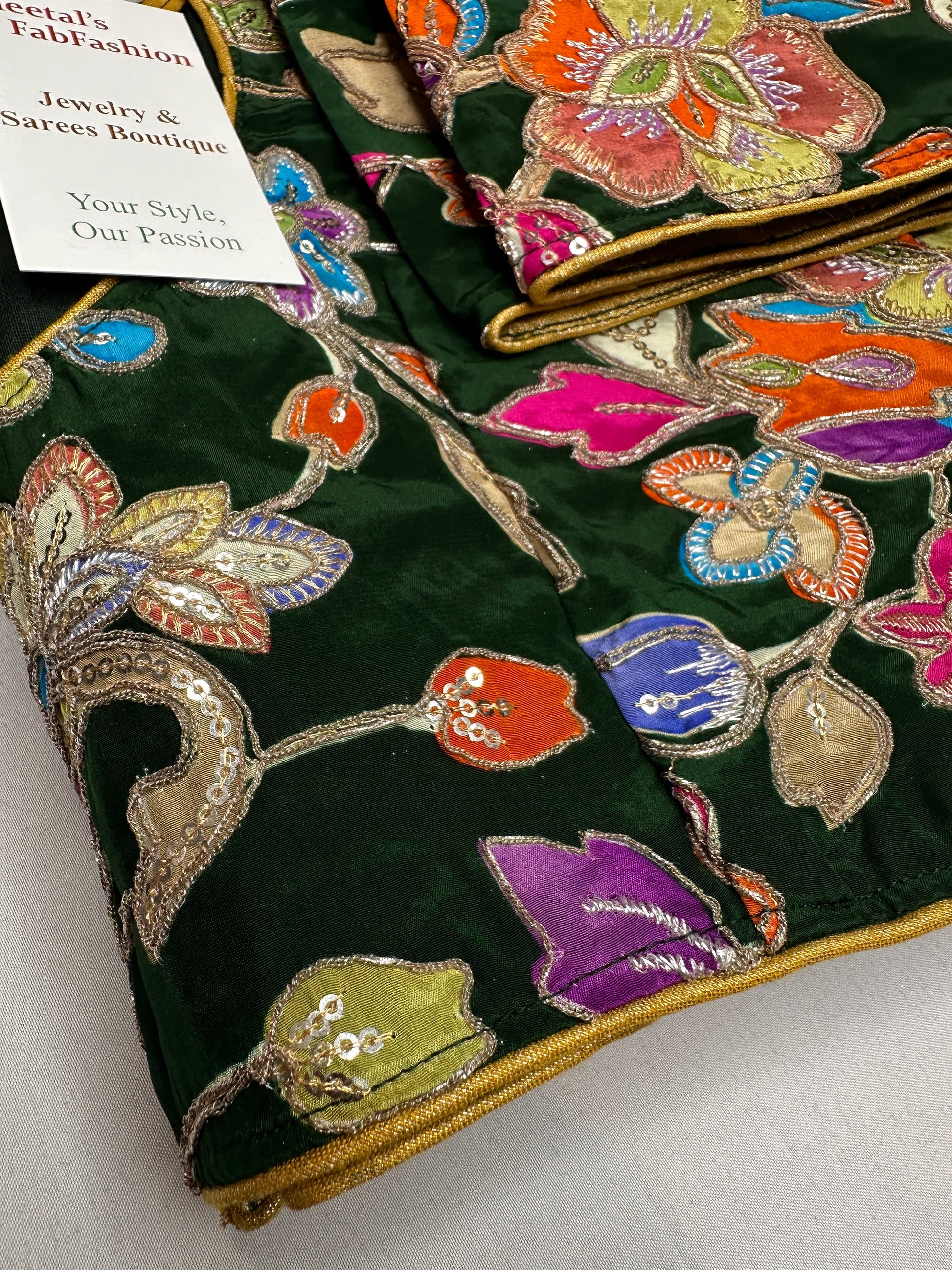 Green Sequence Embroidery Silk BlouseBlouse Details : Blouse Color : Green; Blouse stitched Size 40 and can be altered from 36 to 46, Sleeves Length : 9.5 Inches, blouse Length 14 Inches, FrontNeck : 6 Inches and Back Neck : 8.5 Inches;