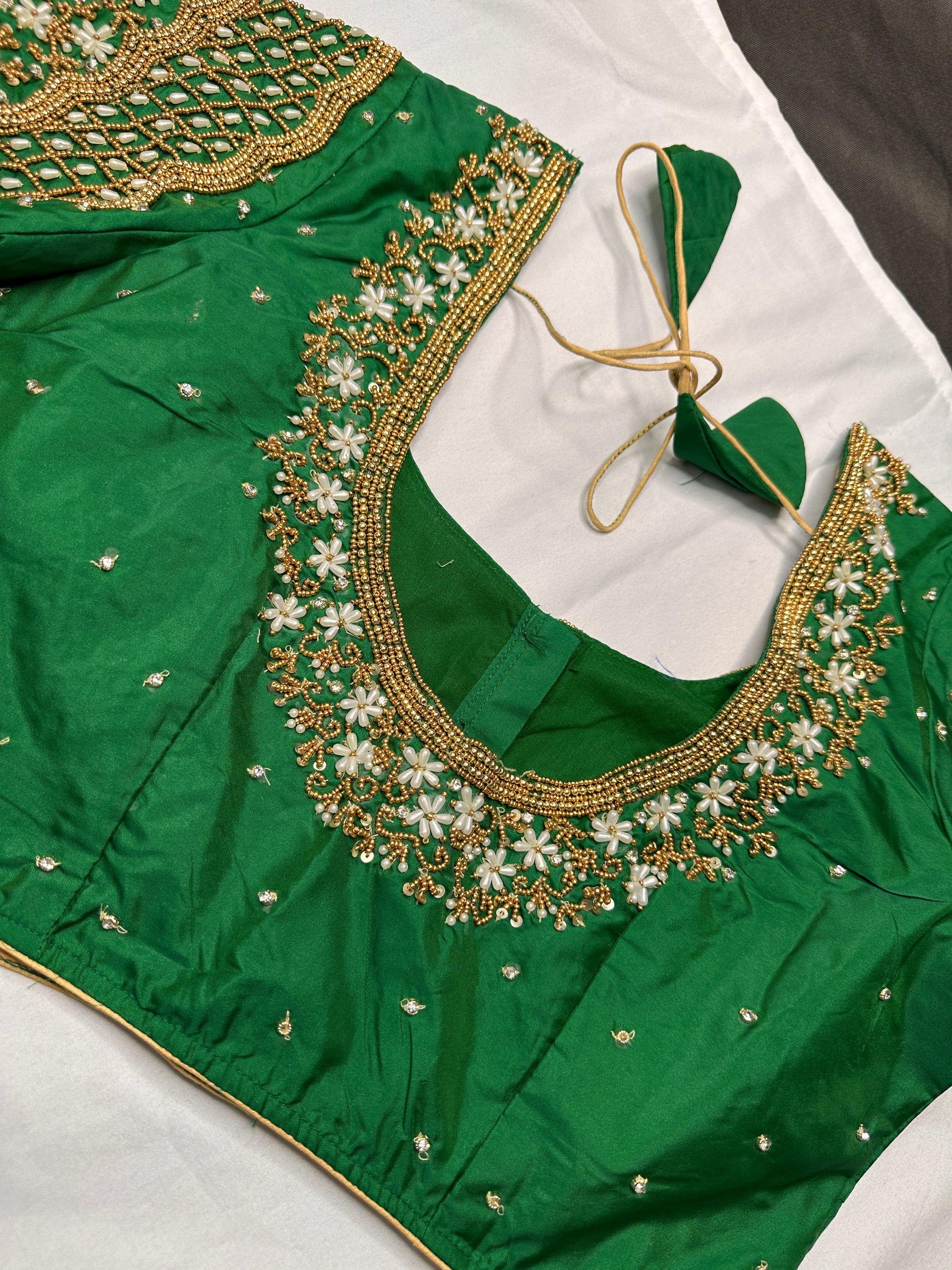 Blouse Details : Blouse Color : Green; Blouse stitched Size 38 and can be altered from 36 to 44, Sleeves Length : 10 Inches, blouse Length 114.5 Inches, FrontNeck : 7 Inches and Back Neck : 10 Inches;