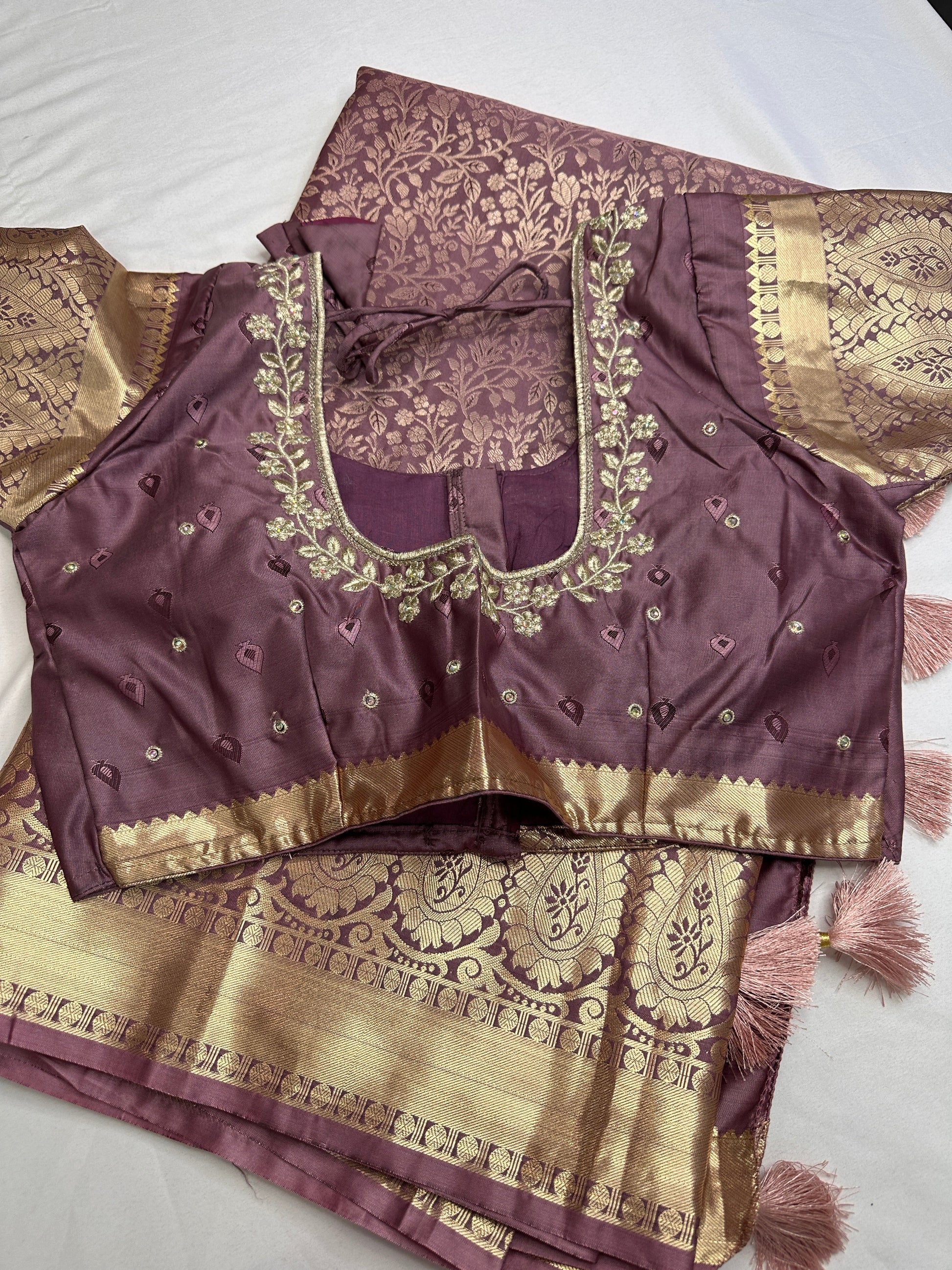 Blouse Details : Mauve Embroidery Work Blouse Size 38 and has margin to go up to Size 46; Sleeves Length : 11 Inches: Blouse Length : 15 Inches; Front Neck : 7 Inches; Back Neck : 8 Inches Inches