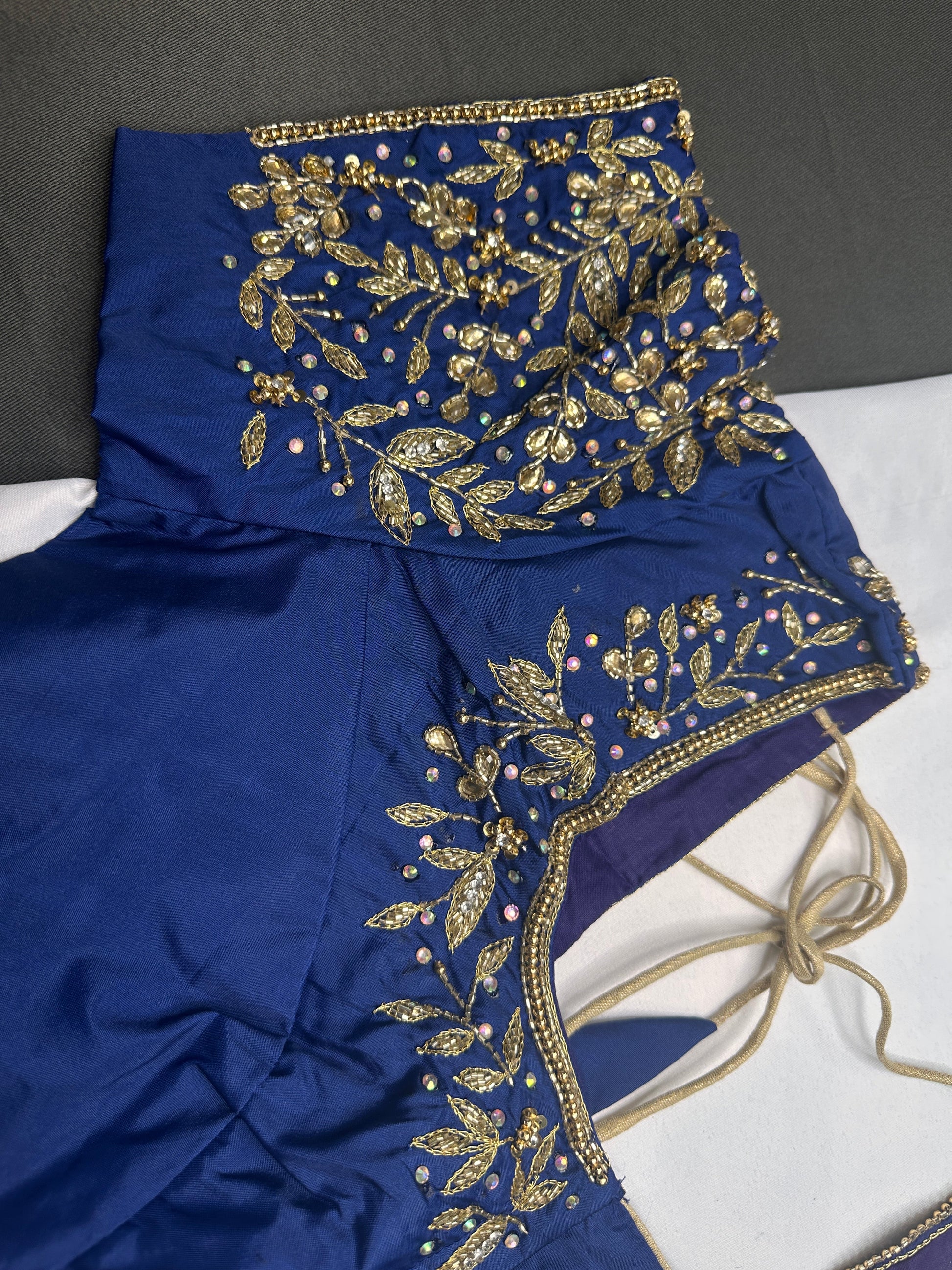 Kardana Maggam Blue BlouseBlouse Details : Blouse Color : Blue; Blouse stitched Size 38 and can be altered from 36 to 46, Sleeves Length : 6 Inches, blouse Length 14.5 Inches, FrontNeck : 7 Inches and Back Neck : 10 Inches;