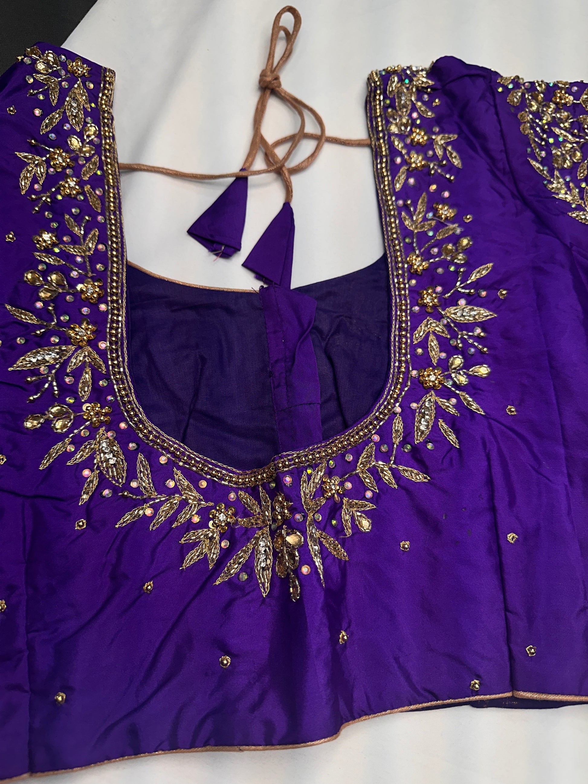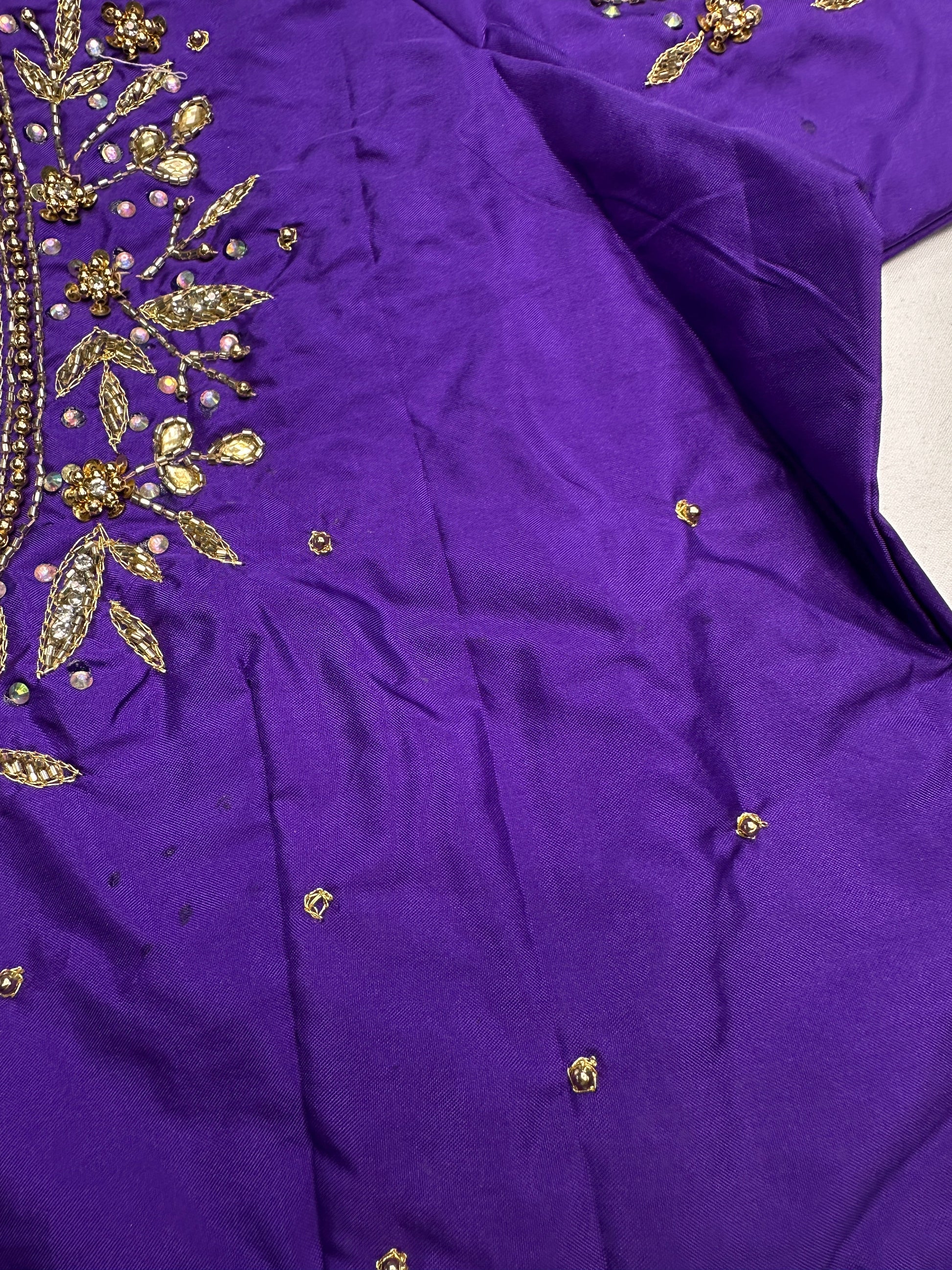 Kardana Maggam Purple BlouseBlouse Details : Blouse Color : Purple; Blouse stitched Size 40 and can be altered from 36 to 46, Sleeves Length : 6 Inches, blouse Length 14.5 Inches, FrontNeck : 7 Inches and Back Neck : 10 Inches;