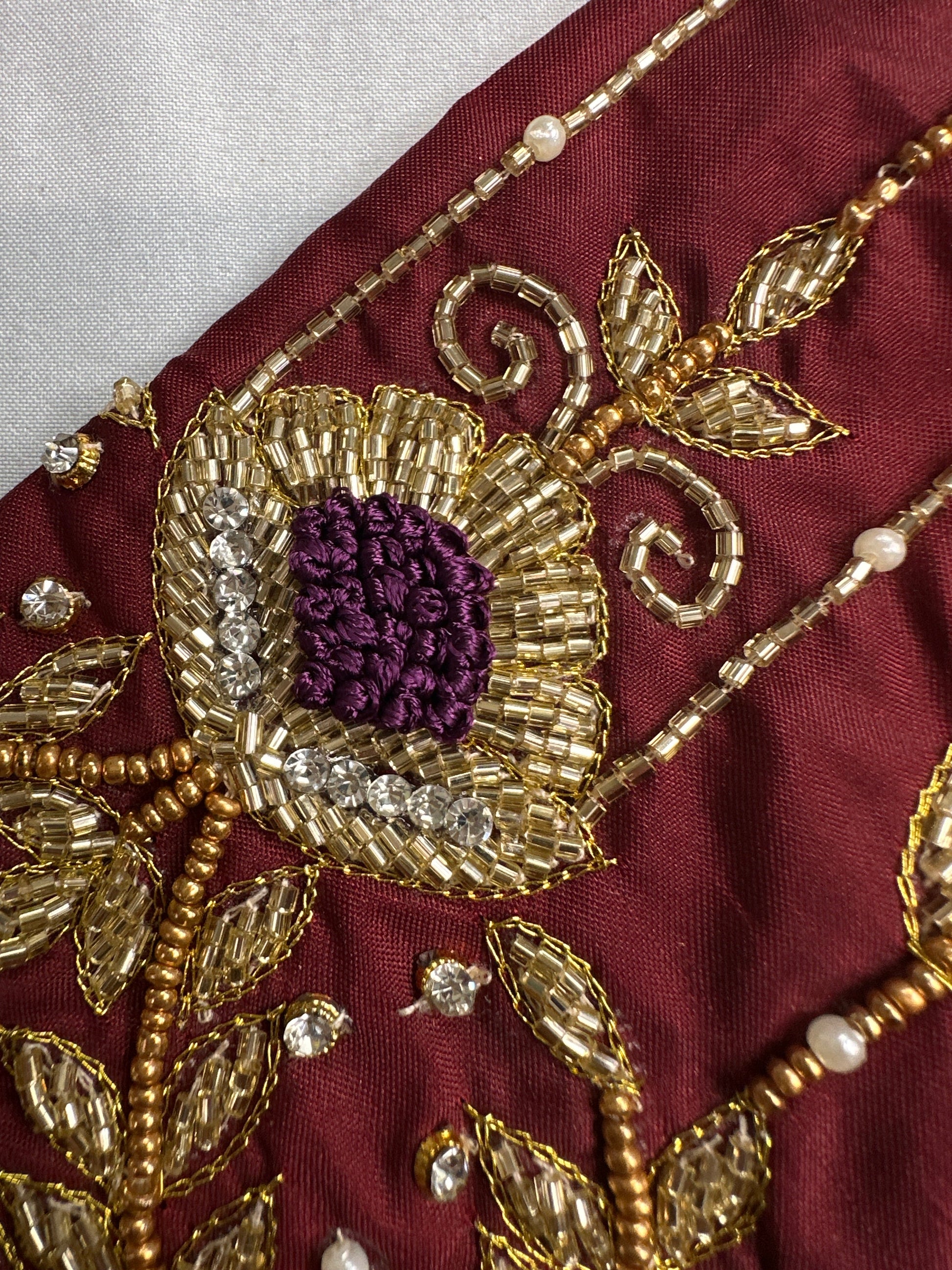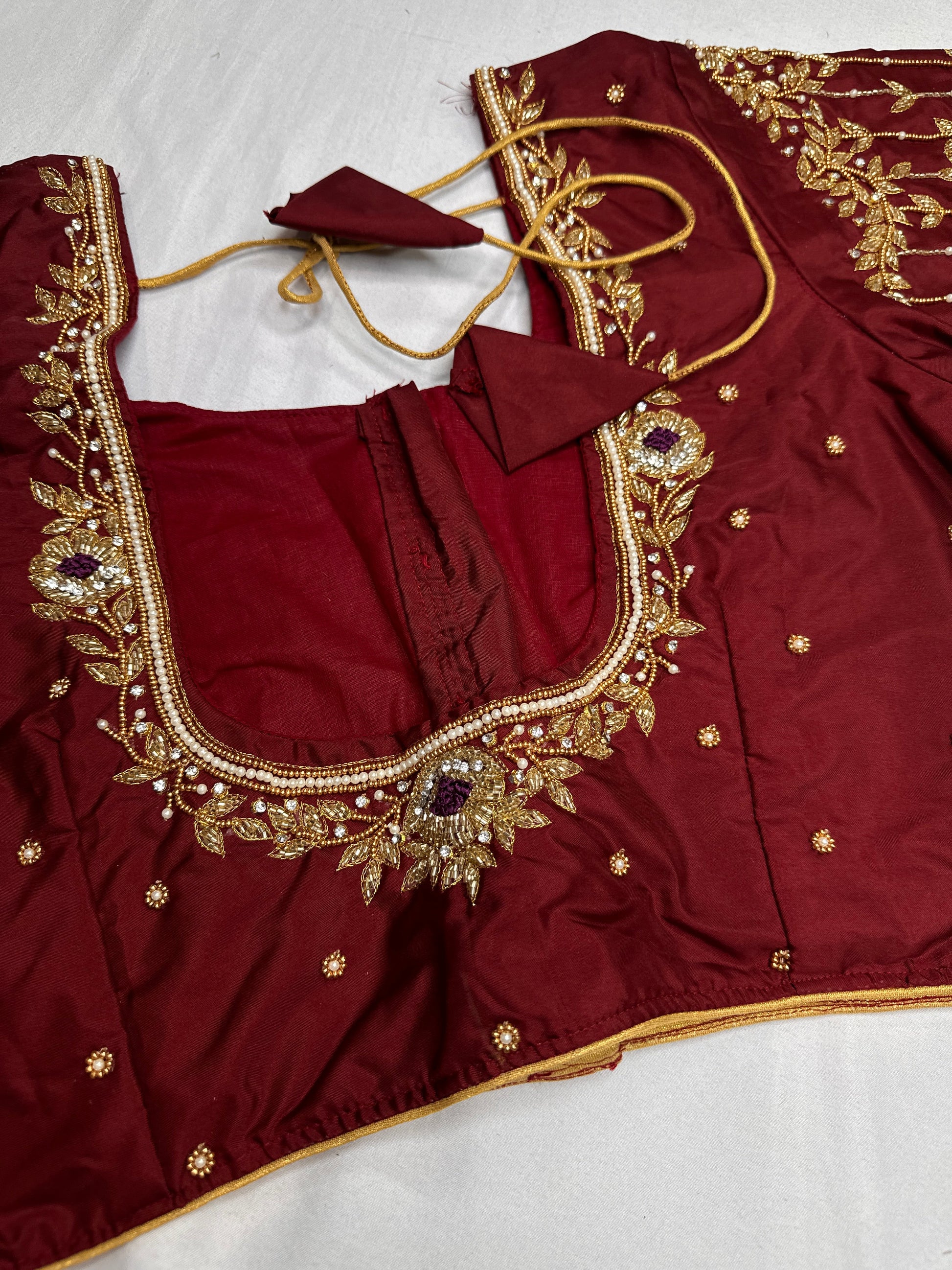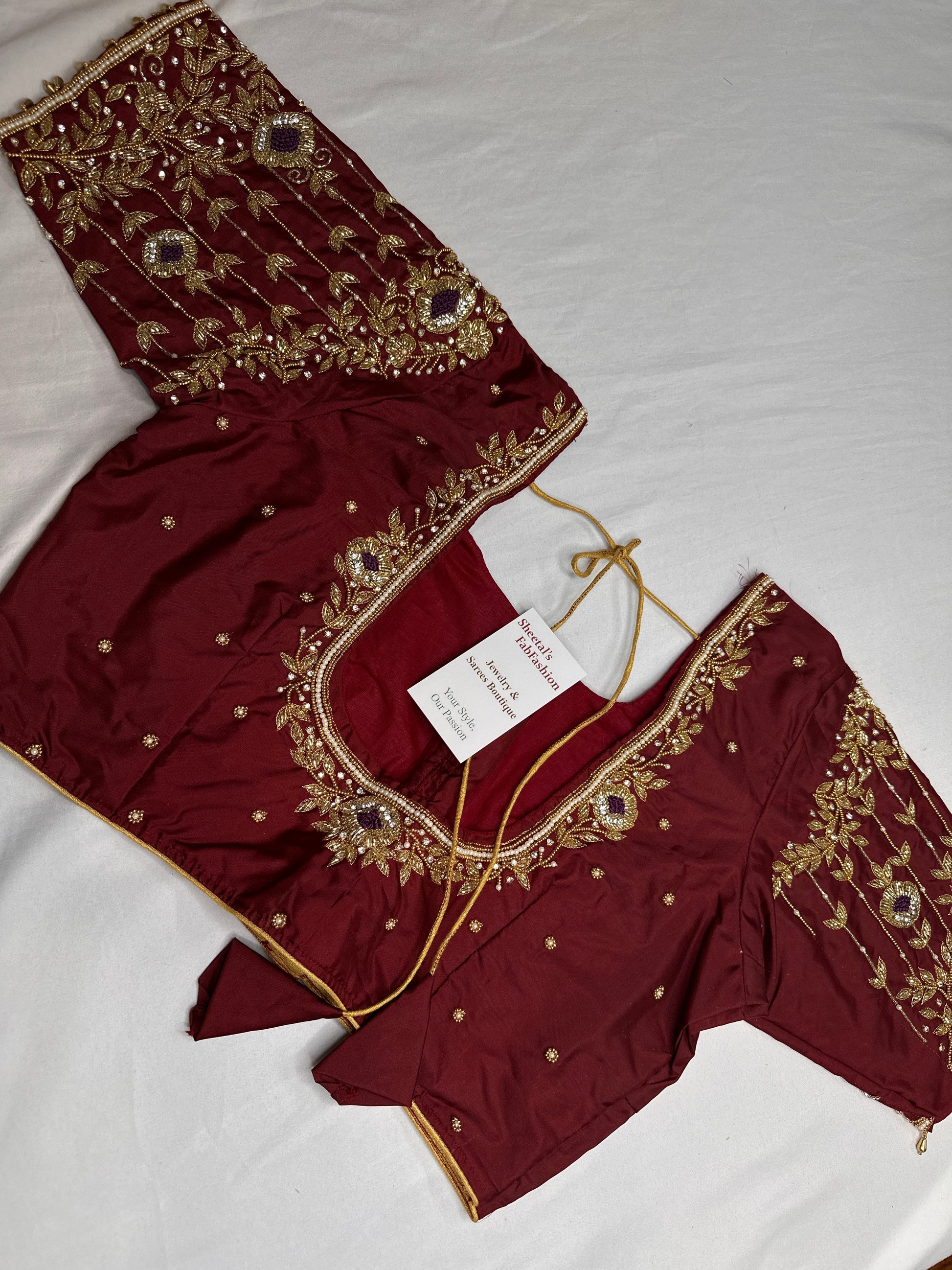Kardana Pattu Red Maggam BlouseBlouse Details : Blouse Color : Maroon; Blouse stitched Size 38 and can be altered from 36 to 44, Sleeves Length : 9.5 Inches, blouse Length 14.5 Inches, FrontNeck : 7 Inches and Back Neck : 10 Inches;