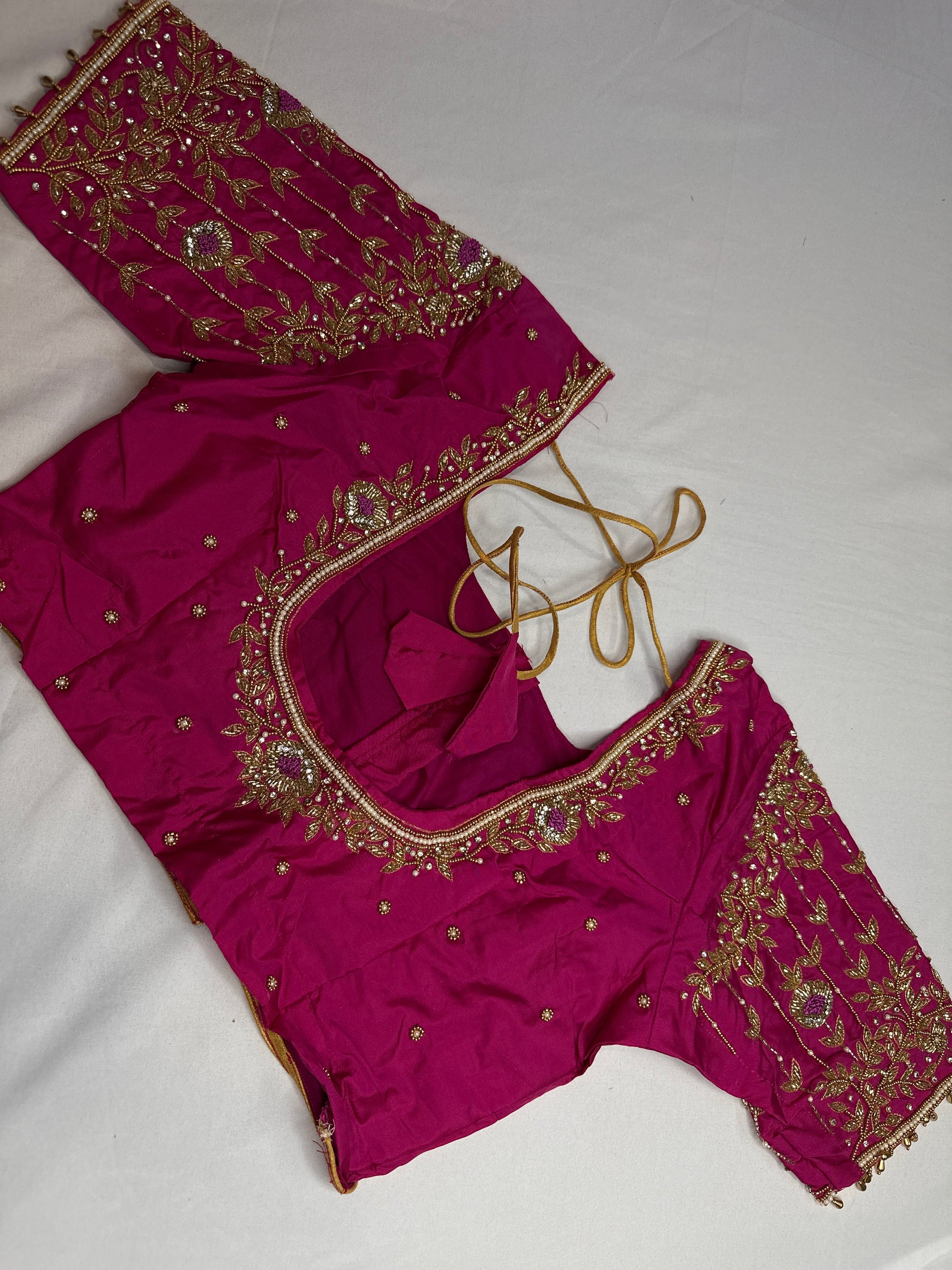 Kardana Pink Maggam BlouseBlouse Details : Blouse Color : Pink; Blouse stitched Size 38 and can be altered from 36 to 44, Sleeves Length : 10 Inches, blouse Length 14.5 Inches, FrontNeck : 7 Inches and Back Neck : 9.5 Inches;