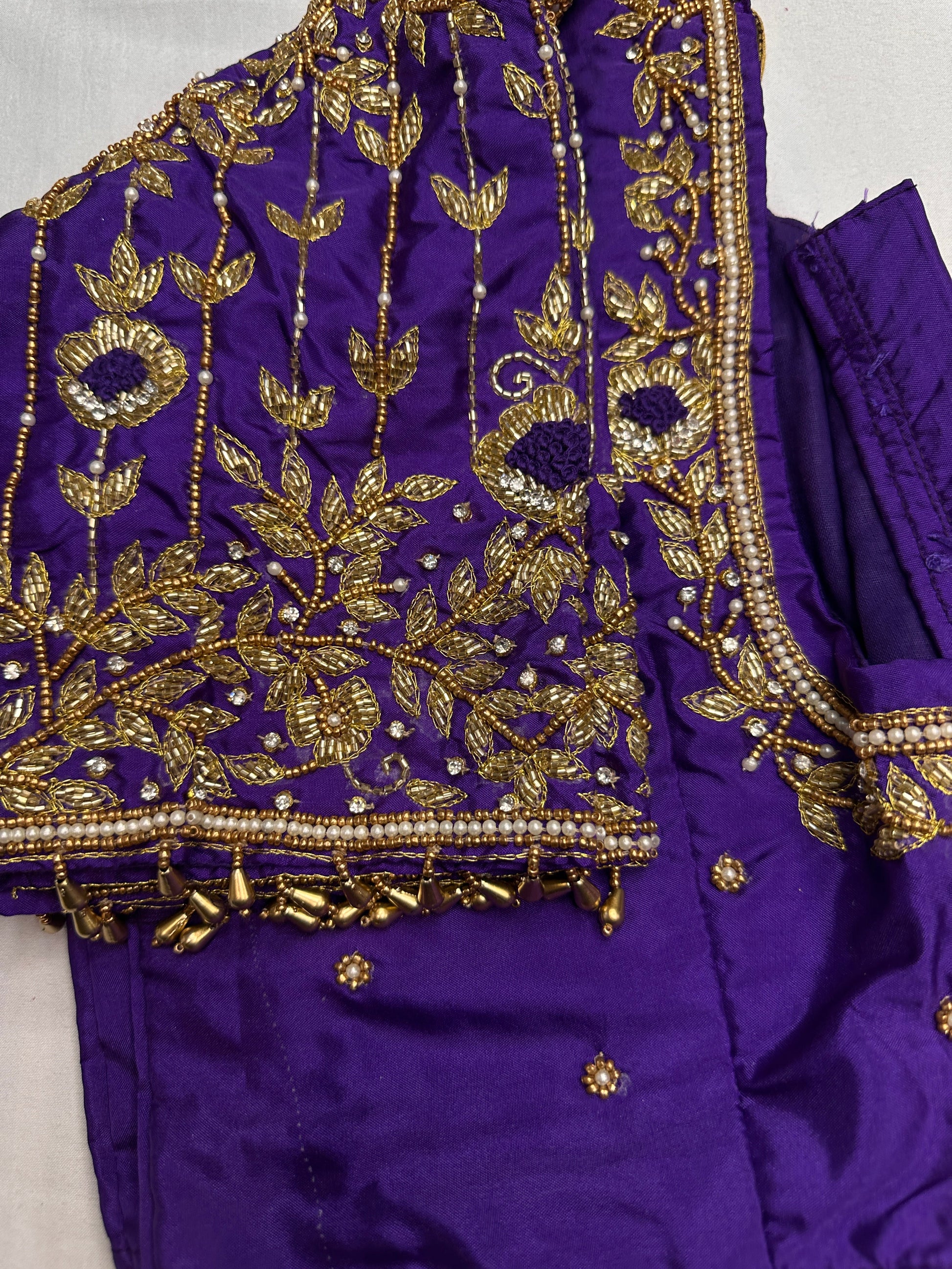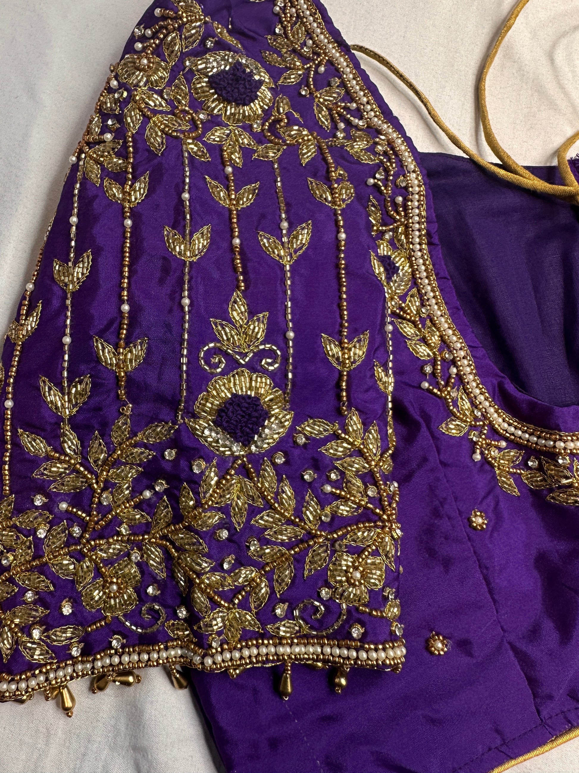 Blouse Details : Blouse Color : Purple; Blouse stitched Size 38 and can be altered from 36 to 44, Sleeves Length : 9 Inches, blouse Length 14.5 Inches, FrontNeck : 7 Inches and Back Neck : 9 Inches;