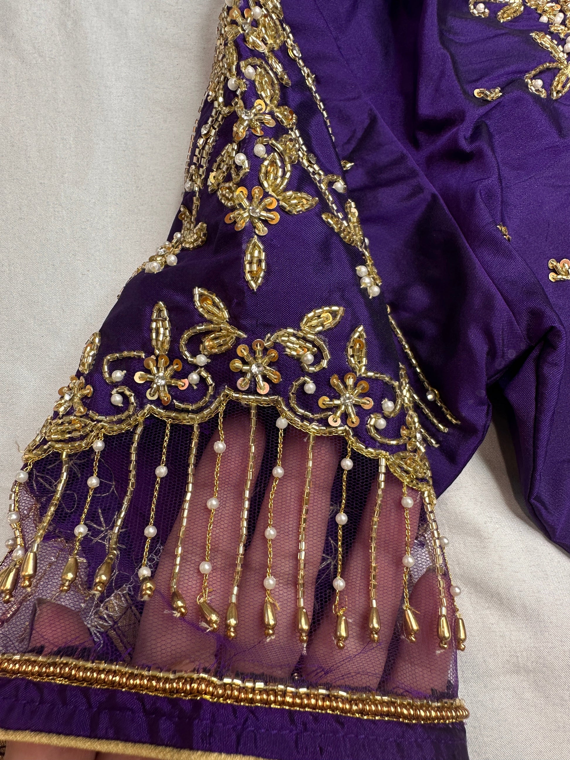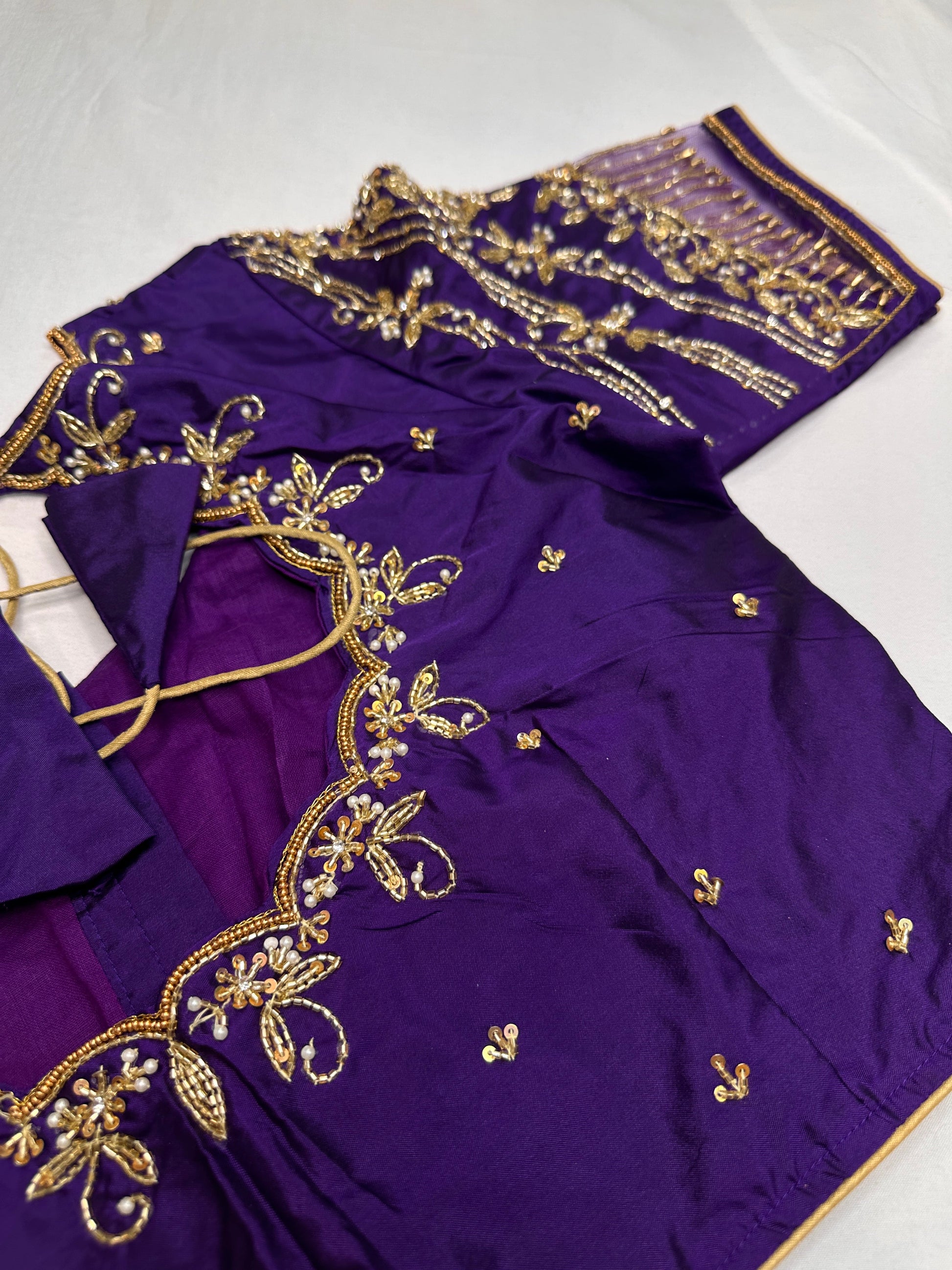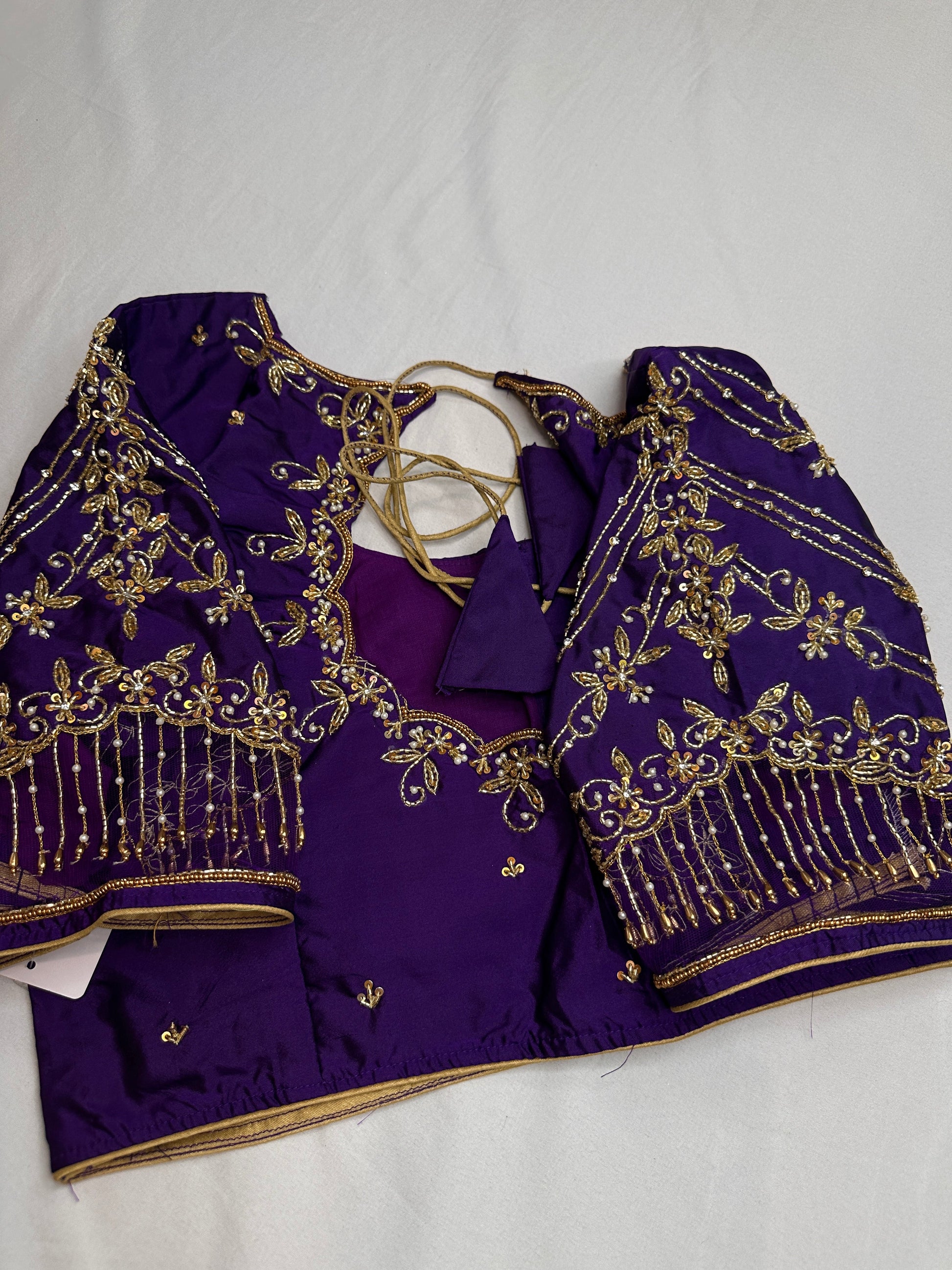 Blouse Details : Blouse Color : Purple; Blouse stitched Size 38 and can be altered from 36 to 44, Sleeves Length : 9 Inches, blouse Length 14.5 Inches, FrontNeck : 7 Inches and Back Neck : Pot Neck;