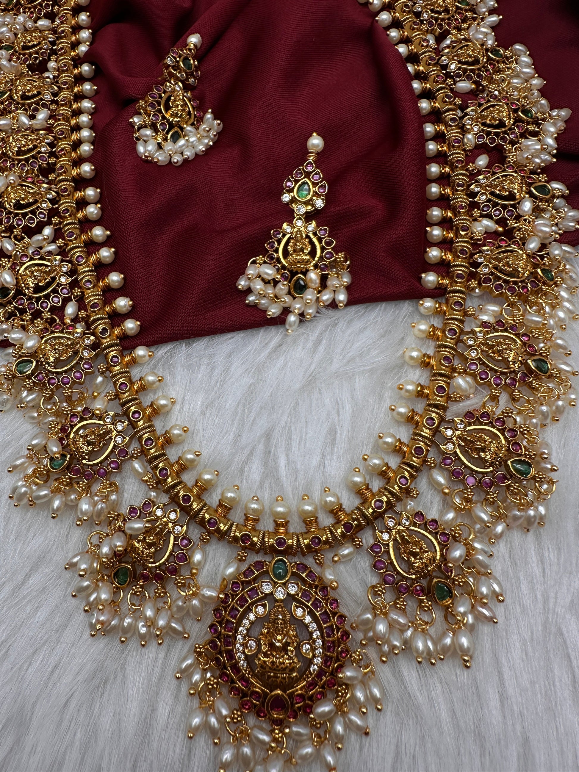 Kempu Goddess Lakshmi Rice Pearls Long Guttapusalu Necklace with matching earrings
