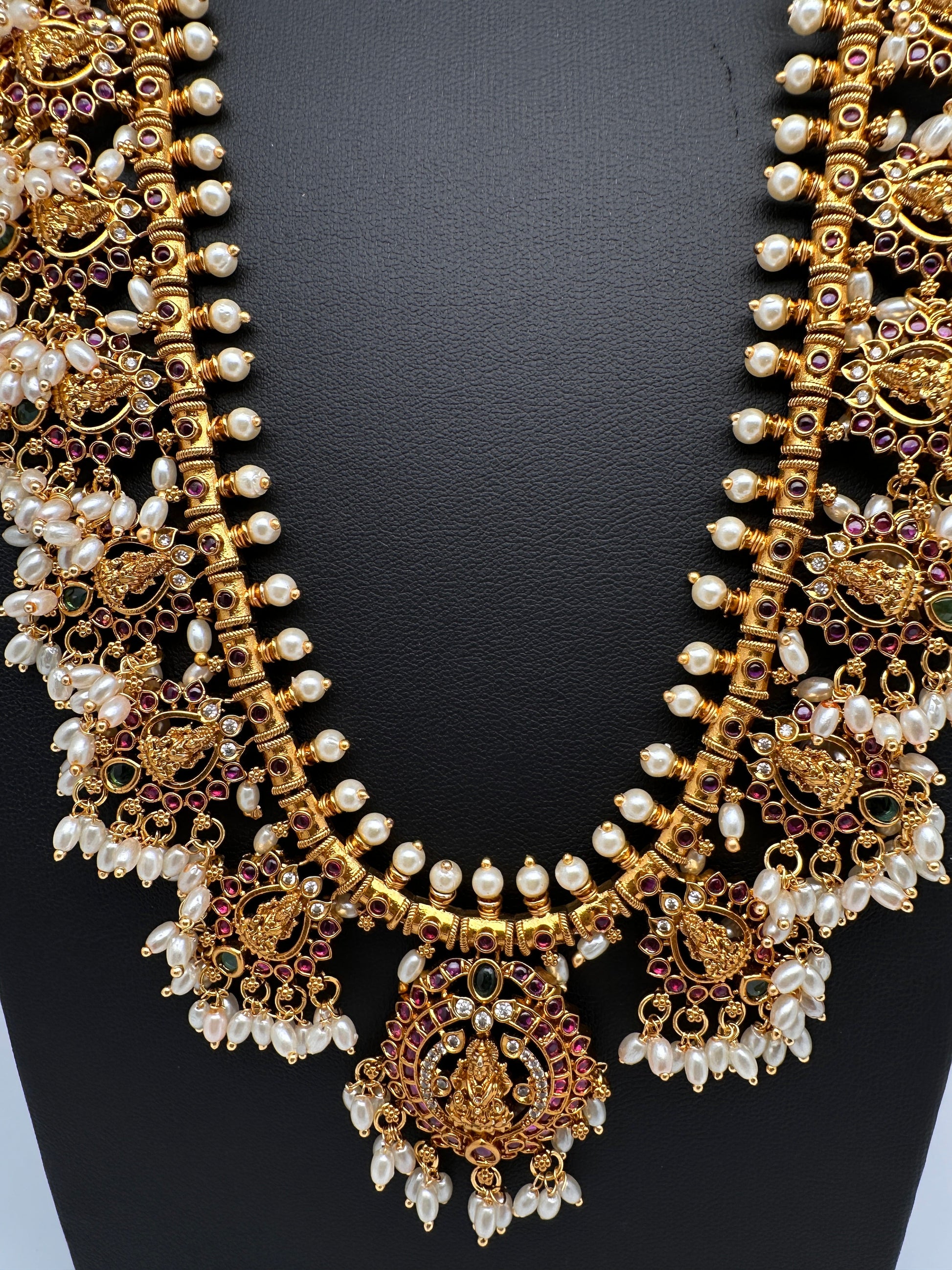 Kempu Goddess Lakshmi Rice Pearls Long Guttapusalu Necklace