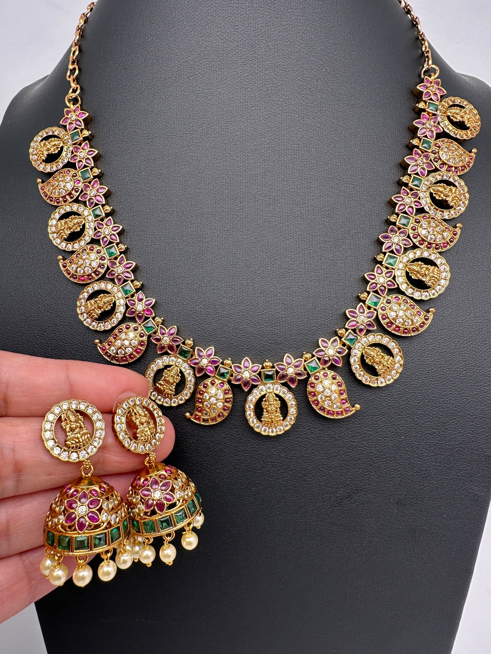 Kempu Mango Pattern Goddess Lakshmi Neckline Necklace with Jhumkis with Matching Jhumki