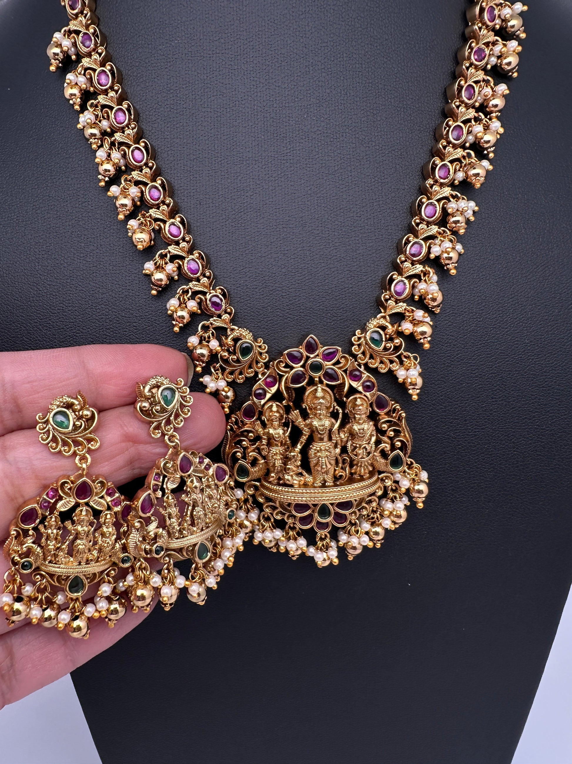 Kempu Matte Ram Parivar Short Necklace with Matching JhumkasColor : MatteSize : Necklace Length : 16 Inches; Earring Length : 2.25 Inches Approx; Stones : CZ Red Green Stone Gold Beads