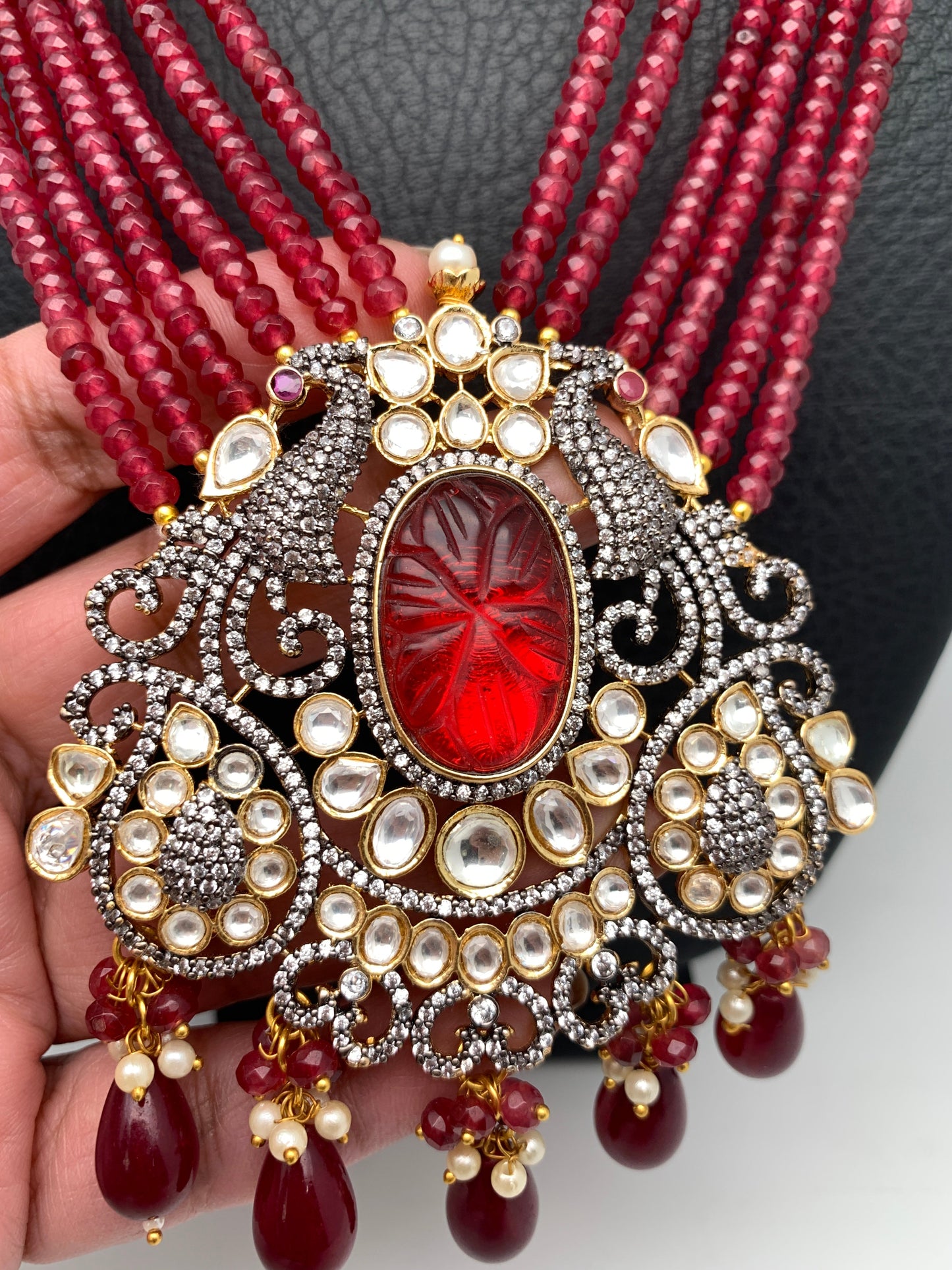 Kundan AD Victorian Dual Tone Pendent Pink Beads Mala
