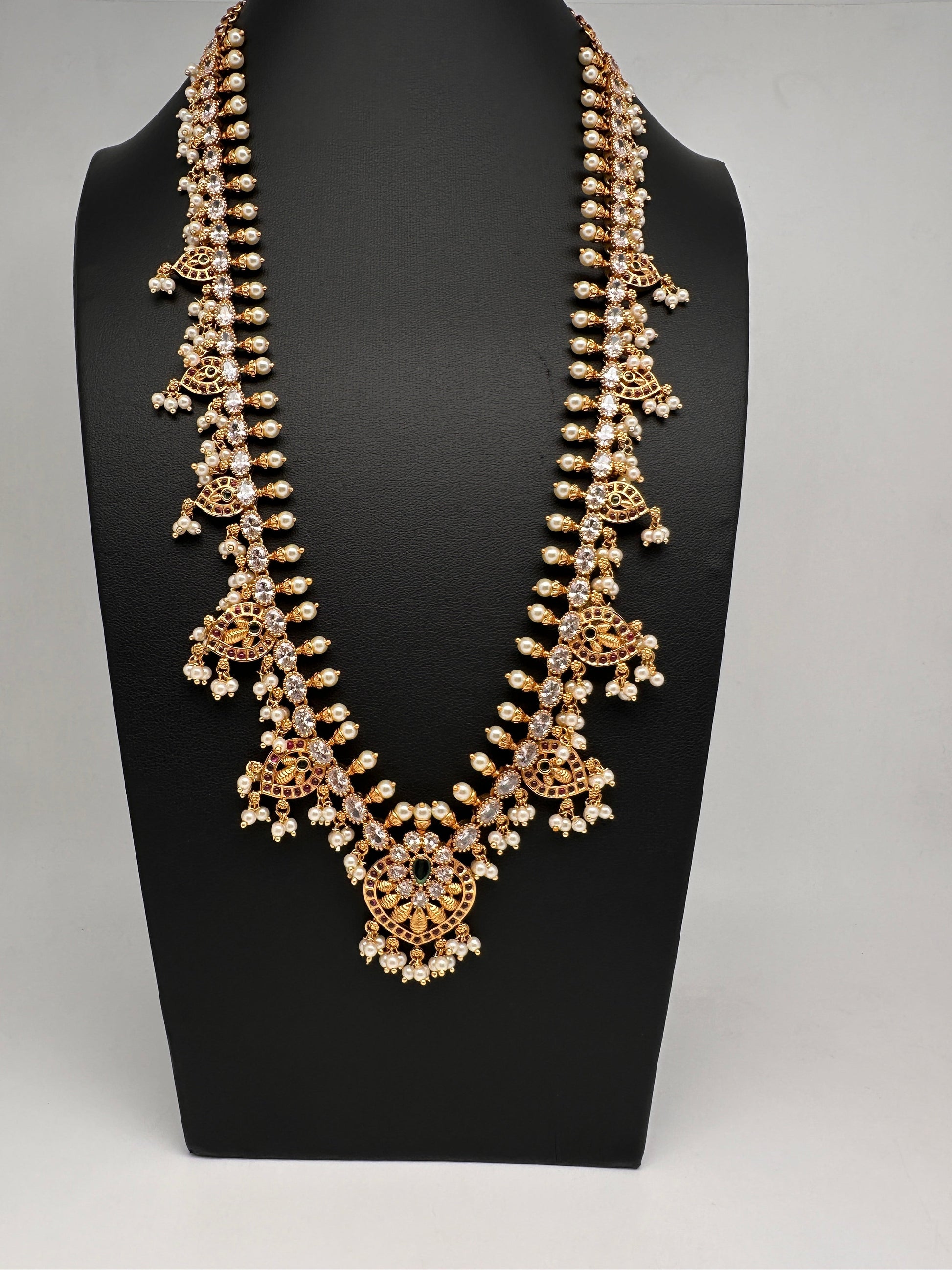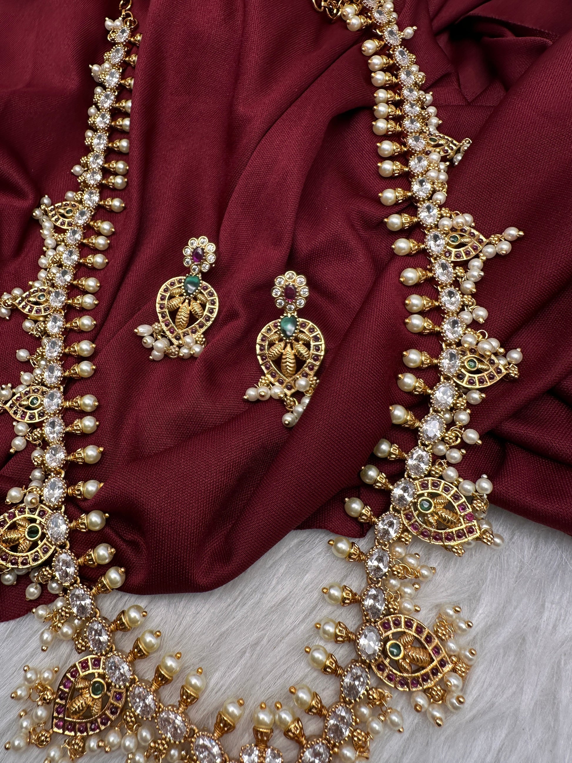 Matte CZ Guttapusalu Traditional Long Necklace with matching earringsColor : MatteSize : Necklace Length : 24 Inches; Earring Length : 1.5 Inches ApproxStones : Kemp Red Green Stones Pearls