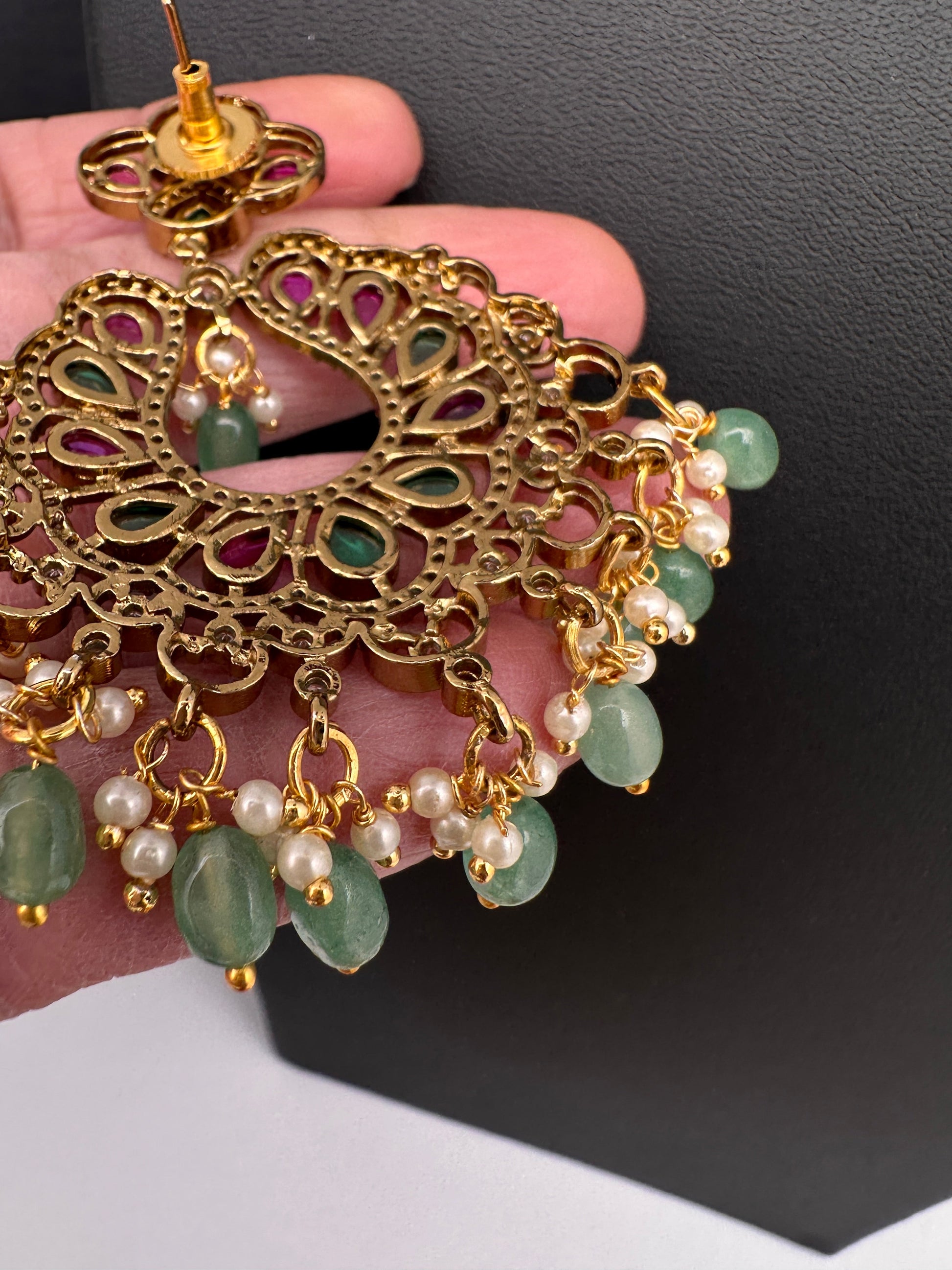 Matte CZ Kemp Chandbali With Green Beads pushback earrings