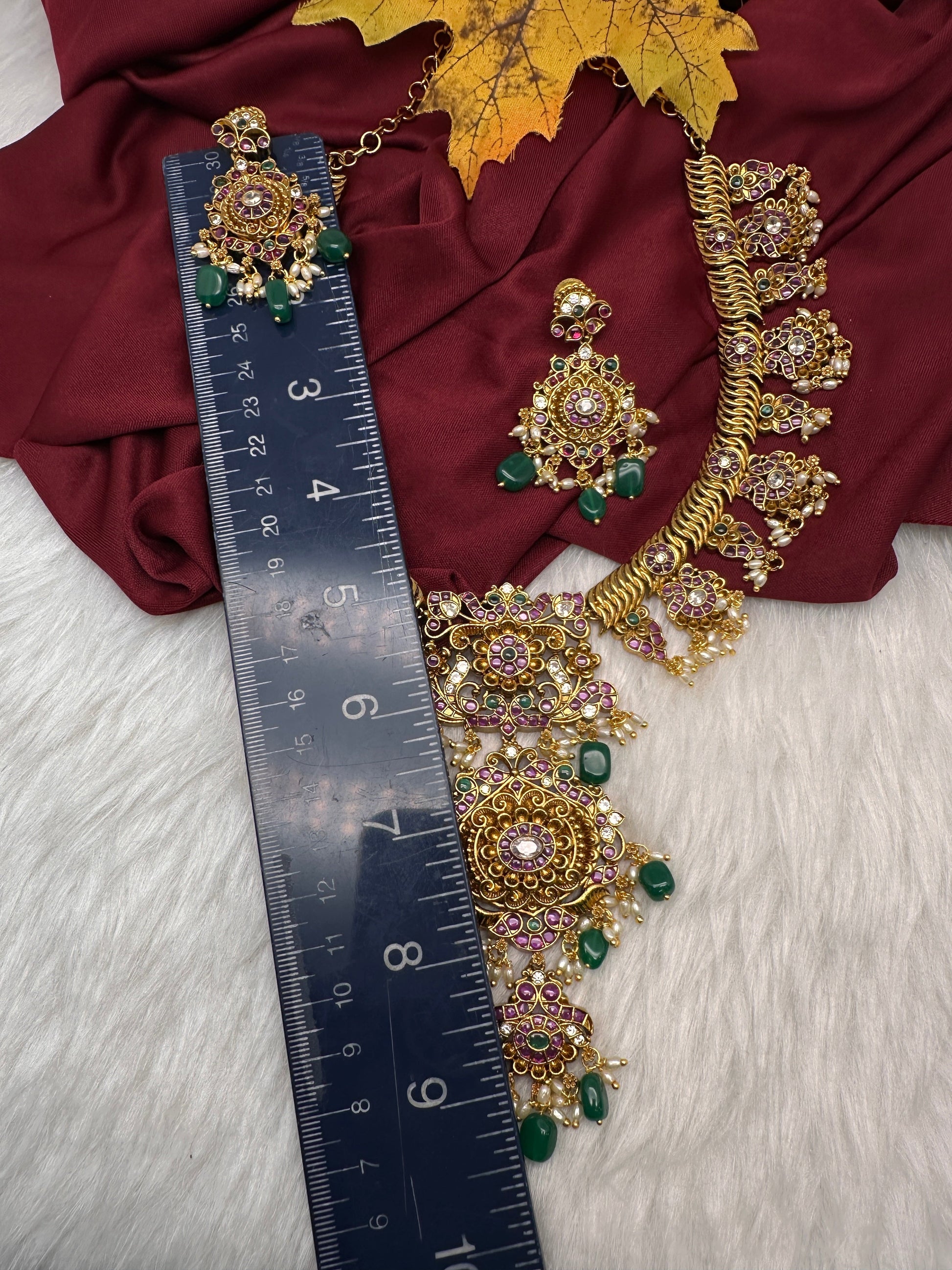 Matte Kemp Jalebi Short Necklace with Matching JhumkasColor : MatteSize : Necklace Length : 20 Inches; Earring Length : 2.25 Inches ApproxStones : Kemp Red Green Stones Green Beads Pearls