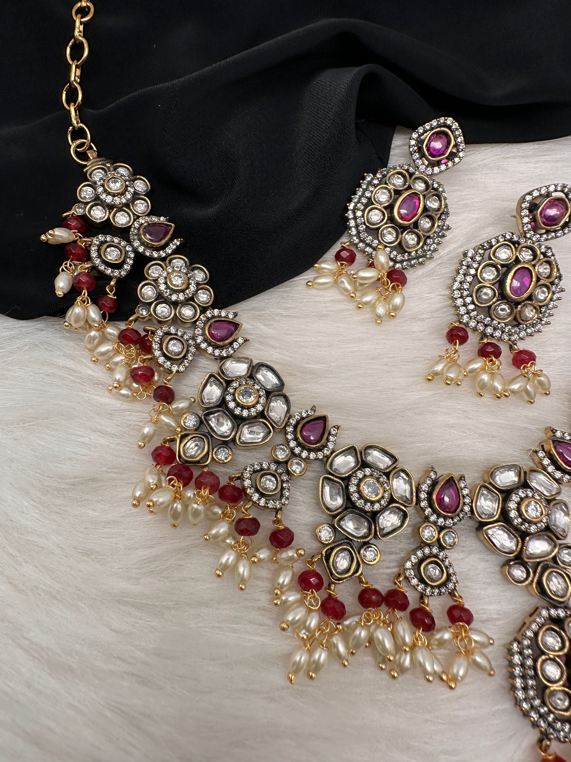 Moissanite Color Stone Neckline Guttapusallu Necklace with Matching EarringsColor : Victorian MehndiSize : Necklace Length : 14 Inches; Earrings Length : 1.75 InchesStones : AD --Color-- Stone --Color