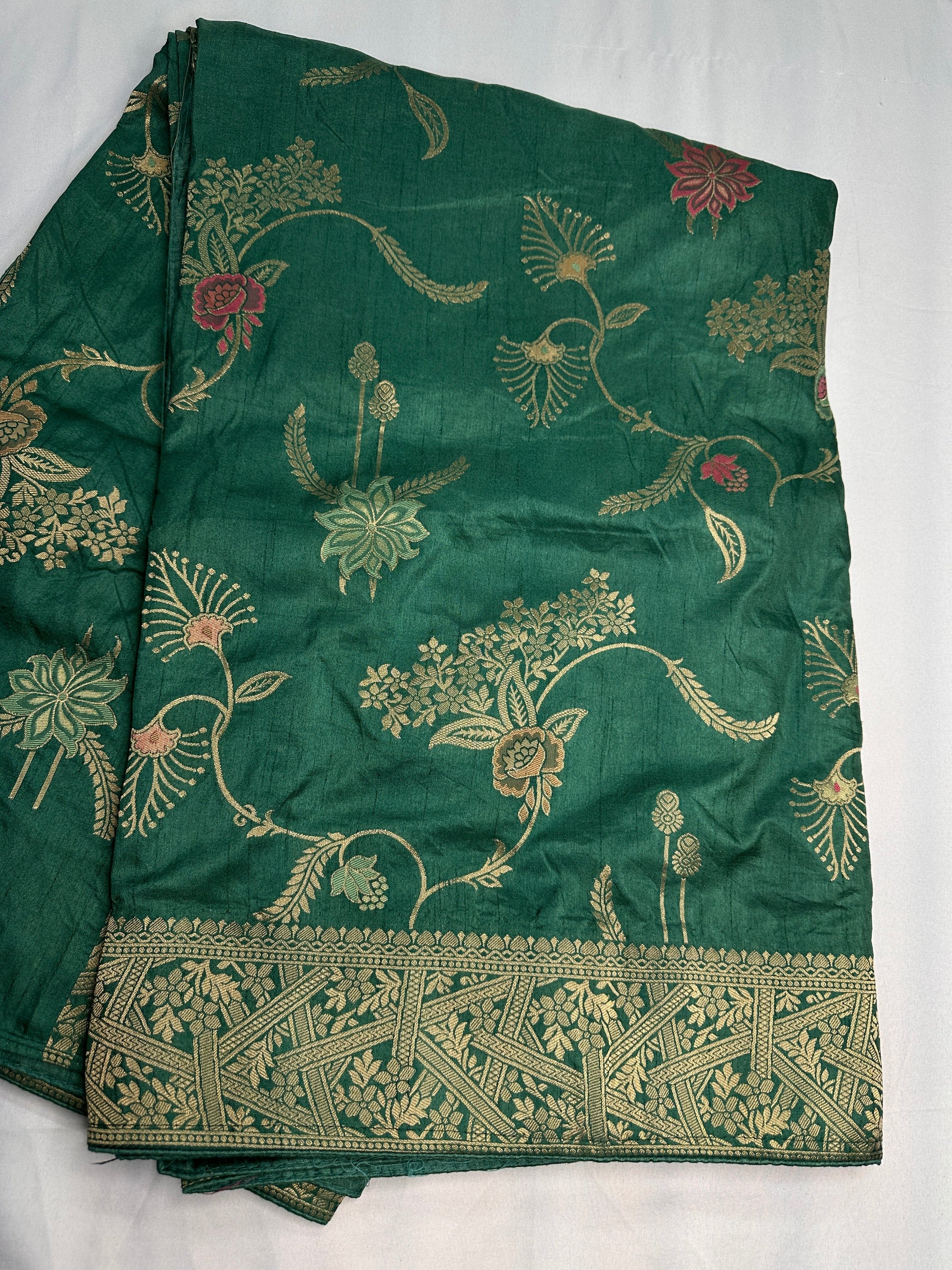 Munga Silk Green Saree Saree Details : Green Color Zari Pallu Fall and Pico done Blouse Details : Green Blouse Size 38 and has margin to go up to Size 44; Sleeves Length : 10 Inches: Blouse Length : 15 Inches; Front Neck : 7.5 Inches; Back Neck : 9.5 Inches Inches