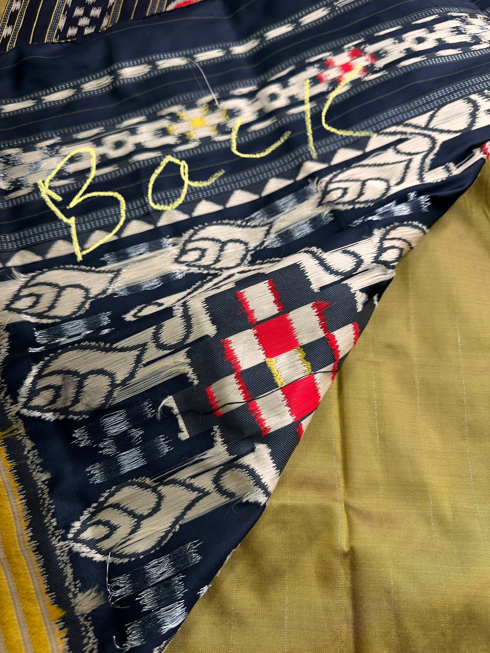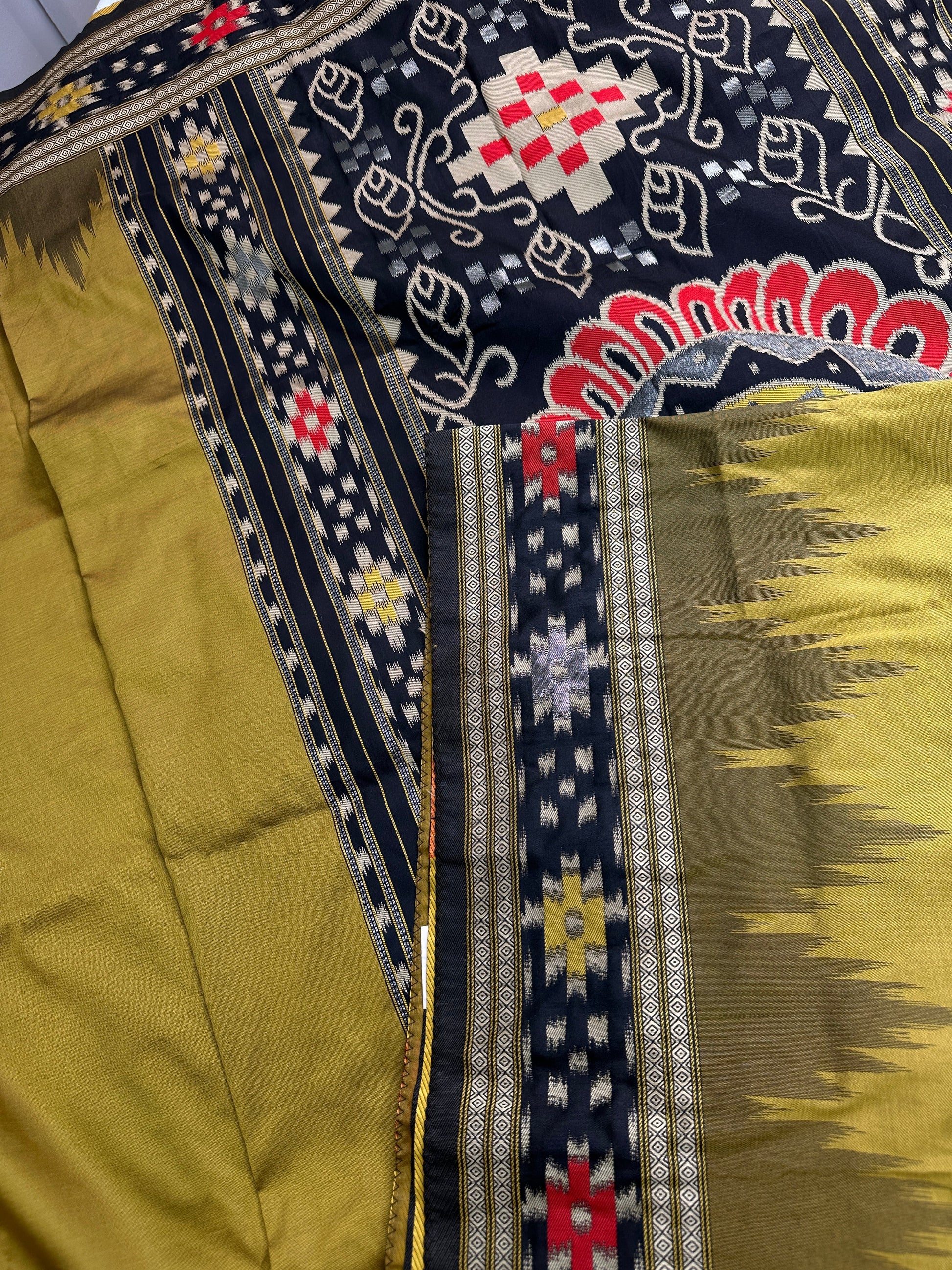 Patola Green Black Silk Saree Saree Details : Green Color Saree with Black Weaving Fall and Pico done Blouse Details : Black Blouse Size 38 and has margin to go up to Size 46; Sleeves Length : 9 Inches: Blouse Length : 15 Inches; Front Neck : 8 Inches; Back Neck : 10 Inches Inches