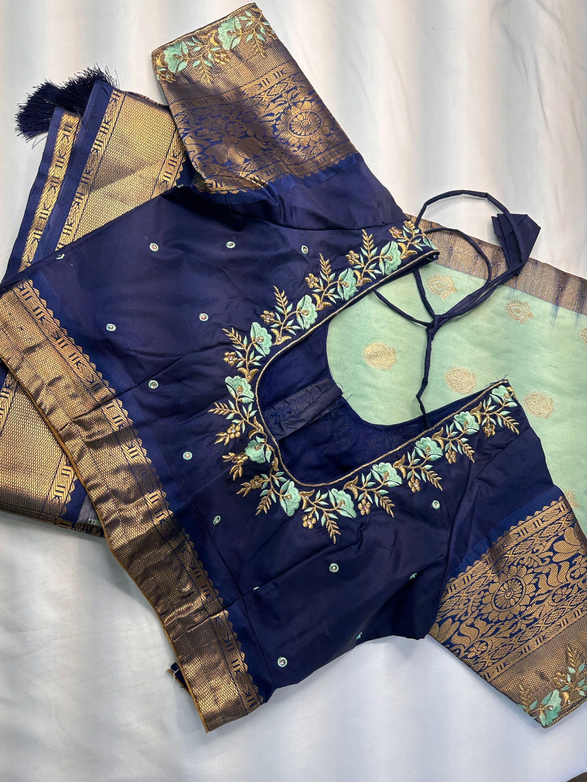 Blouse Details : Blue Embroidery Blouse Size 38 and has margin to go up to Size 46; Sleeves Length : 11 Inches: Blouse Length : 15 Inches; Front Neck : 7 Inches; Back Neck : 8 Inches Inches