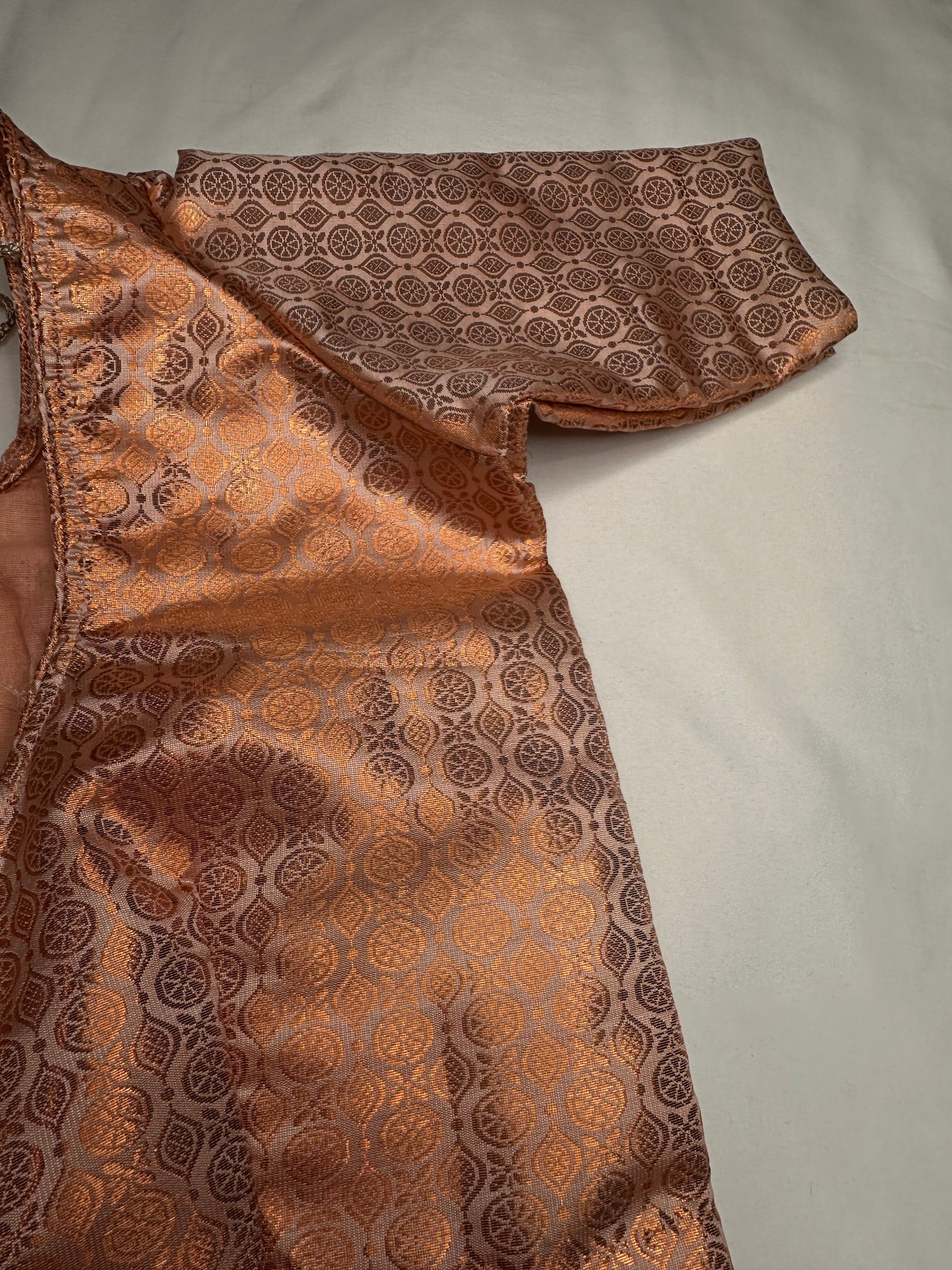 Peach Champhange BlouseBlouse Details : Blouse Color : Peach; Blouse stitched Size 38 and has margin to open up to size 42, Sleeves Length : 10 Inches, blouse Length 14.5 Inches, FrontNeck : 8.5 Inches and Back Neck : 7 Inches;