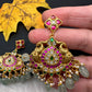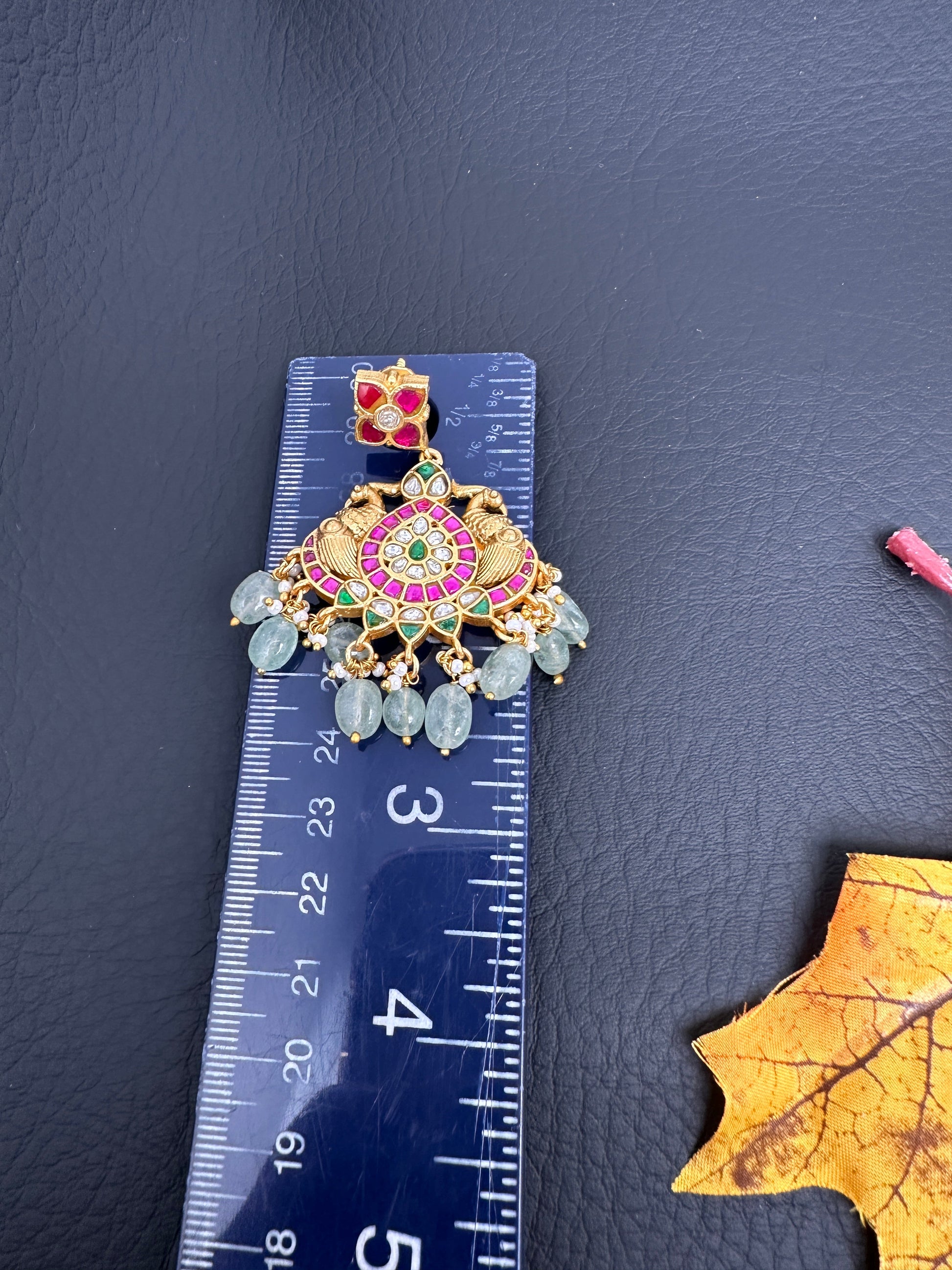 Peacock Jadau Kundan Earrings screwback earringsColor : GoldenSize : Length : 2.5 Inches; Weight : 18 grams eachStones : Red Green Jadau Kundan Pearls Green Emerald Beads