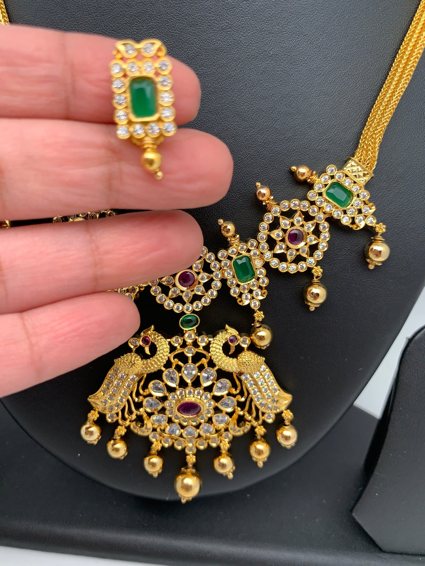 Peacock Red Green Stone Pearls Short Necklace with Matching StudsColor : GoldenSize : Necklace Length : 16 Inches; Earring Length : 1 InchesStones : Red Green Stone CZ